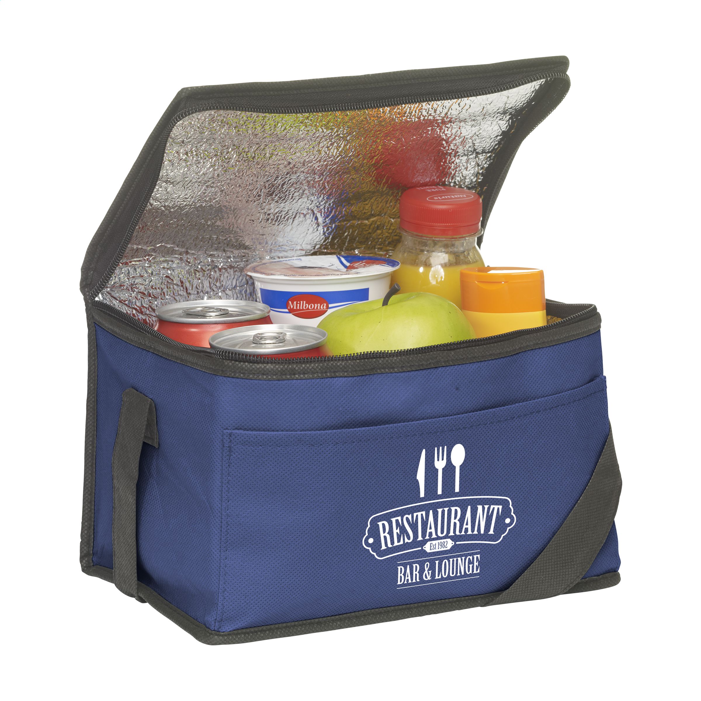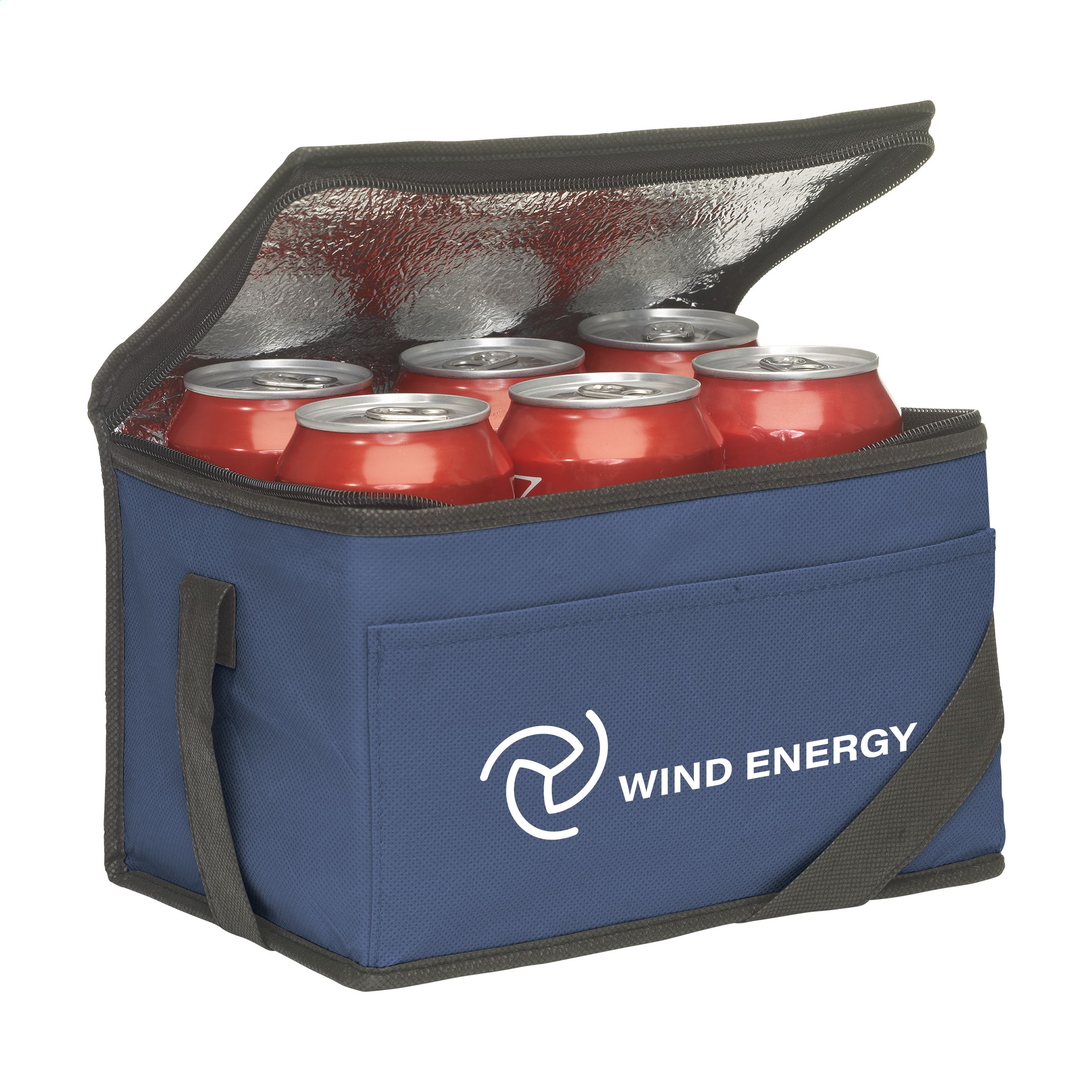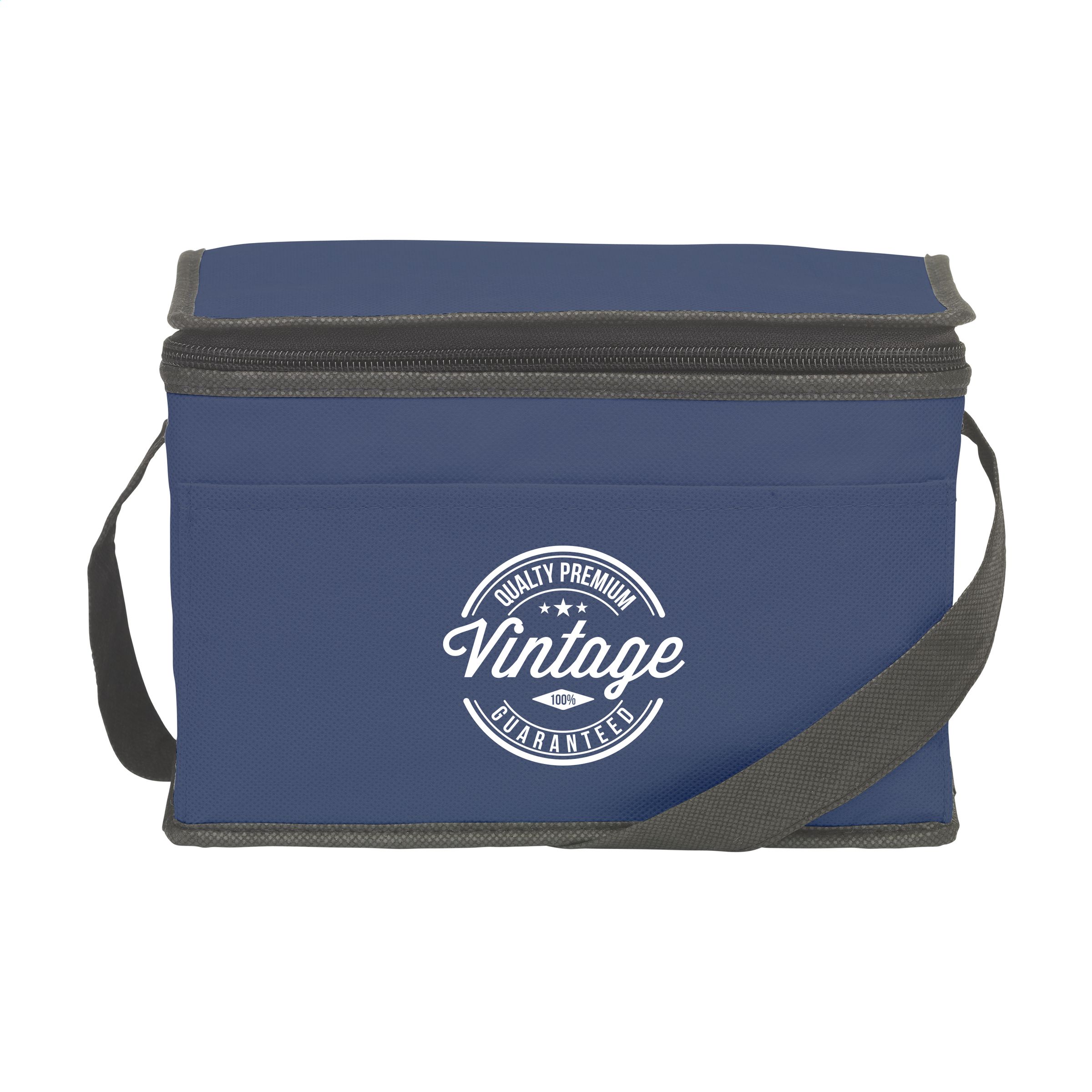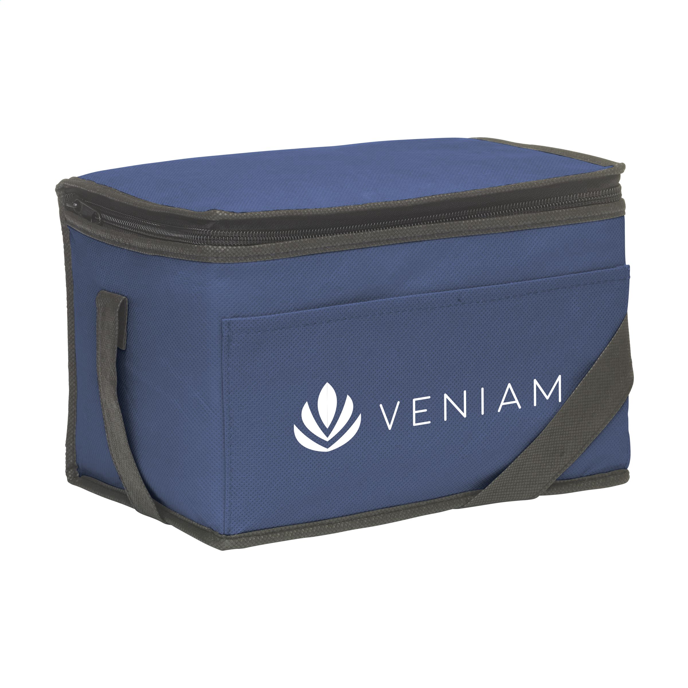 Cooler bag made of non-woven fabric (80 g/m²) suitable for 6 cans of drinks or food. With strap.