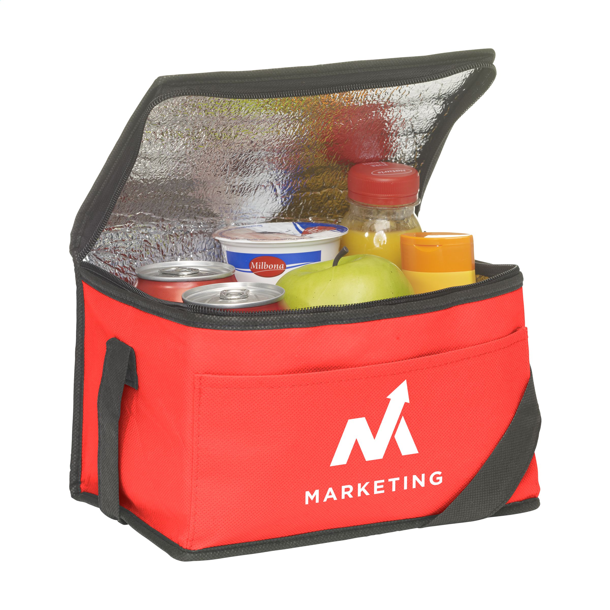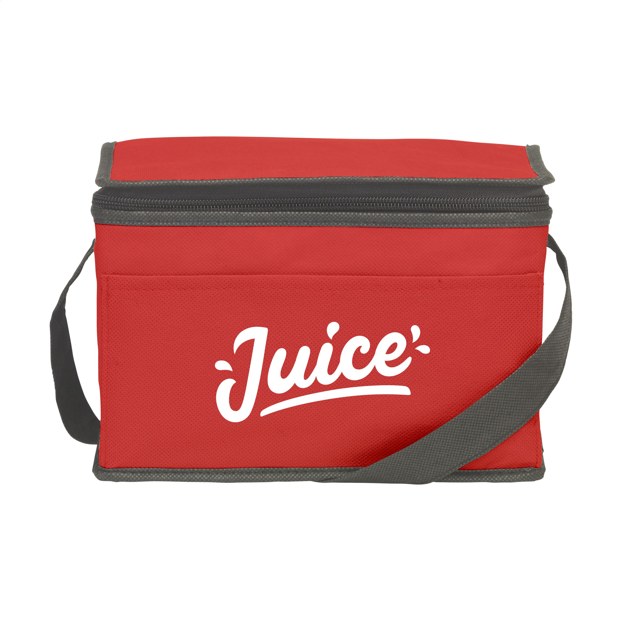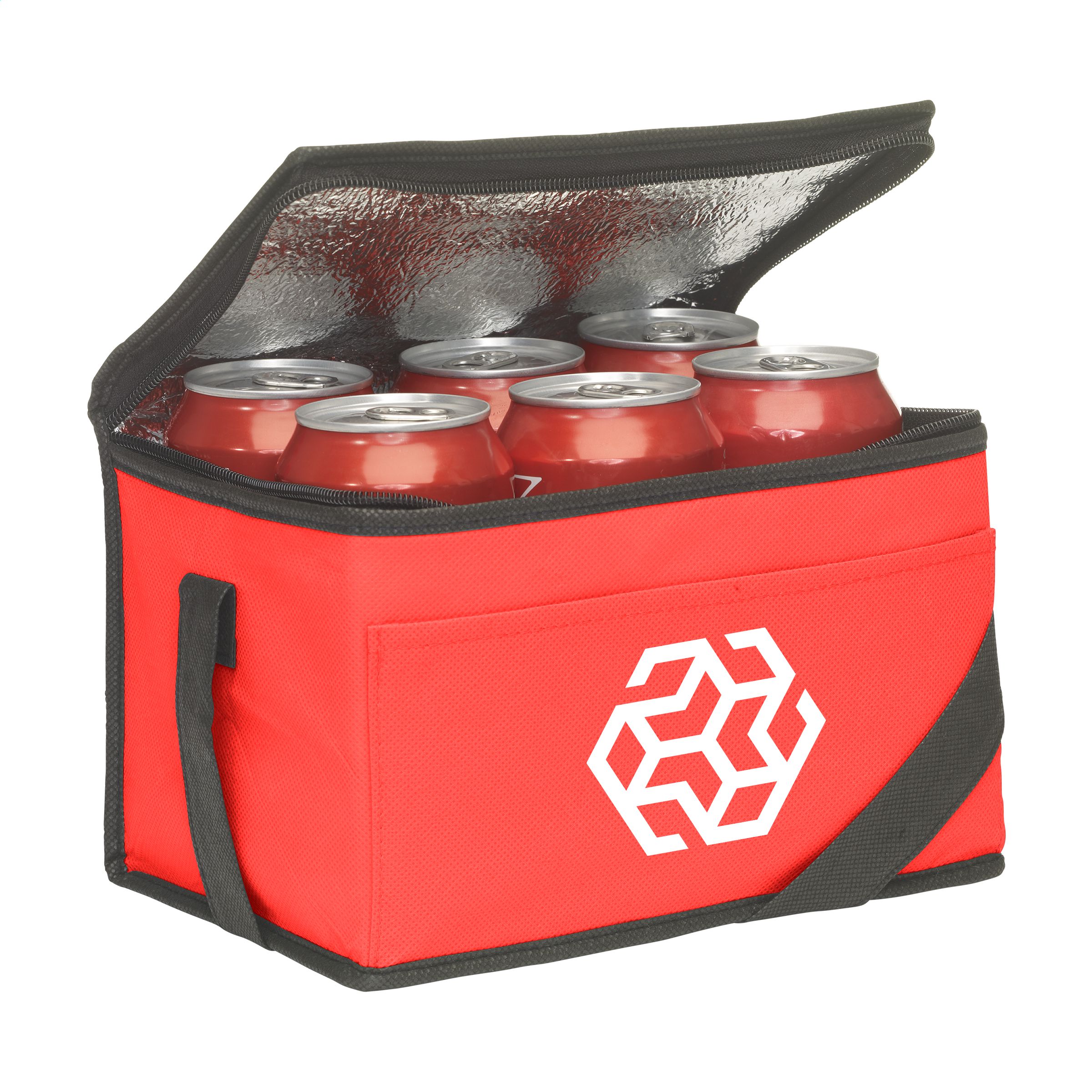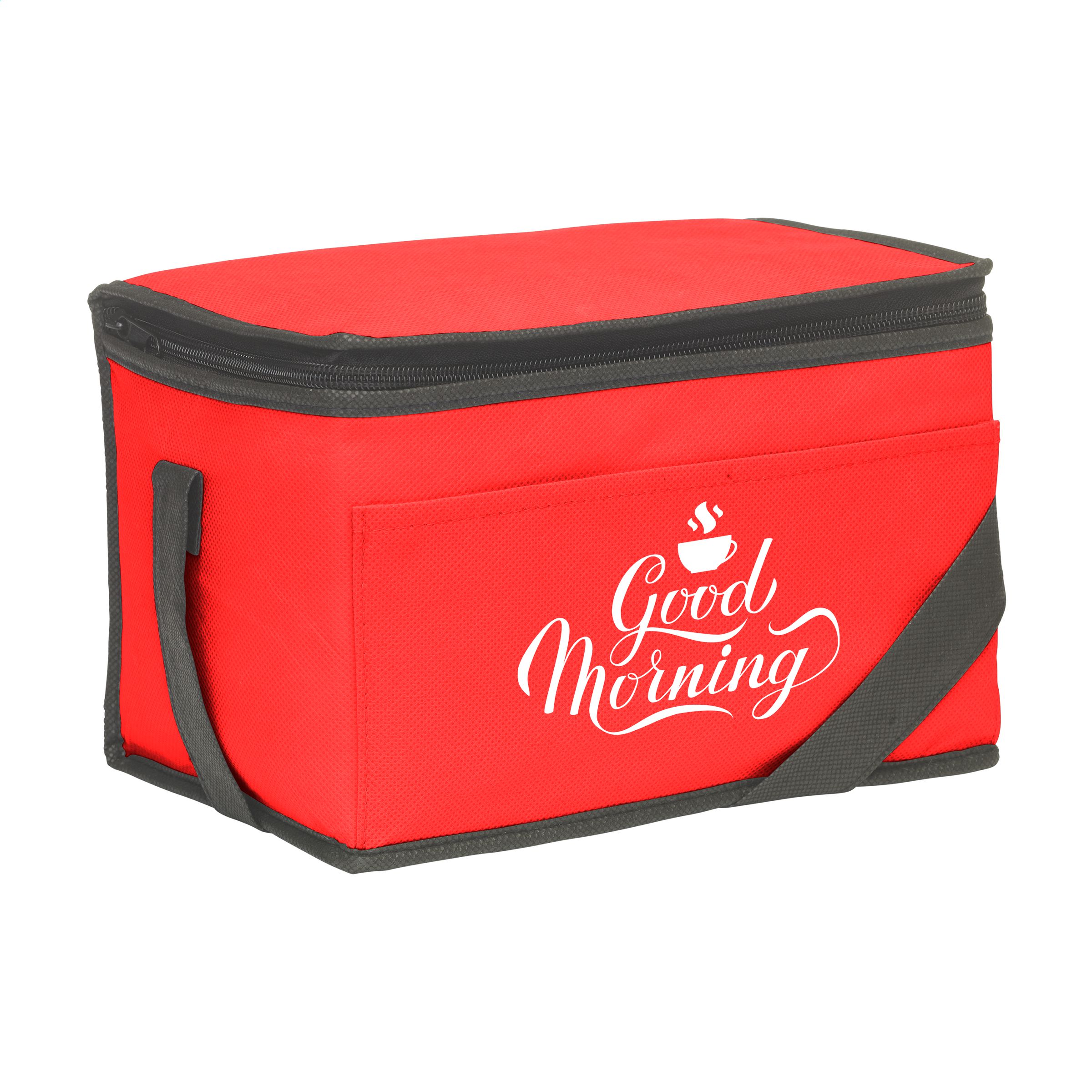 Cooler bag made of non-woven fabric (80 g/m²) suitable for 6 cans of drinks or food. With strap.