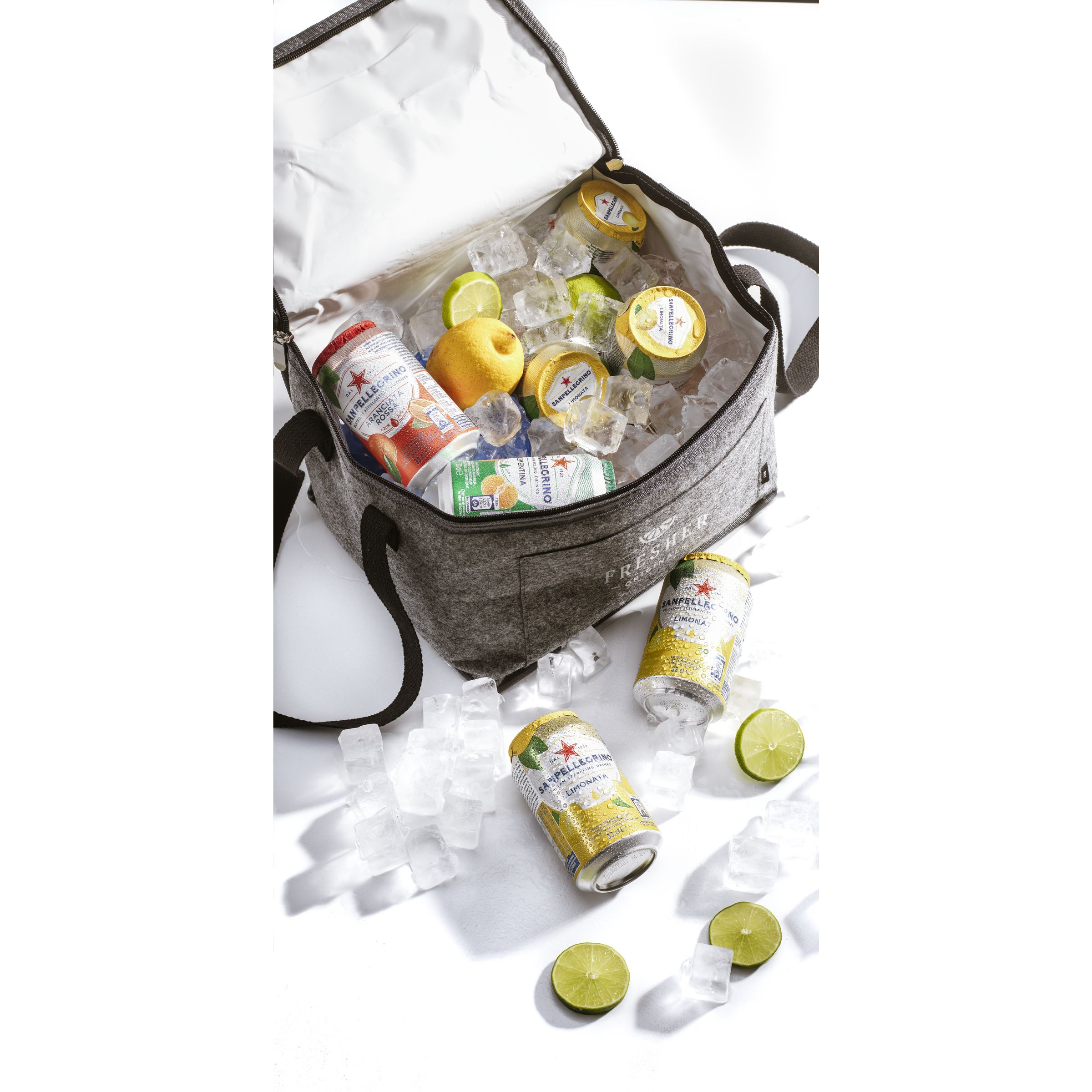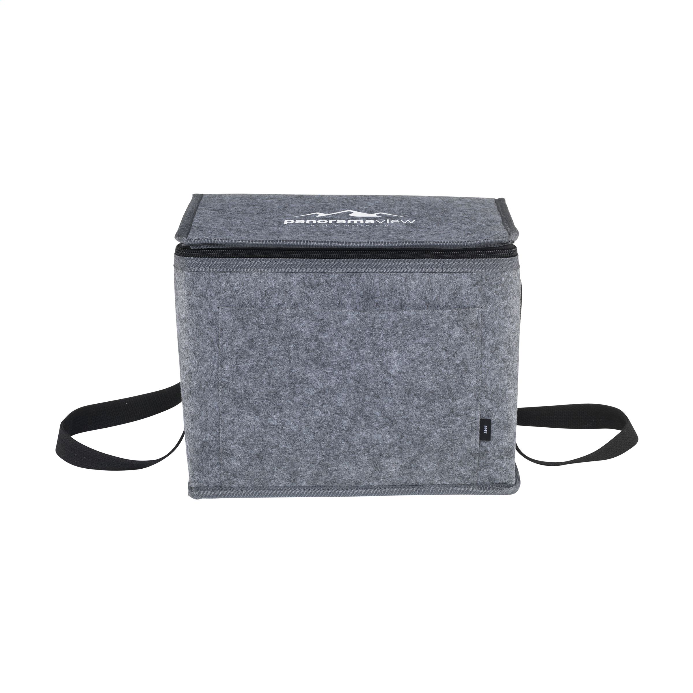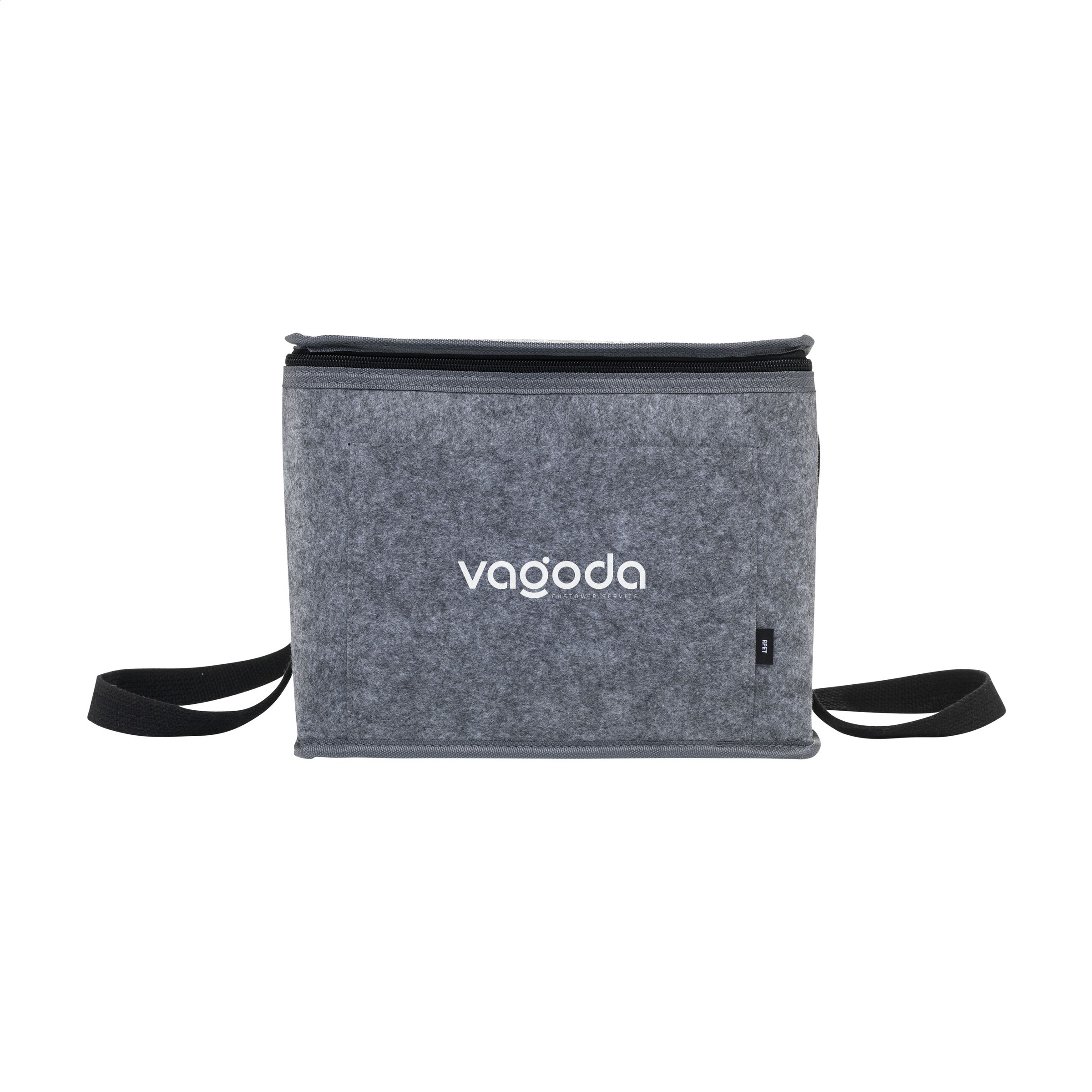 Large cooler bag made from RPET felt (made from recycled PET bottles). Lining of 100% PEVA. With carrying loops.