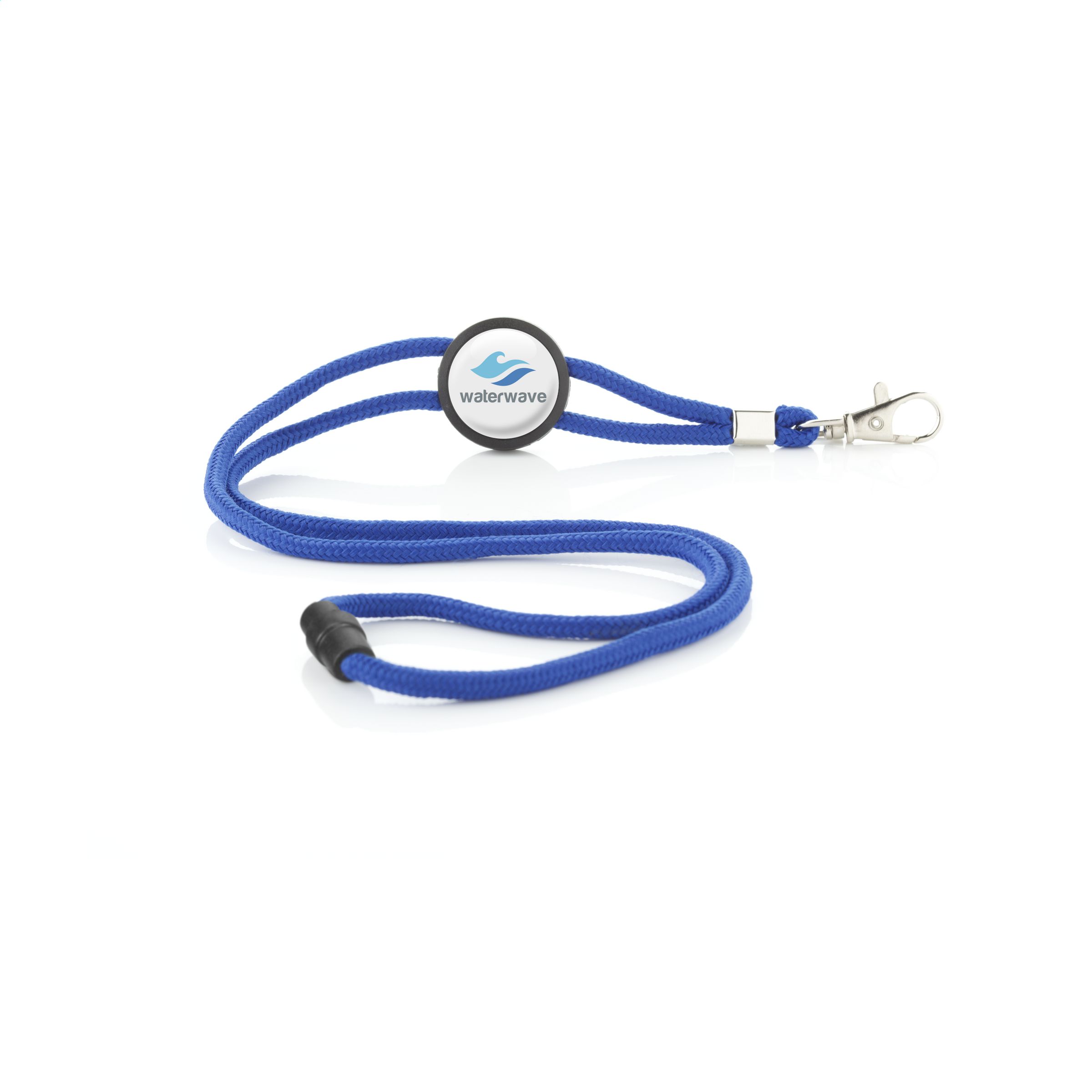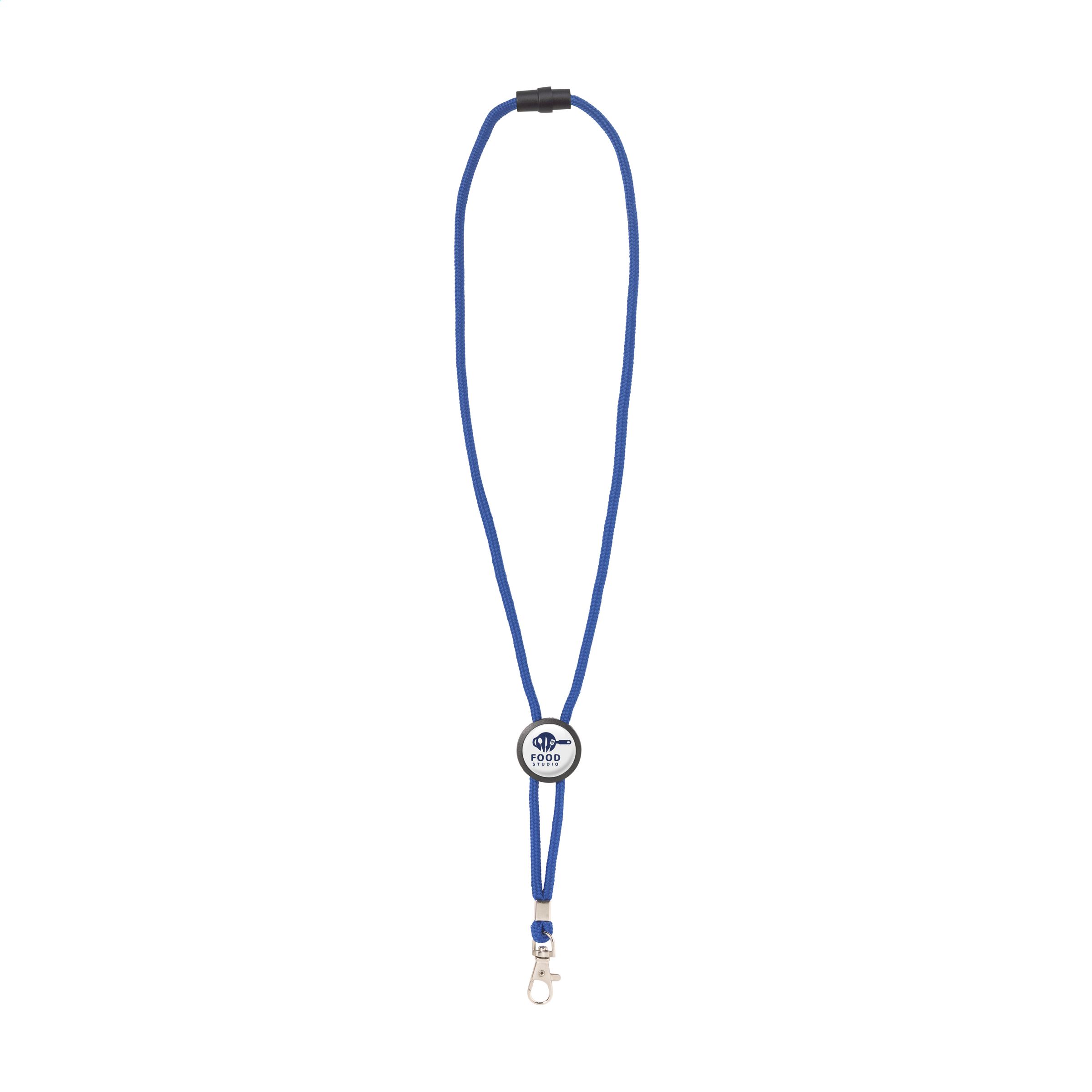 Polyester tube lanyard with metal snap hook and plastic fastening. With adjustable PVC disk (3 cm) to wear the cord looser or tighter around the neck.