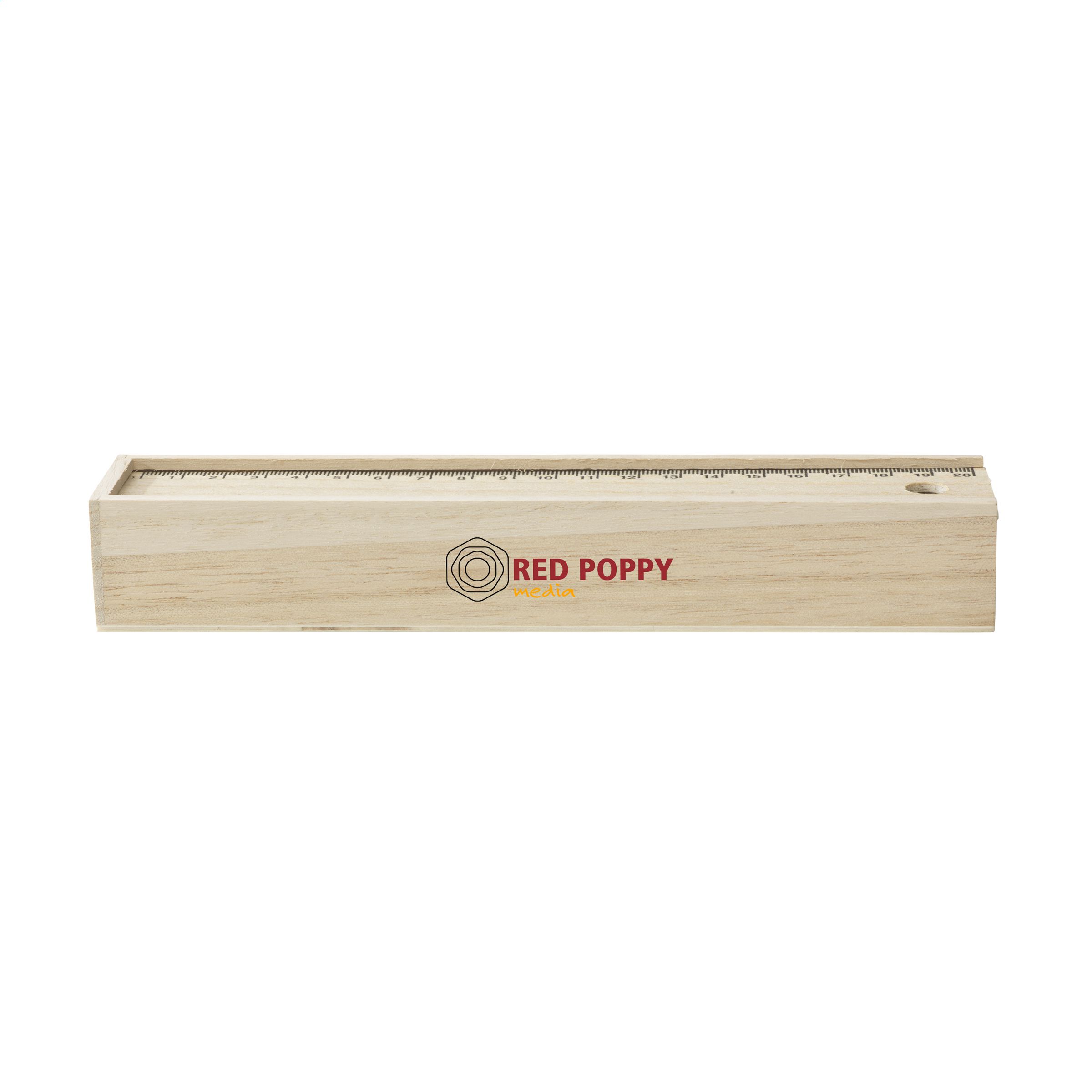 Wooden storage box with sliding lid (20 cm ruler), 12 sharpened, colouring pencils and a wooden sharpener.