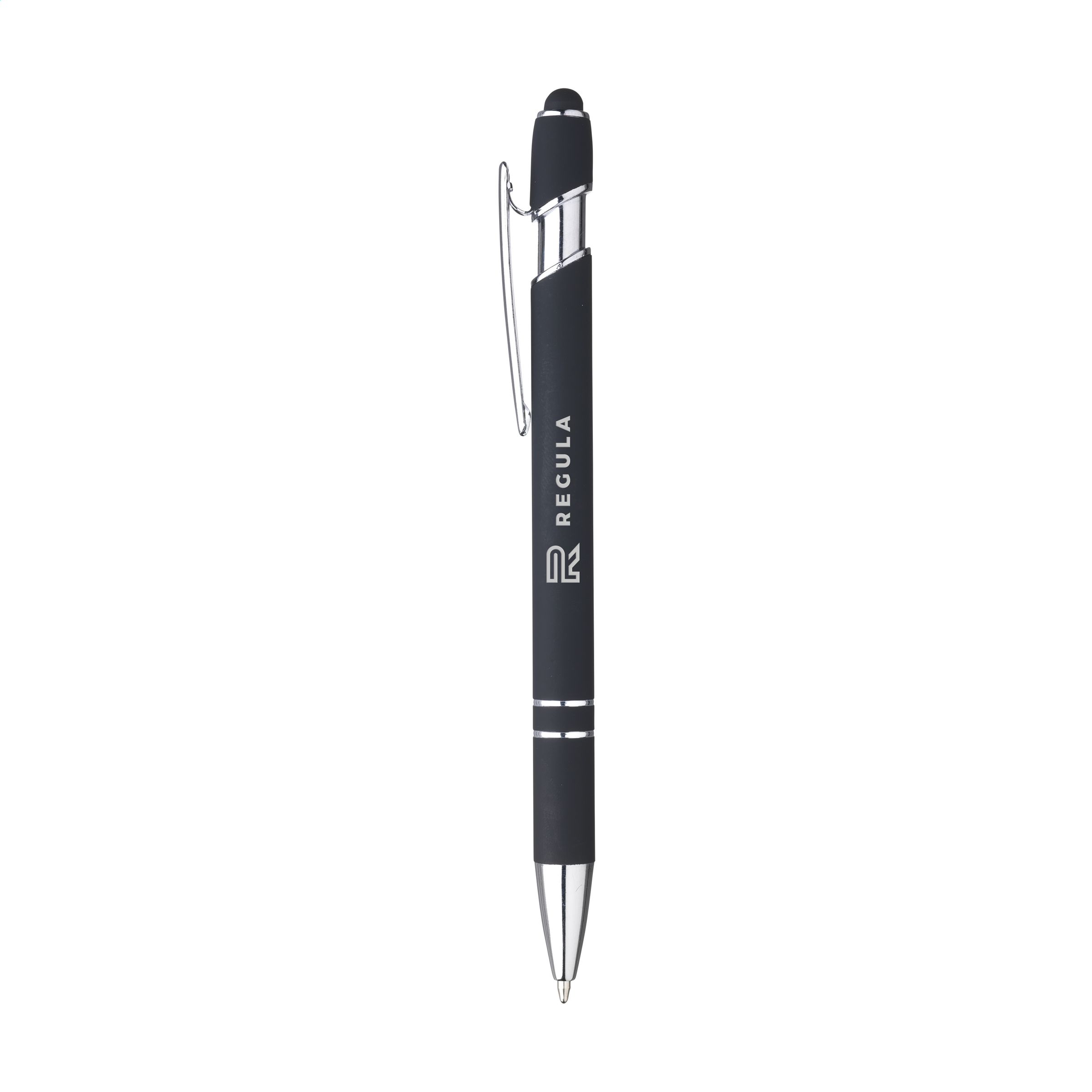 Slim, blue ink ballpoint pen with aluminium holder. With a rubberised soft touch finish and a rubber top/pointer. Sturdy metal clip and plastic point.