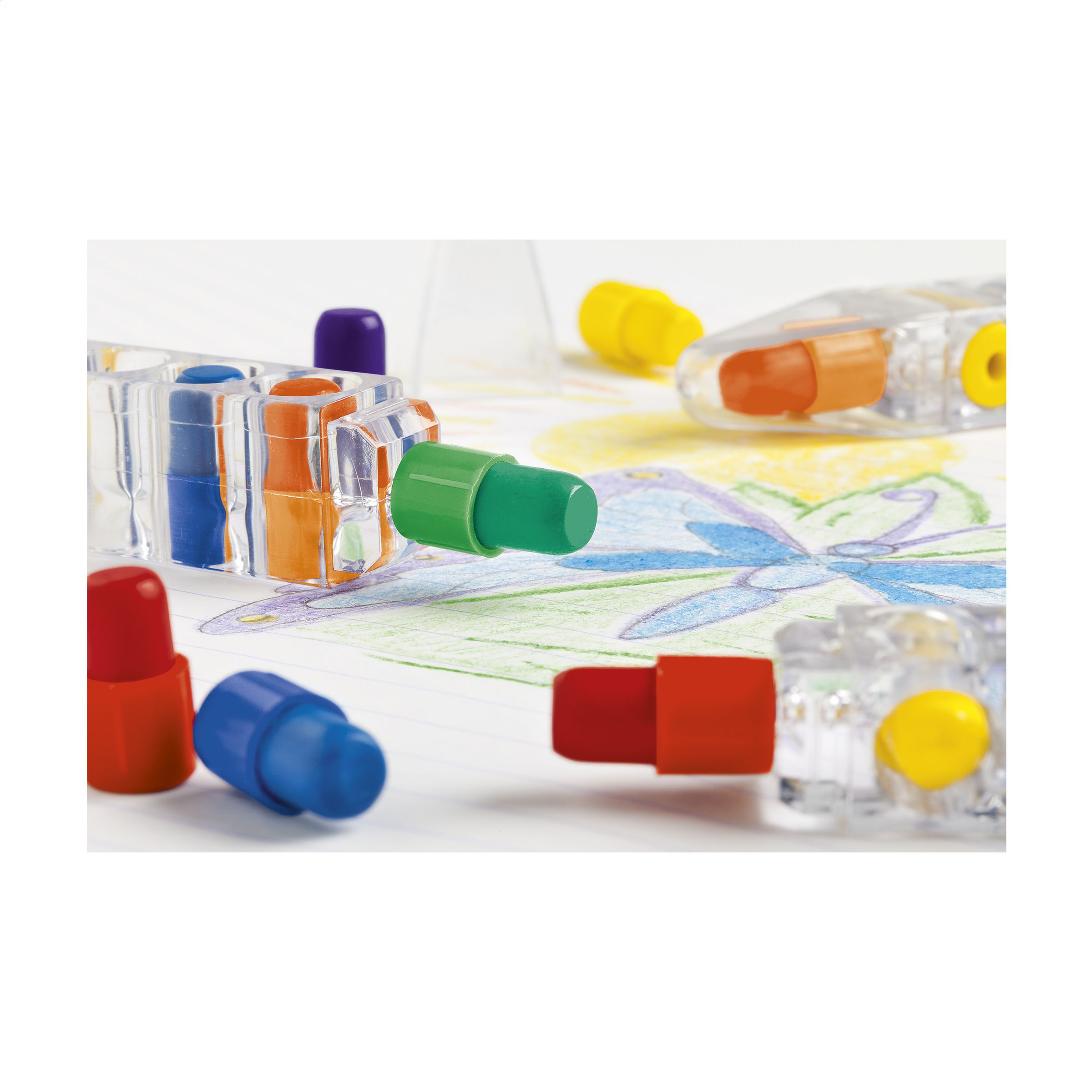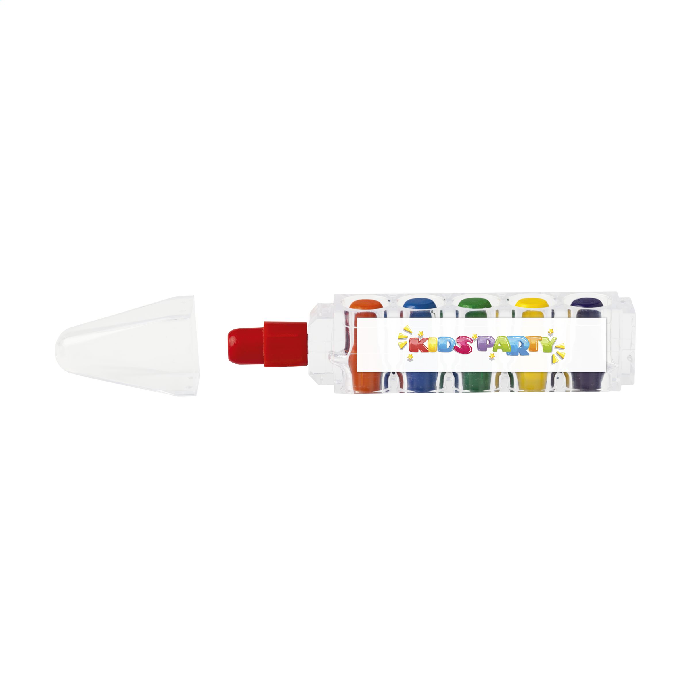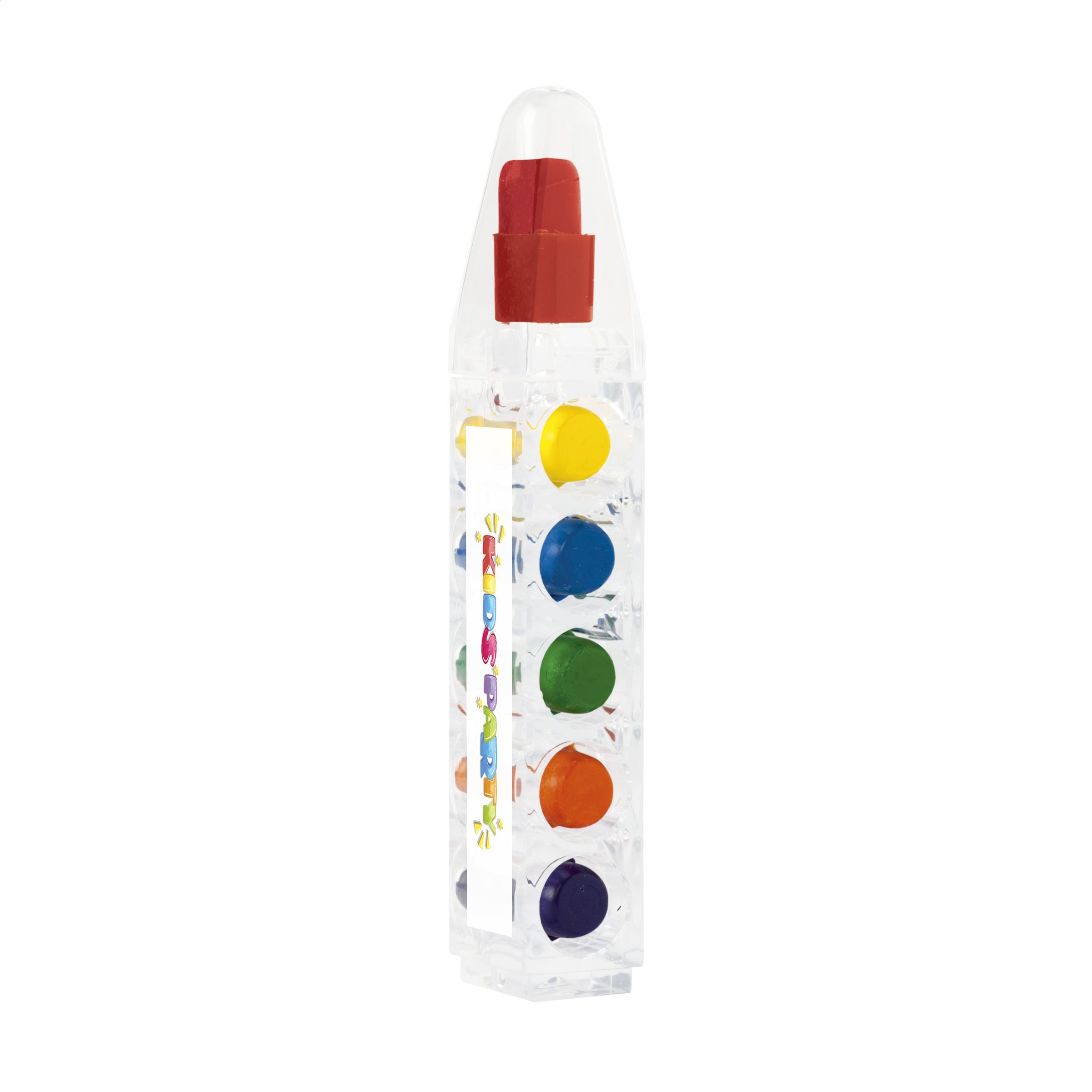 6 wax crayons in a transparent pen shaped container. Suitable for children over 3 years.