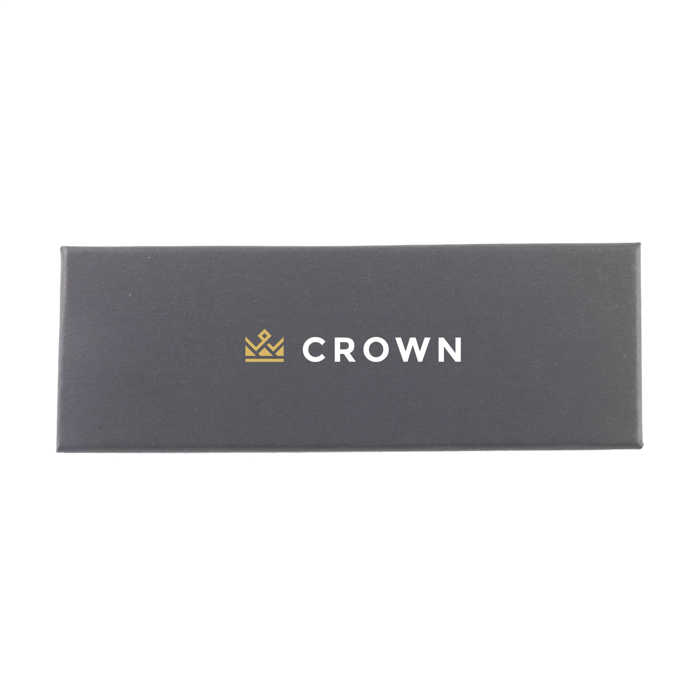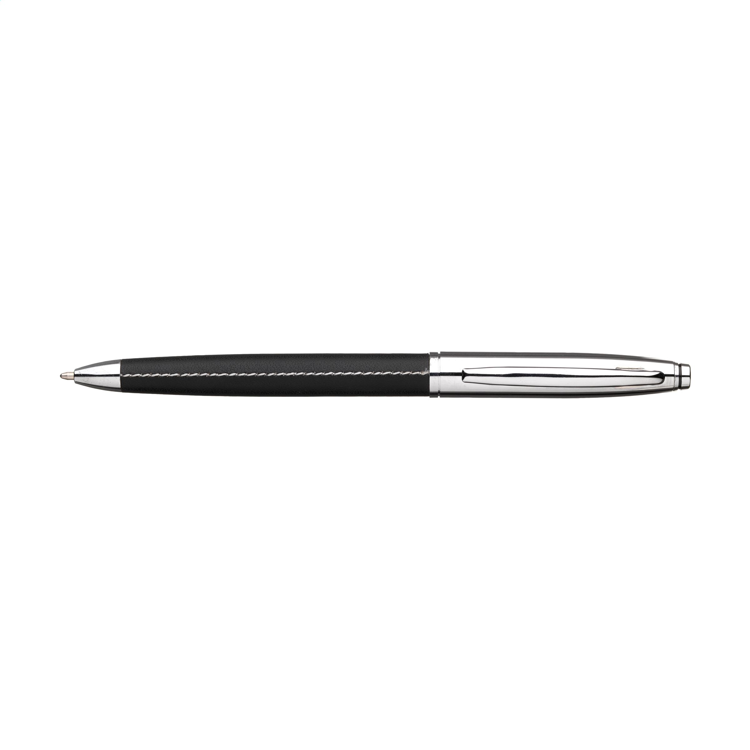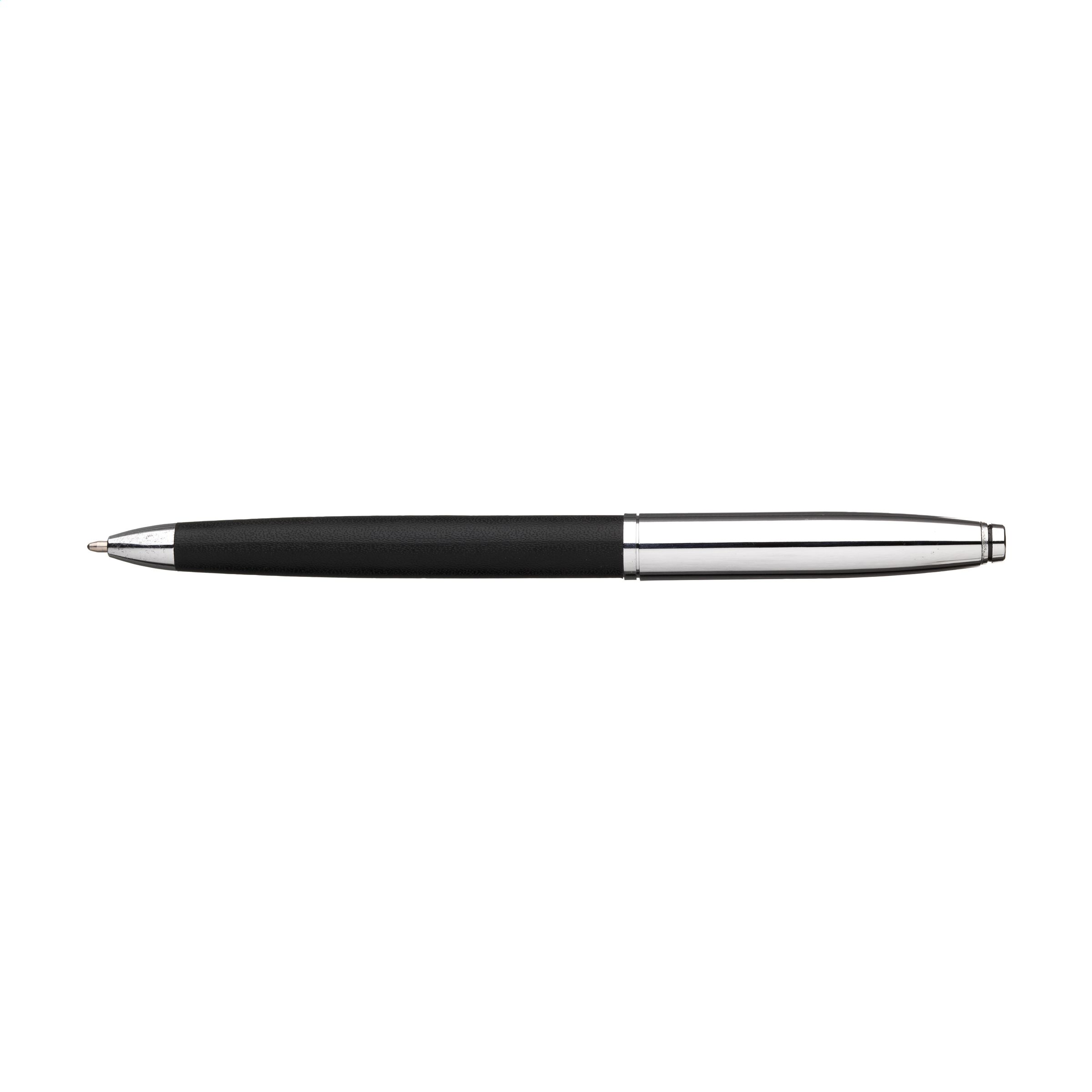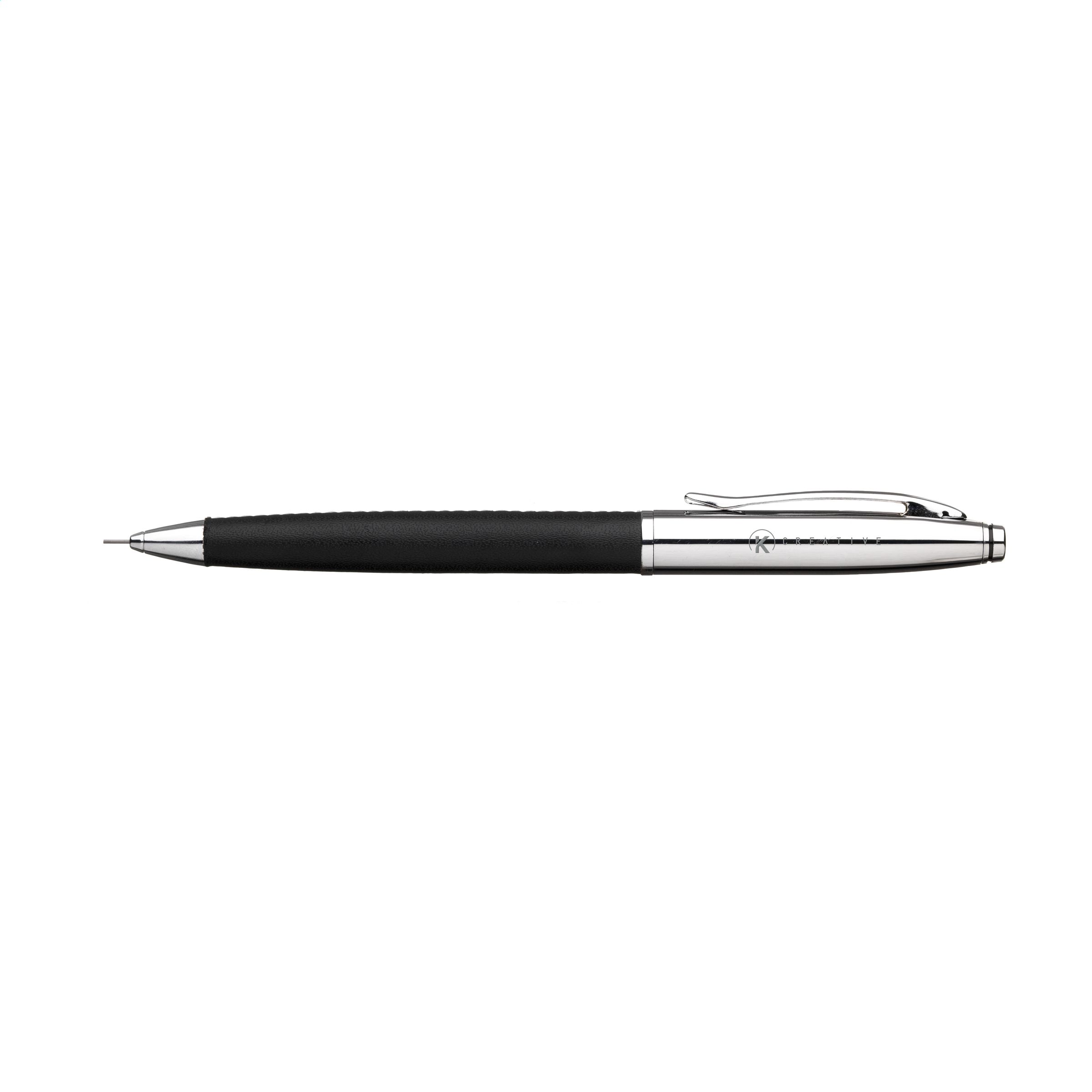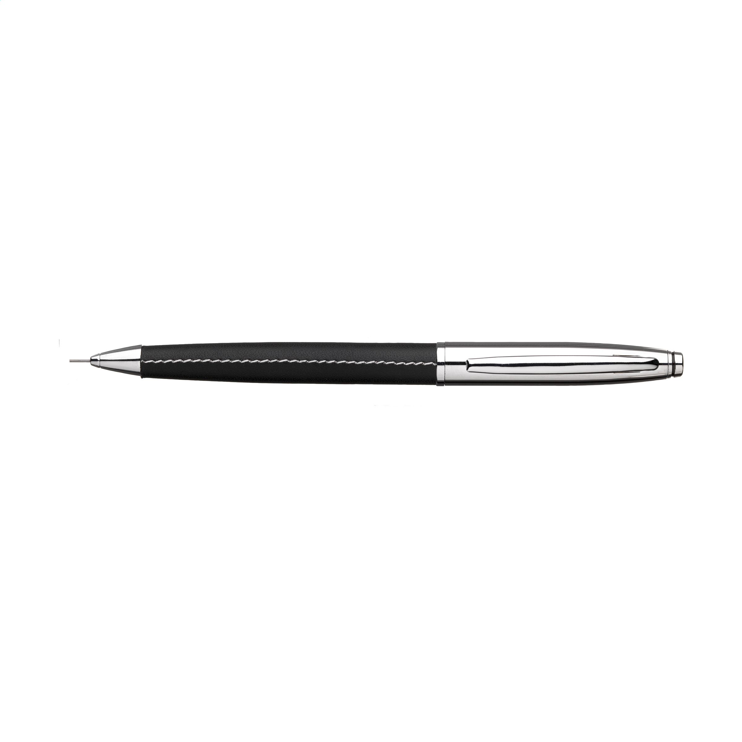 Writing set: blue ink ballpoint pen and refillable pencil with 3 HB refills (0.7 mm). Both with an imitation leather front piece, twist-action tip, metal clip and point. Per set in cardboard gift box with velvet inlay.