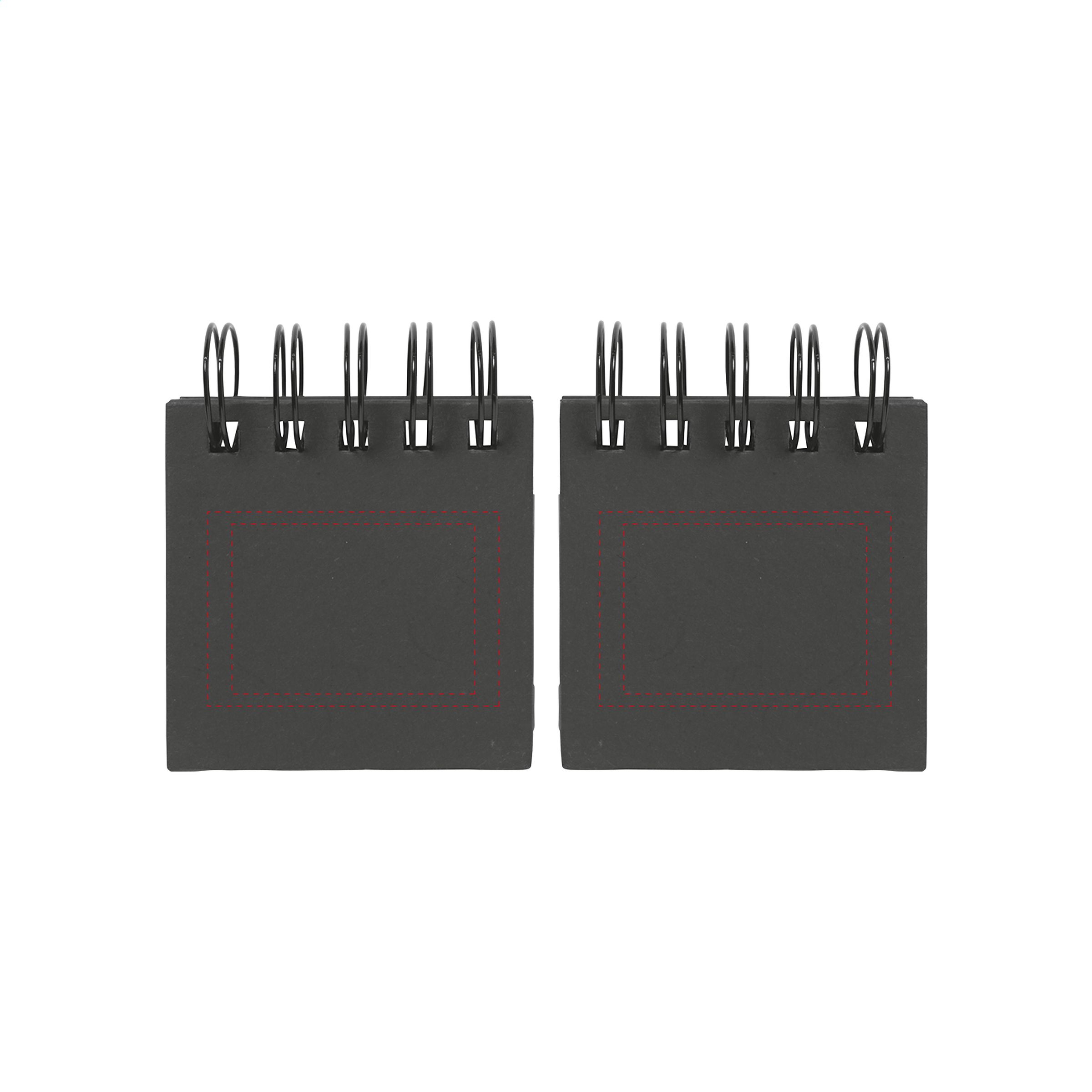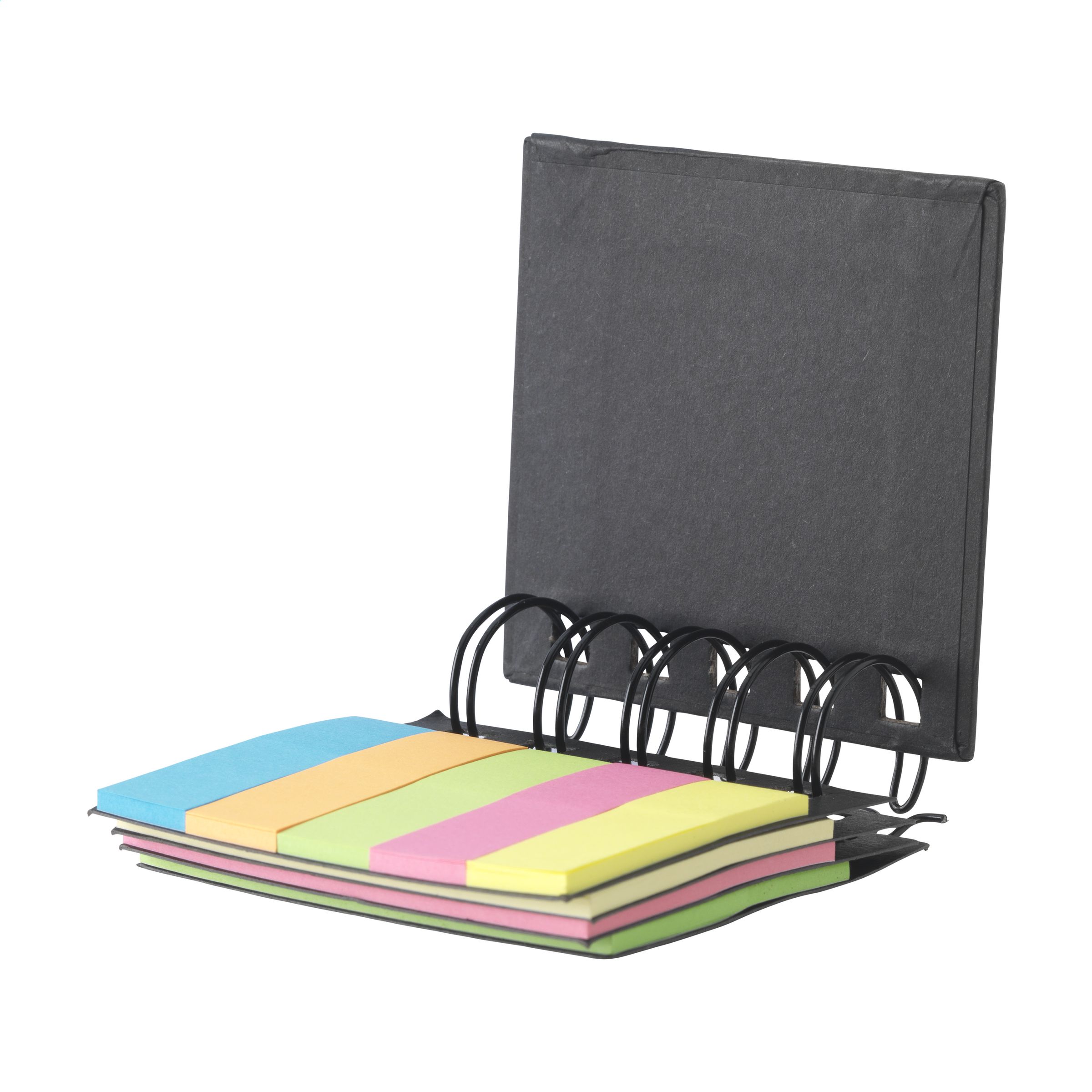 Block with approx. 75 self-adhesive memo sheets and 125 writable marking stickers in different colours. Cover made of recycled cardboard. Bound in eye-catching, metal wire-o-binding.