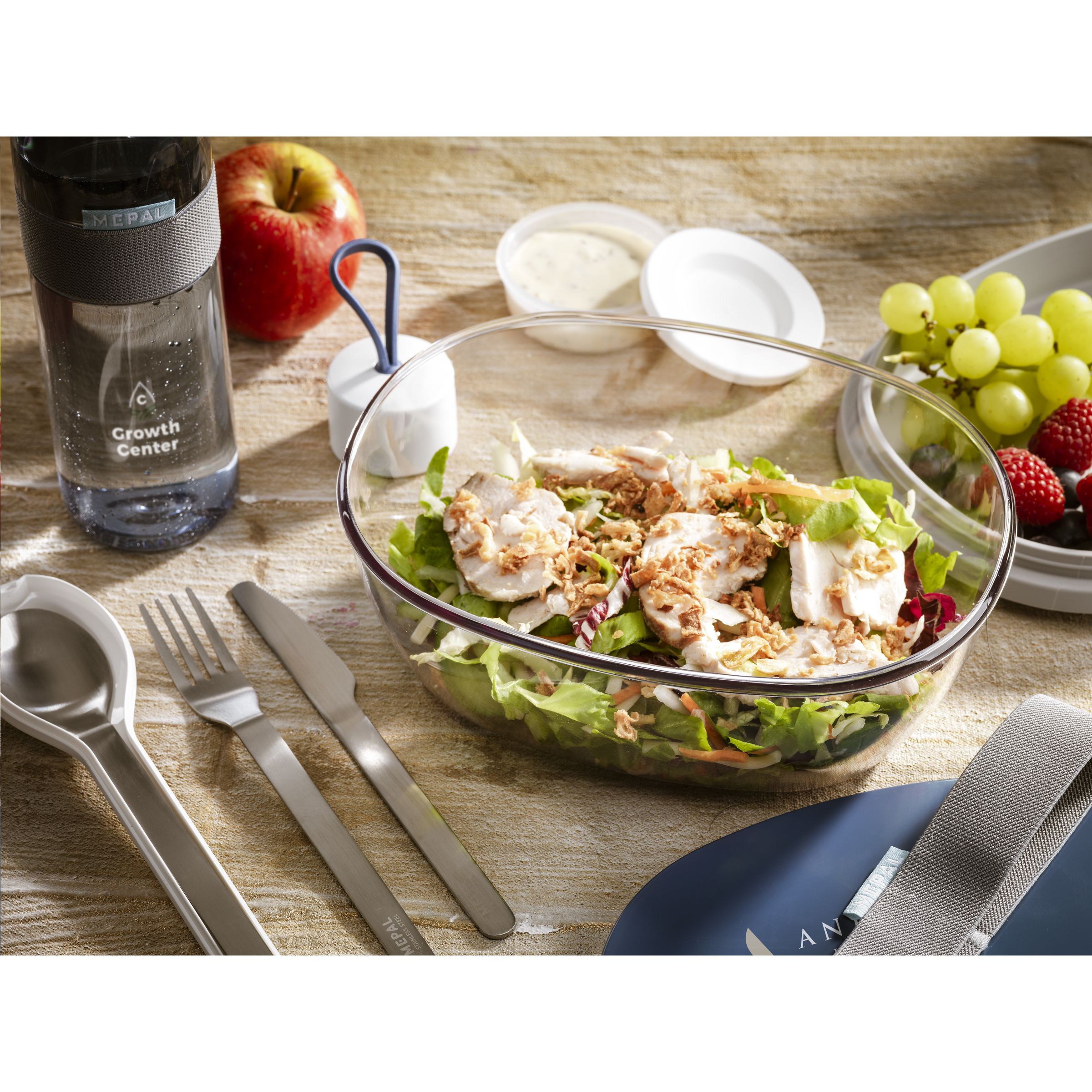 Sustainable, plastic salad box with lid, made by Mepal. Large size. Includes a mini box for dressings or other ingredients. The transparent box is large enough to mix the salad. High-quality and virtually unbreakable. BPA-free and Food Approved. Comes with a 2-year Mepal manufacturer’s warranty. Capacity 1,300 ml. Made in Holland.