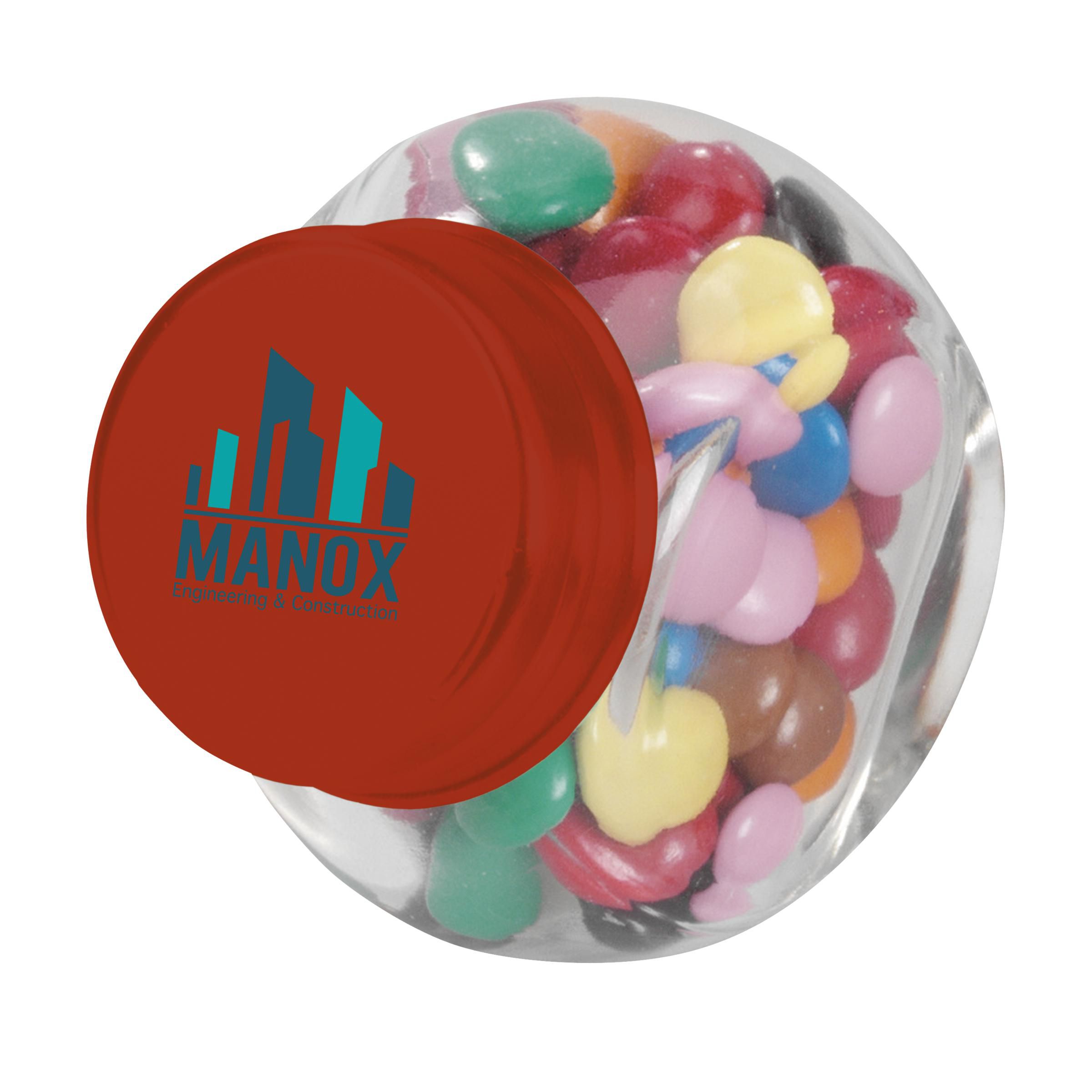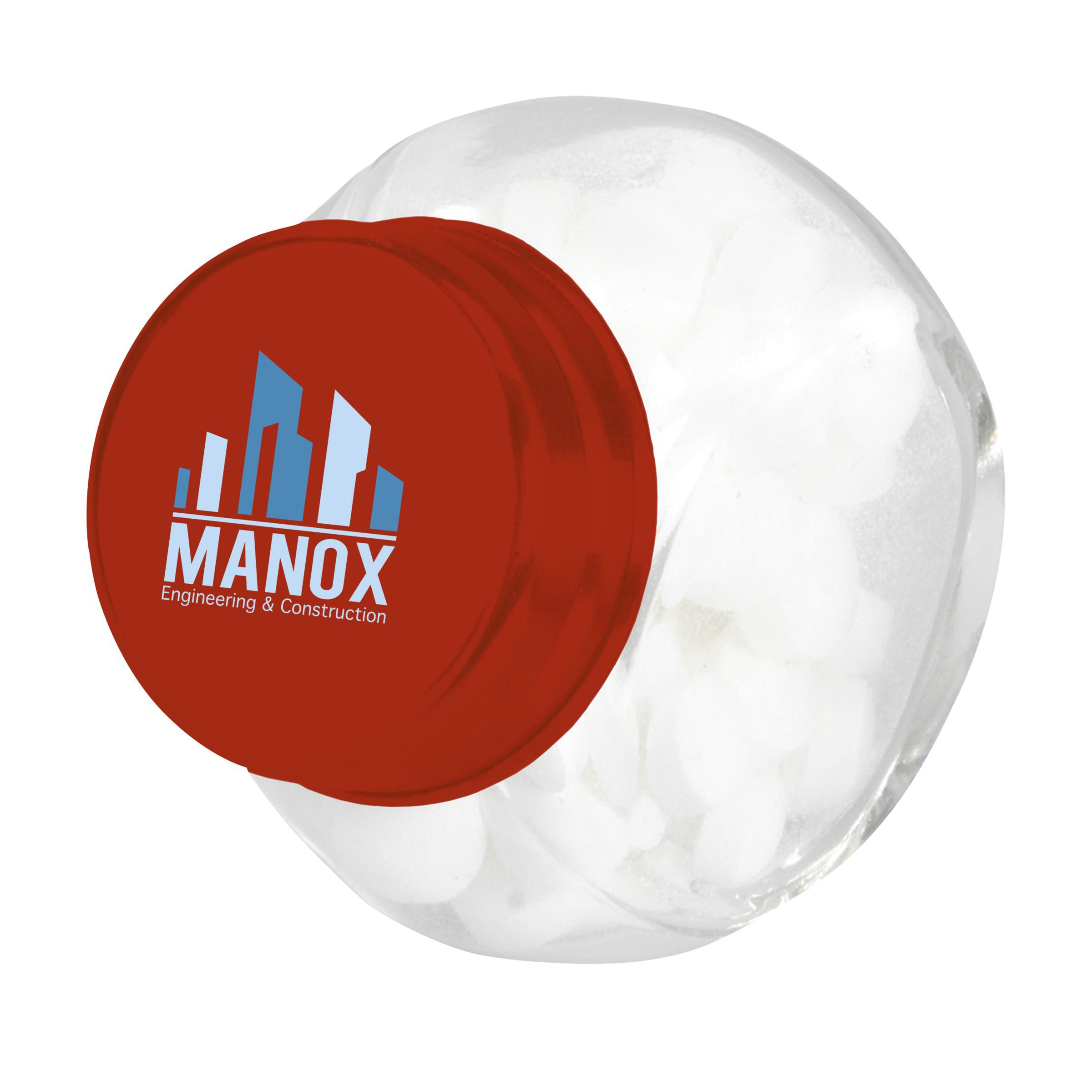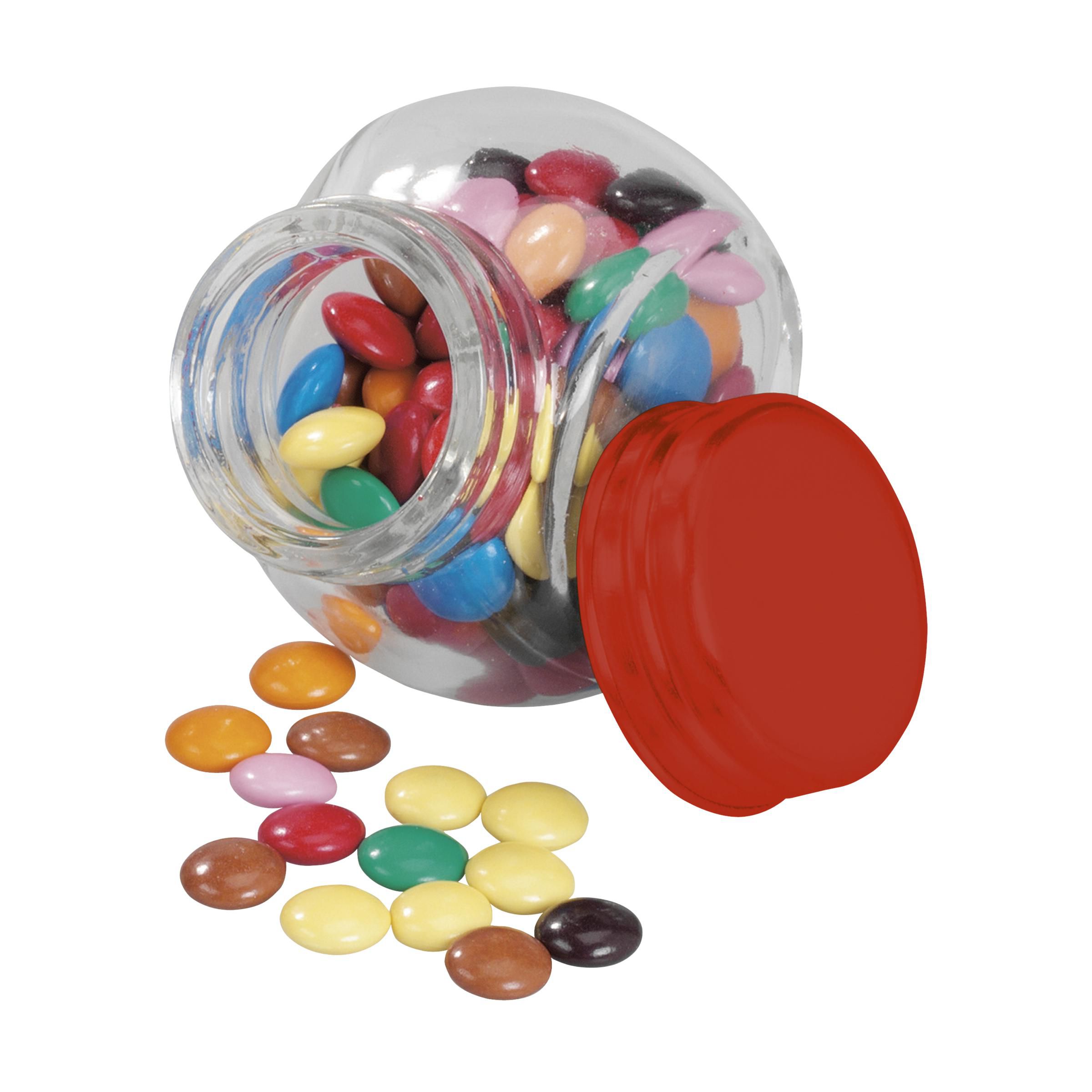 Mini glass jar with approx. 30 g of sweets. Choose from peppermints, chocolate, jelly beans and hearts.