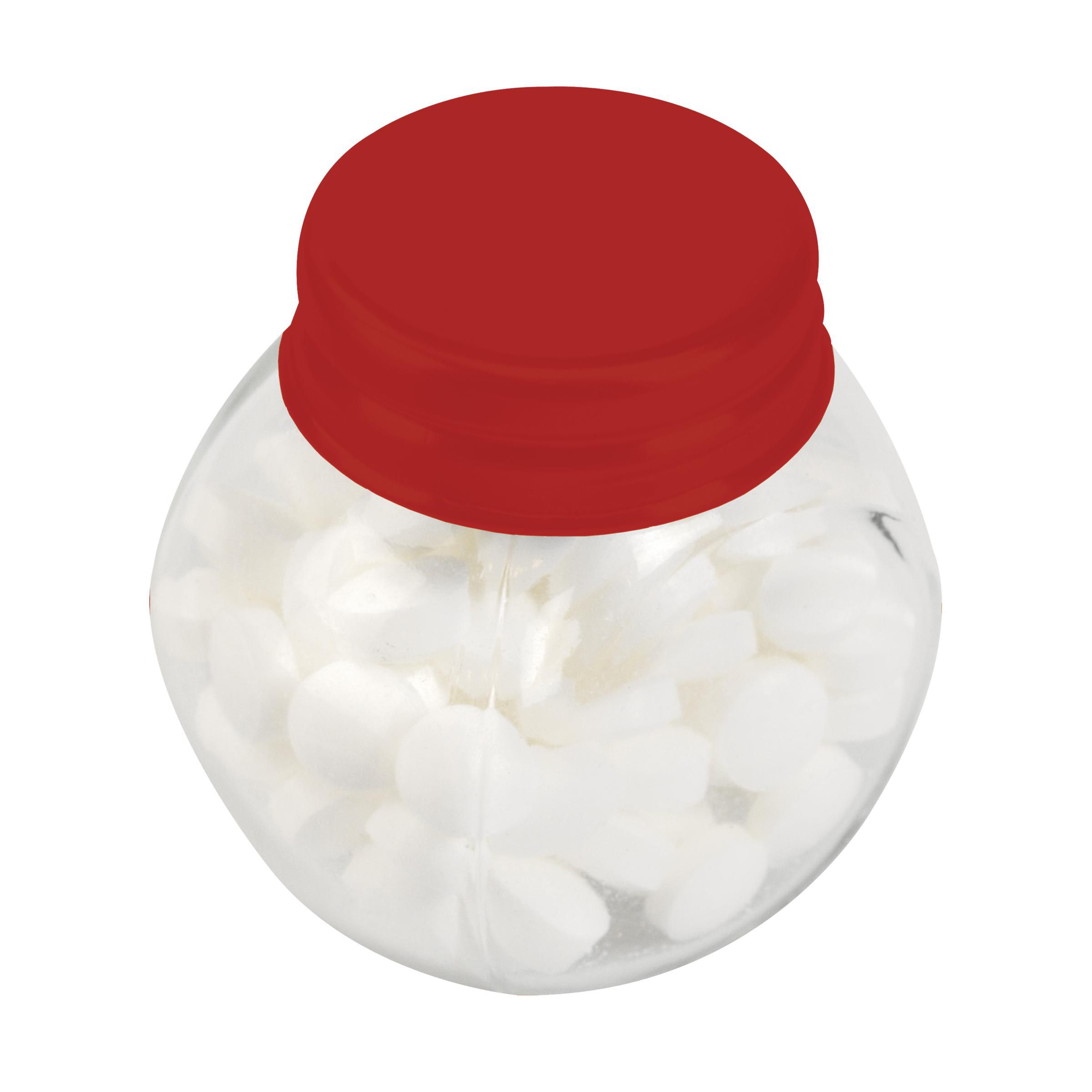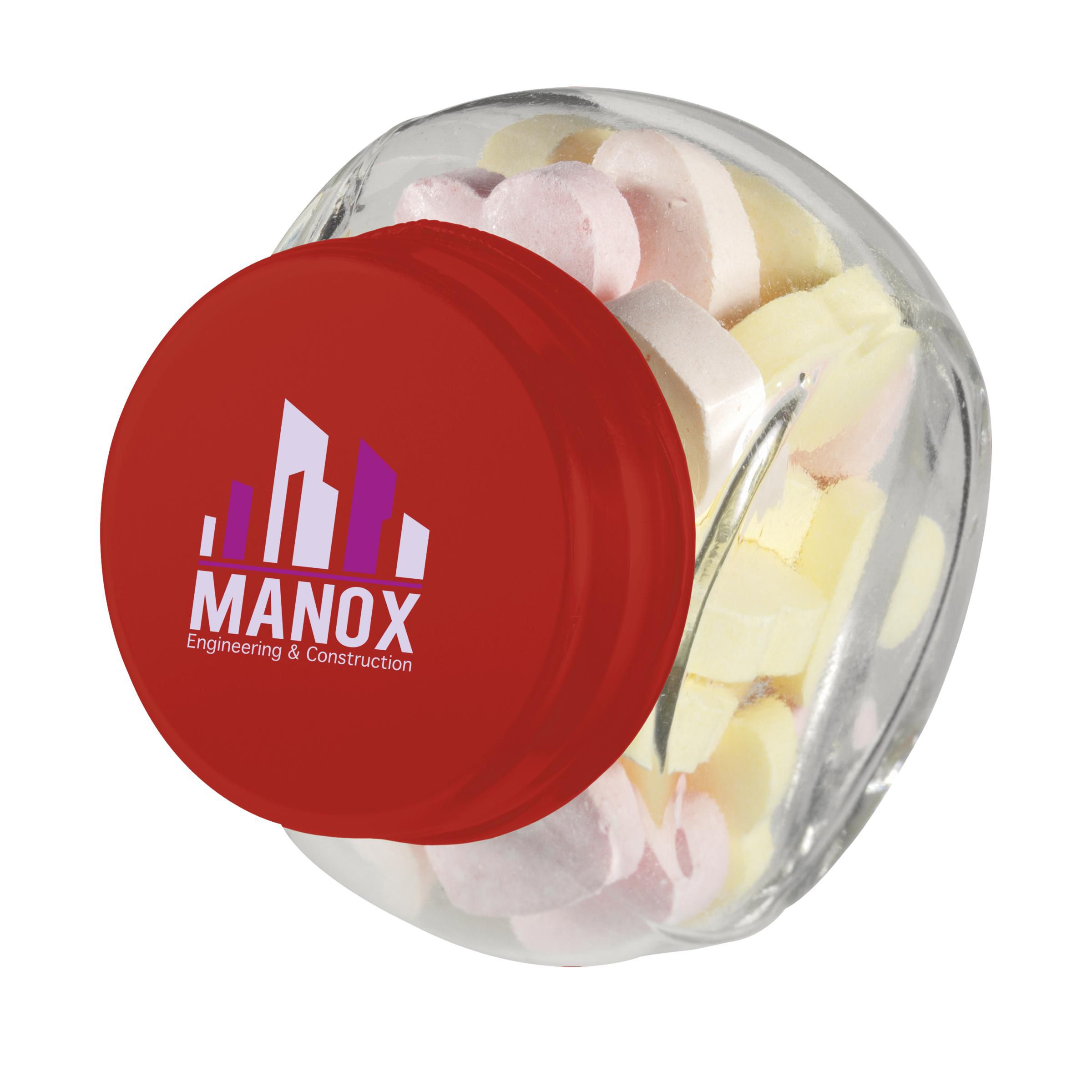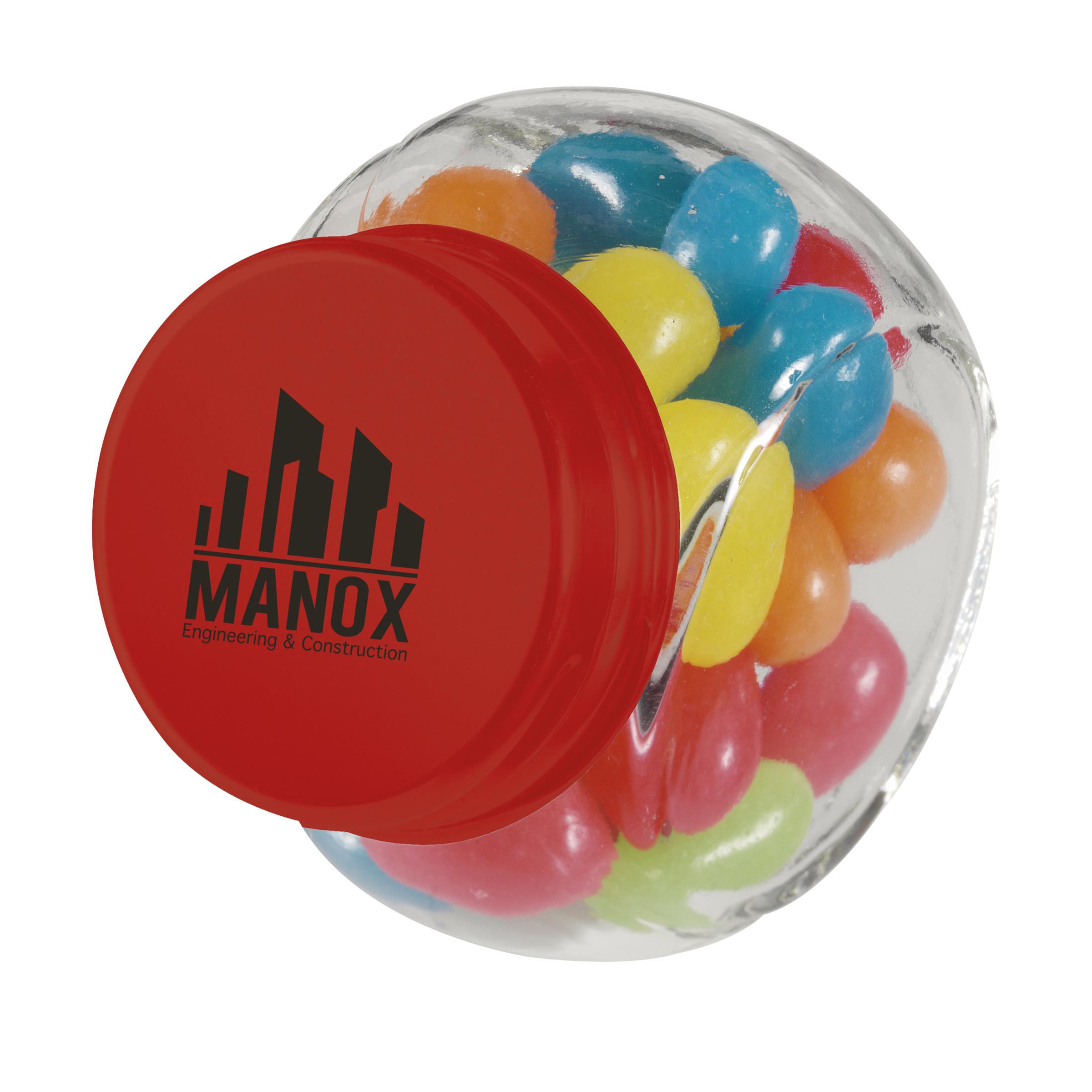 Mini glass jar with approx. 30 g of sweets. Choose from peppermints, chocolate, jelly beans and hearts.