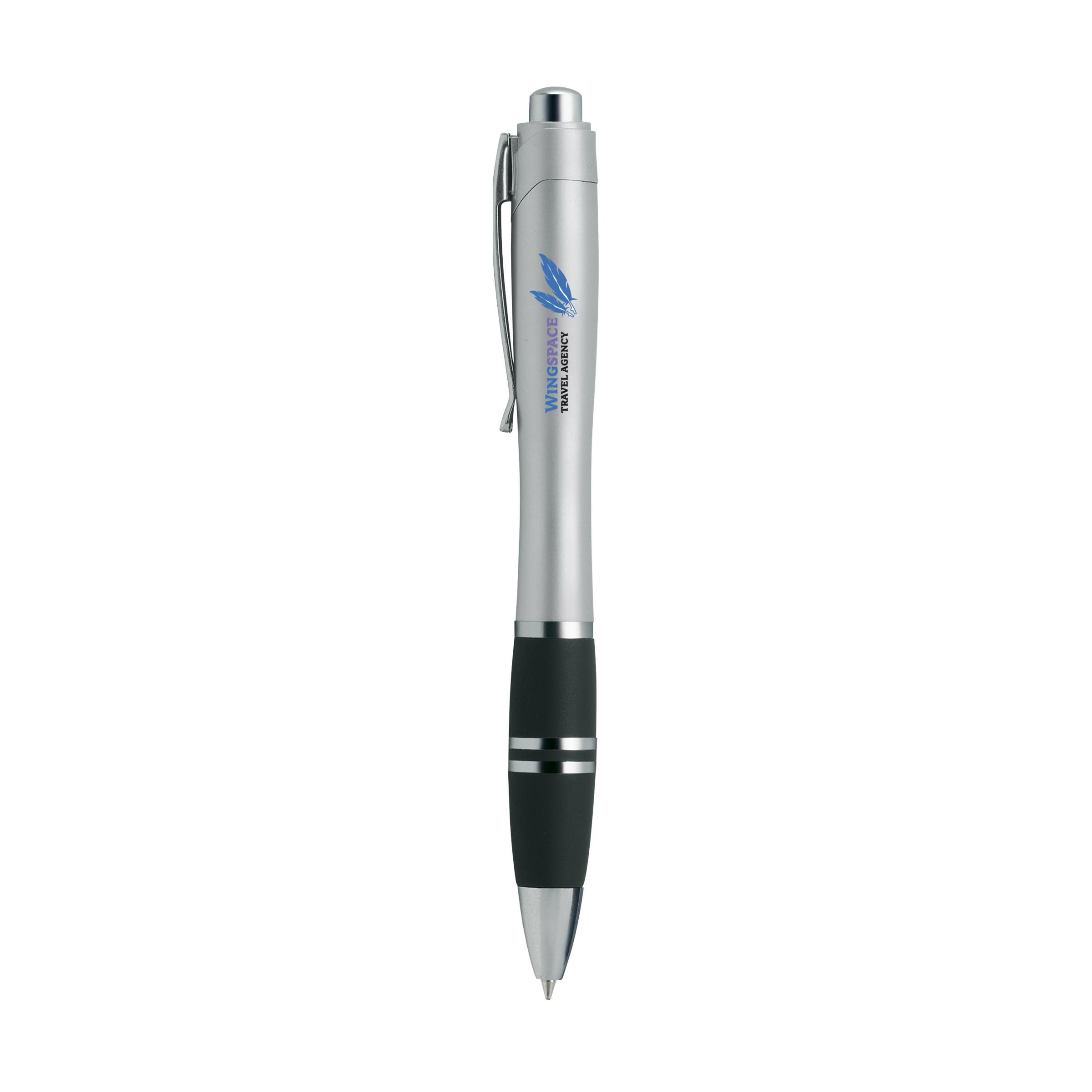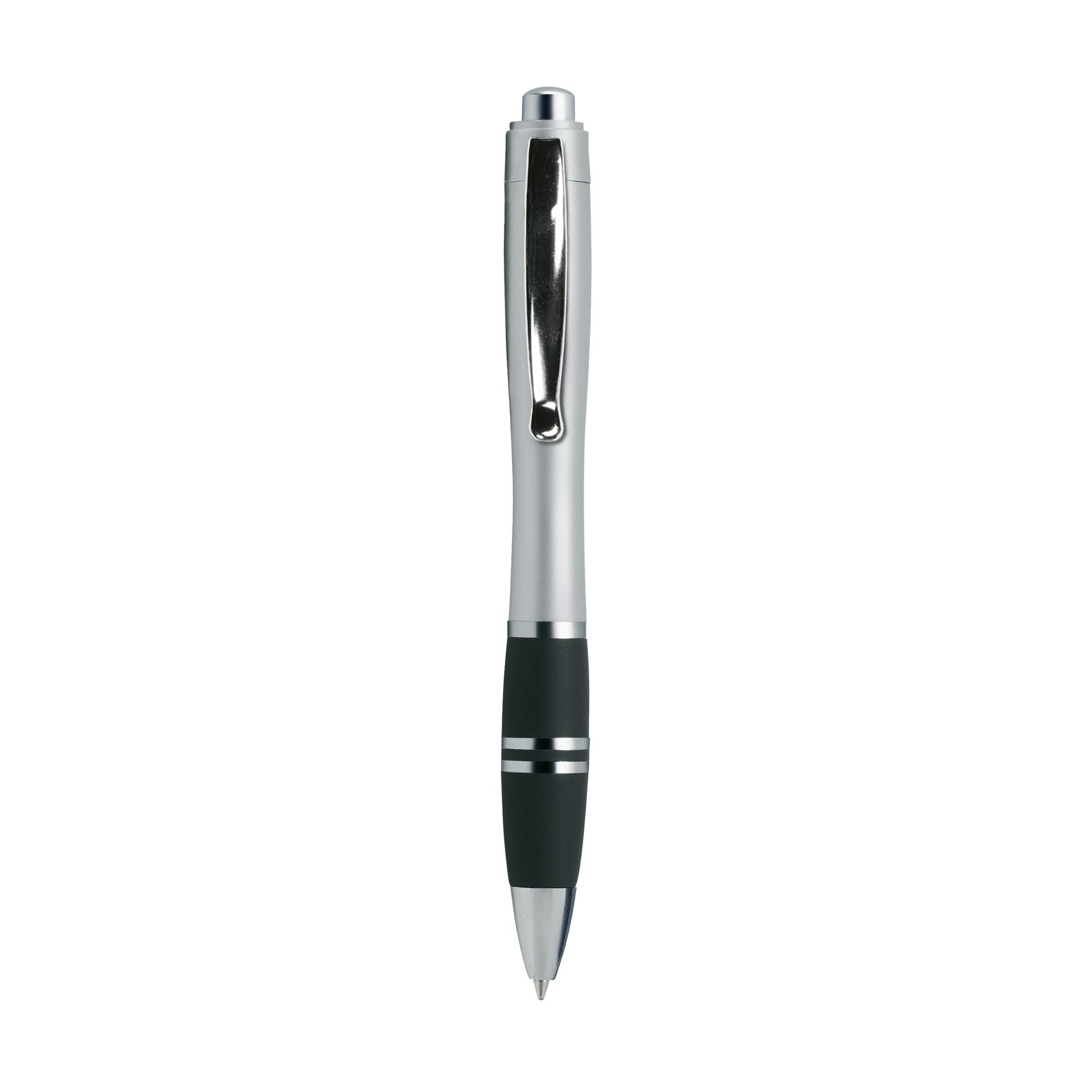Black ink ballpoint pen with coloured non-slip grip and metal clip.