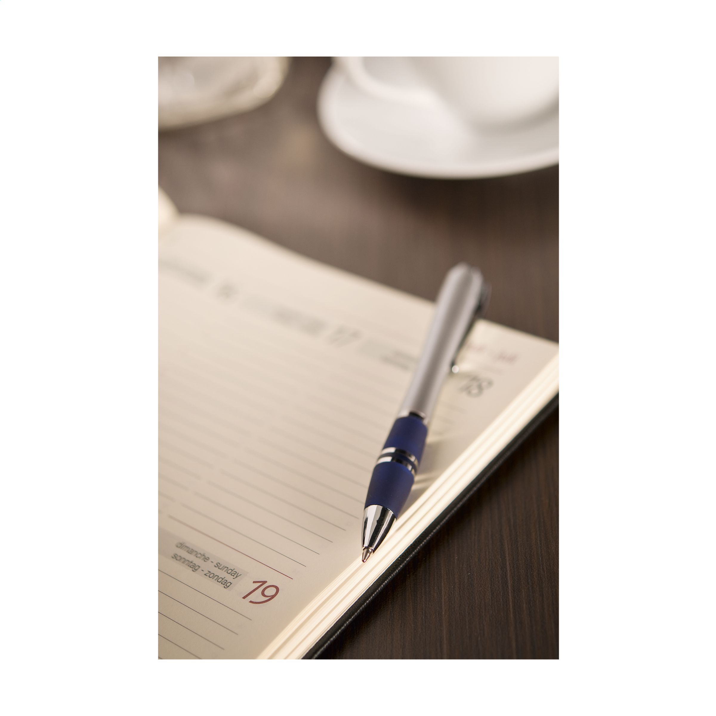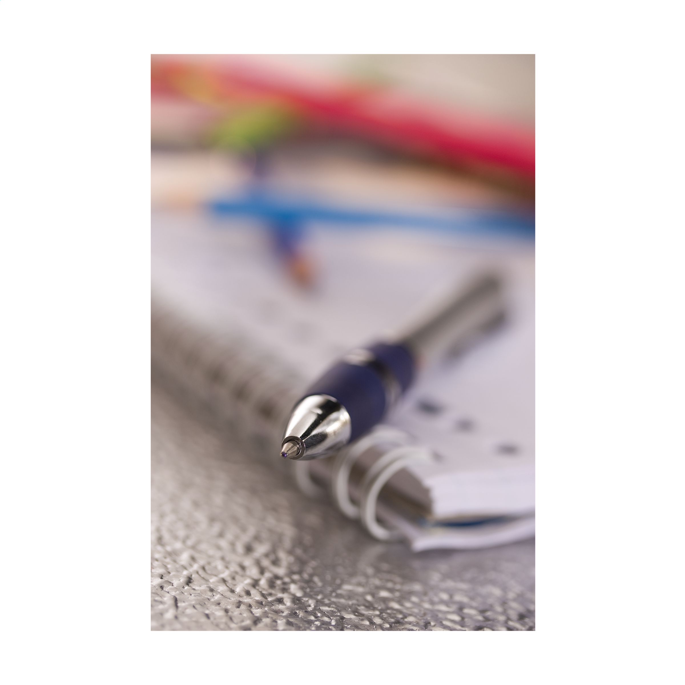 Blue ink ballpoint pen with non-slip grip and metal clip.