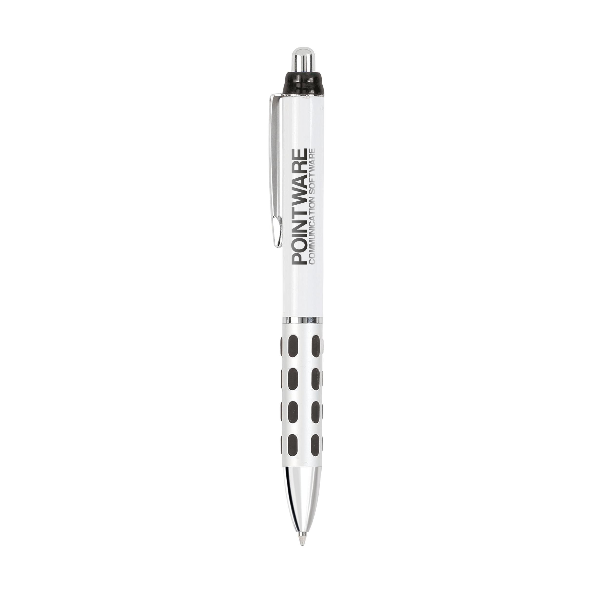 Ballpoint with blue ink, firm aluminium grip, silver coloured clip, push button and tip.