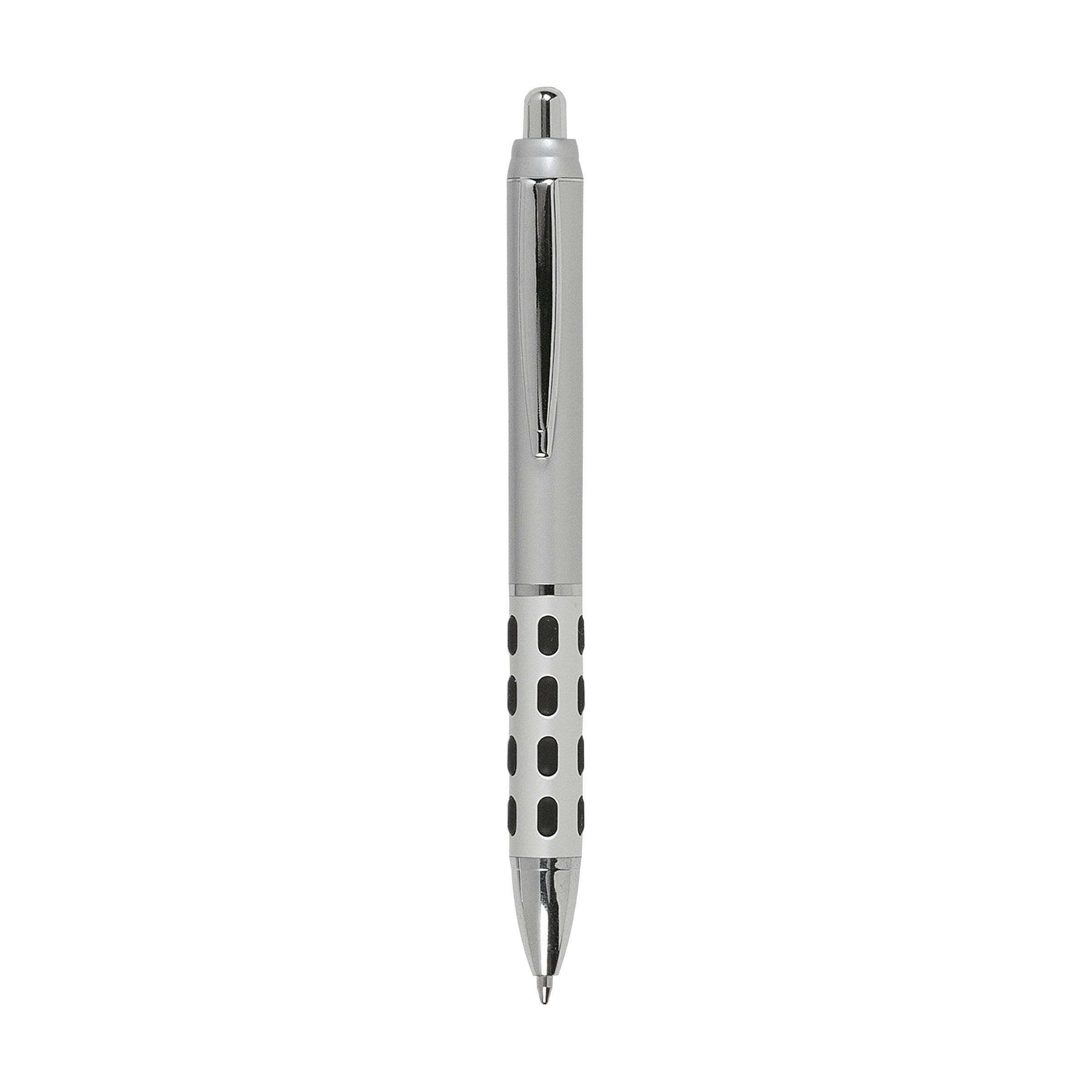 Blue ink ballpoint pen with aluminium grip and coloured rubber detail.