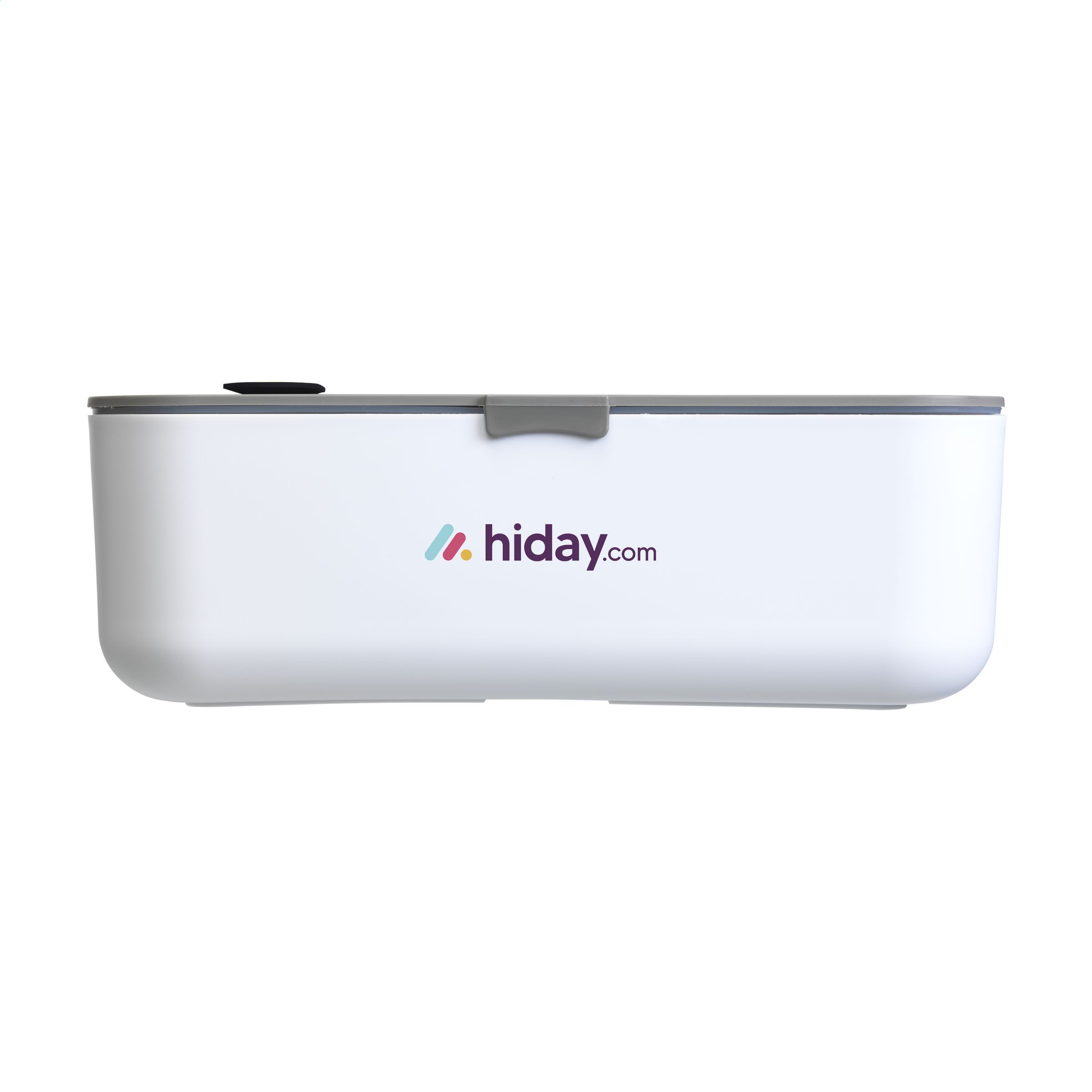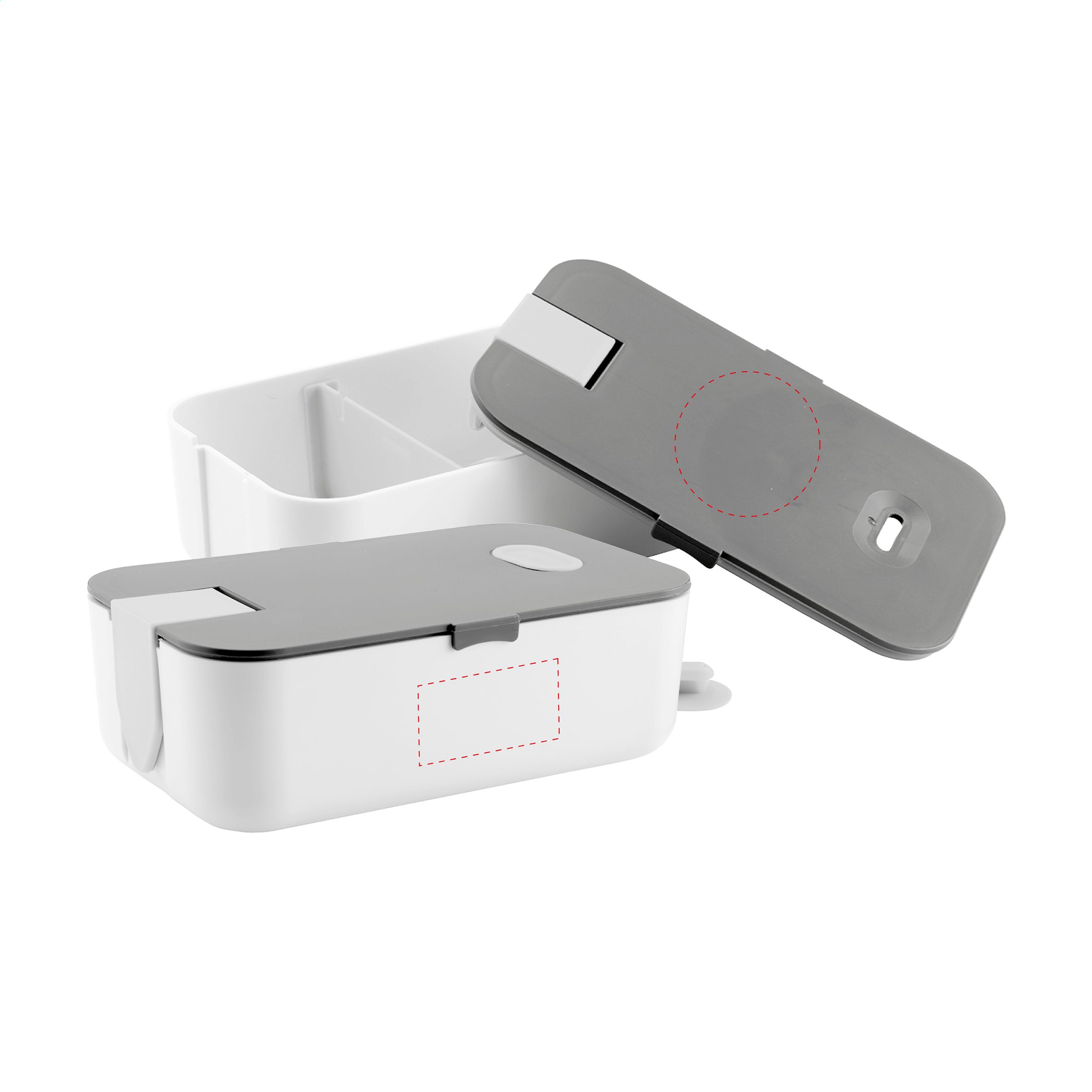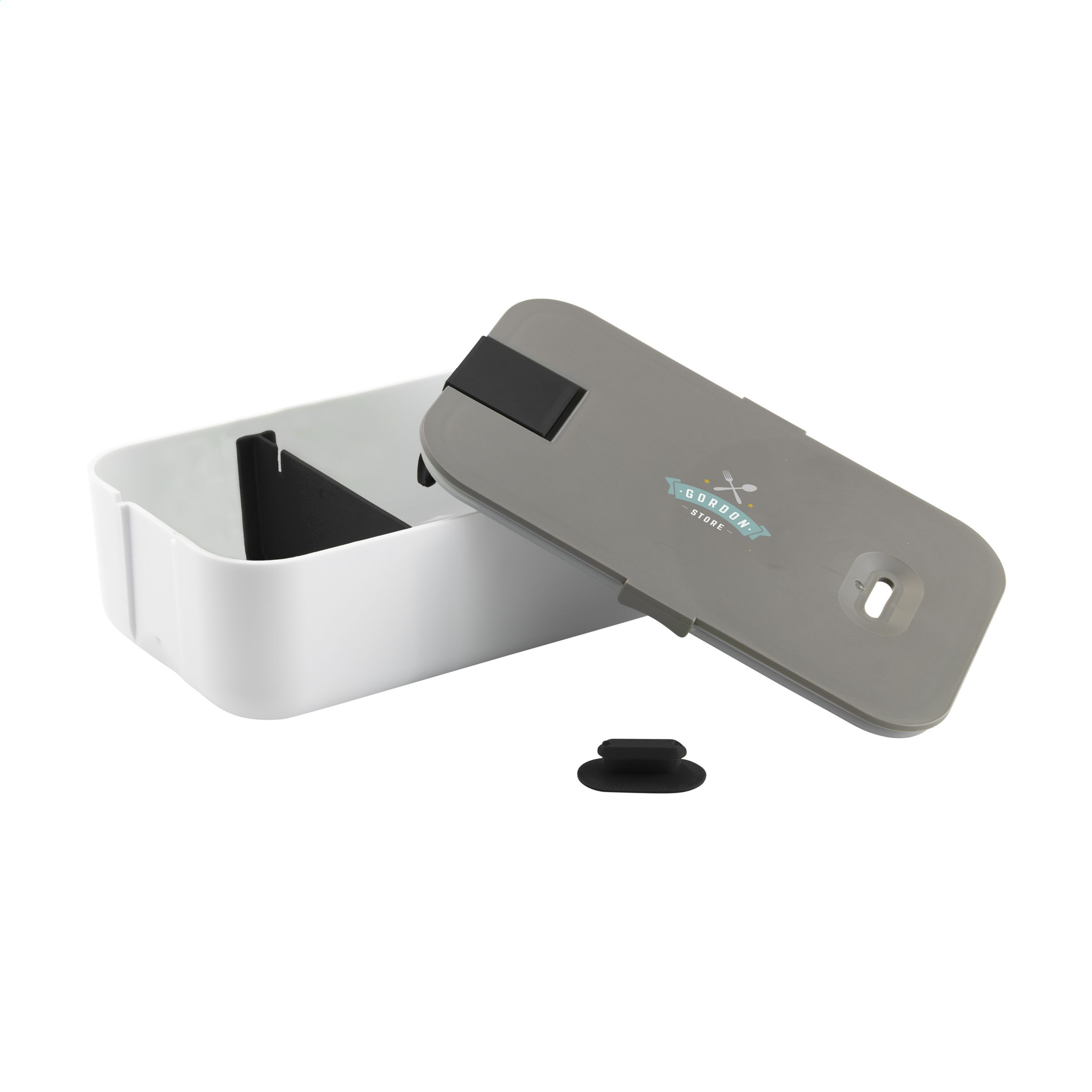 Luxury lunchbox made of high-quality plastic material. The lid fits perfectly due to the silicon sealing ring and extra snap closure. With removable separator and ventilation opening. The snap closure can be used as a telephone holder. This box can be placed in the fridge and can therefore also be used as an air-tight chiller box. Suitable for use in microwave. This product is dishwasher-safe, but placing it in the dishwasher is discouraged in order to maintain the print.