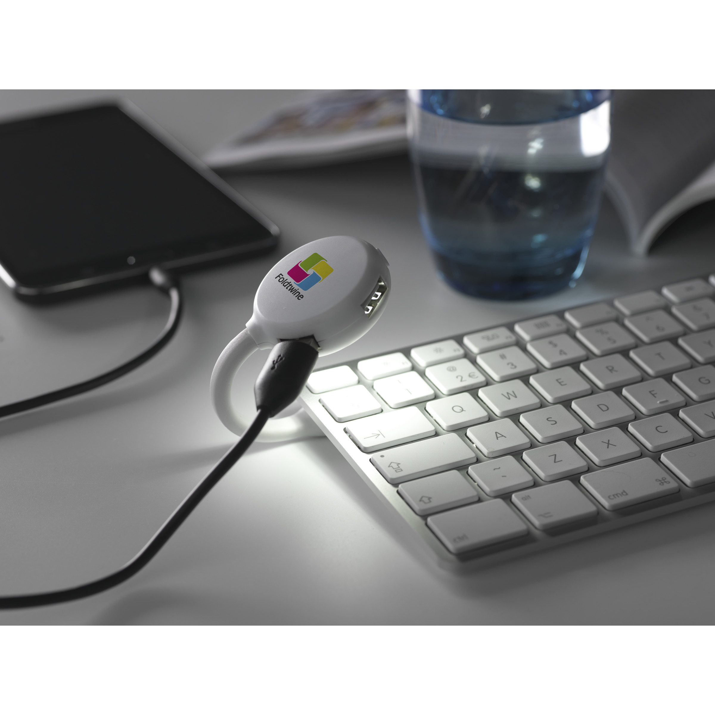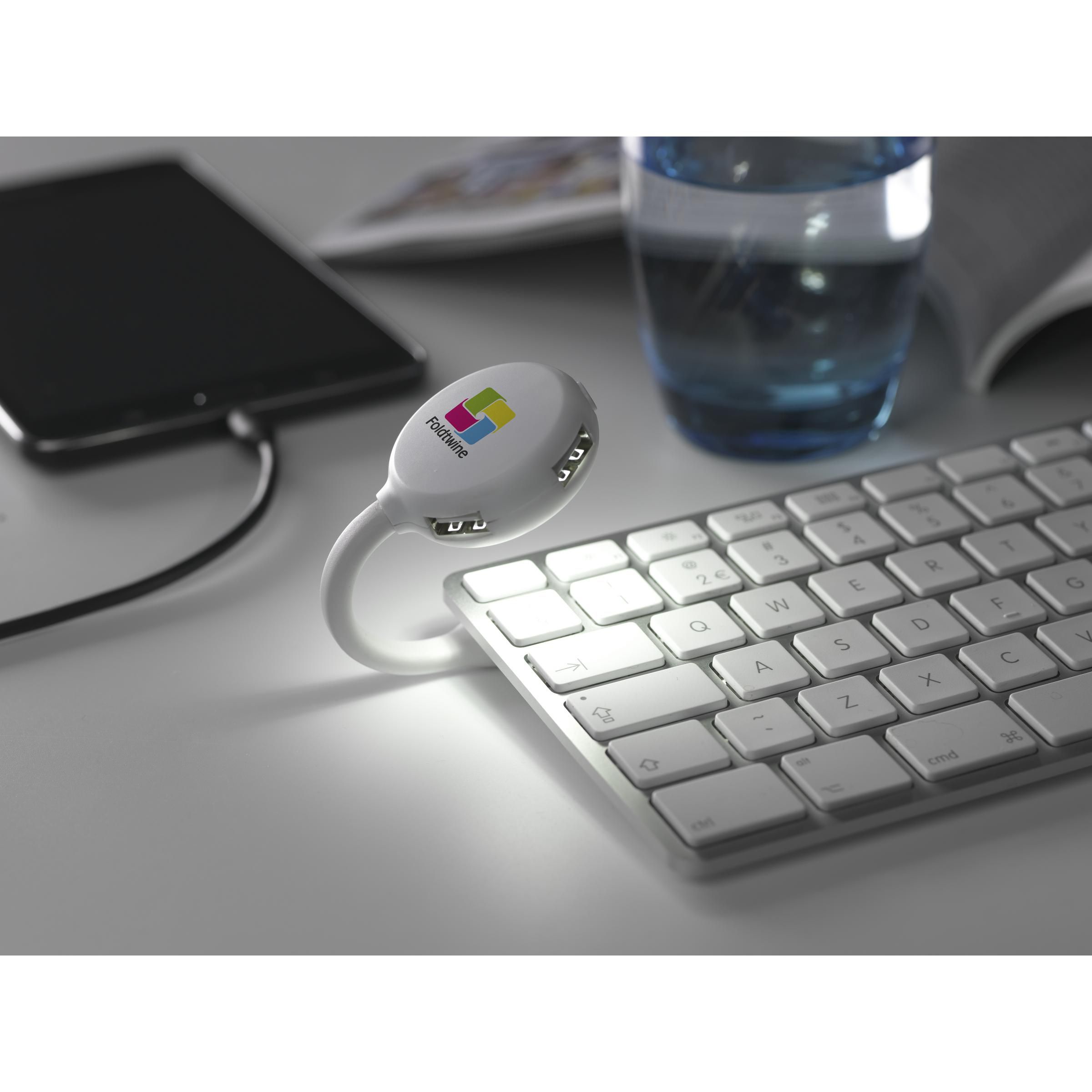 Multifunctional USB 2.0 HUB with flexible reading light, with 5 energy-efficient LED lights and 4 USB ports. Suitable for laptops with a USB connection.