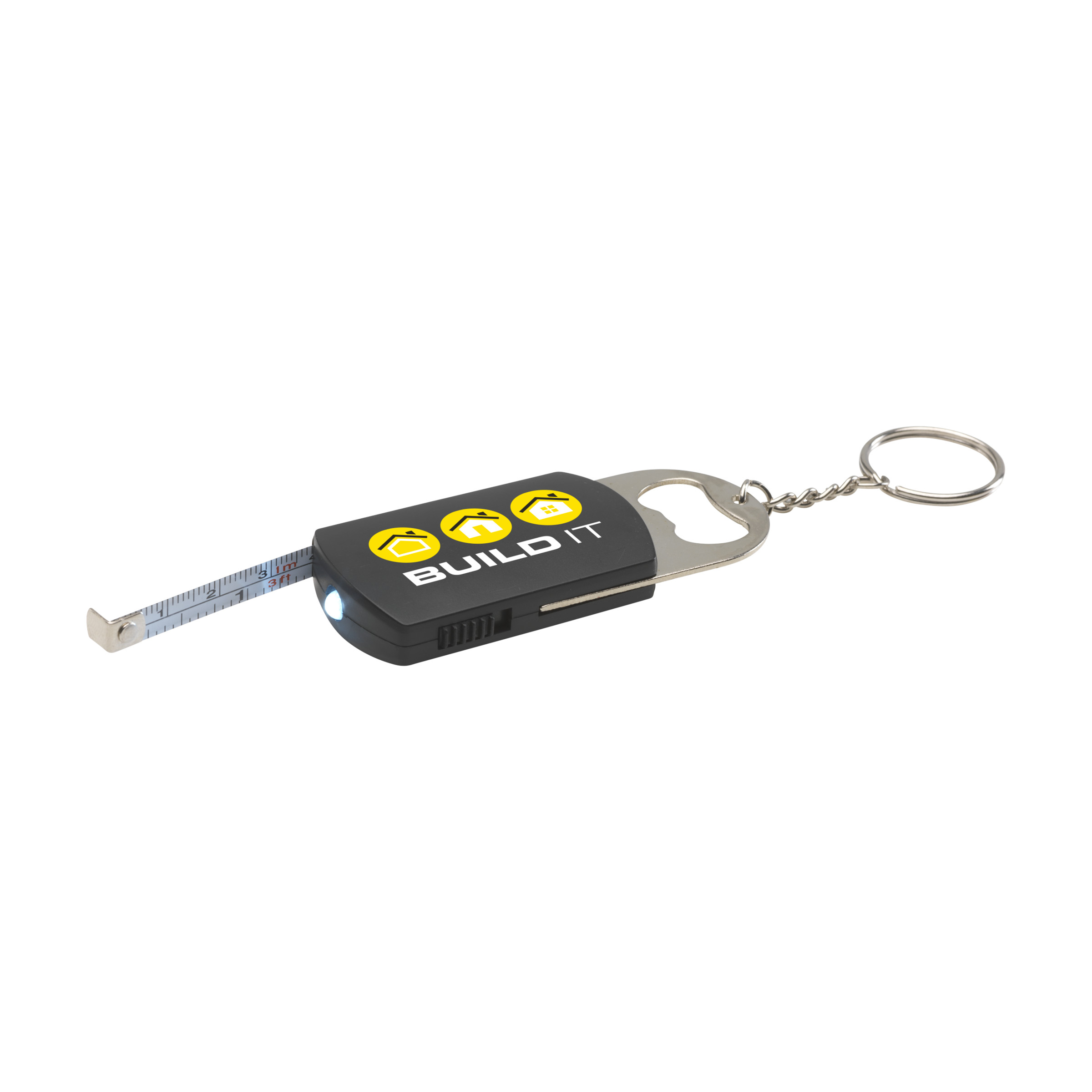 Multifunctional keychain with sturdy keyring, bottle opener, energy efficient LED light and measuring tape showing inches and centimetres (length 100 cm). Batteries incl.