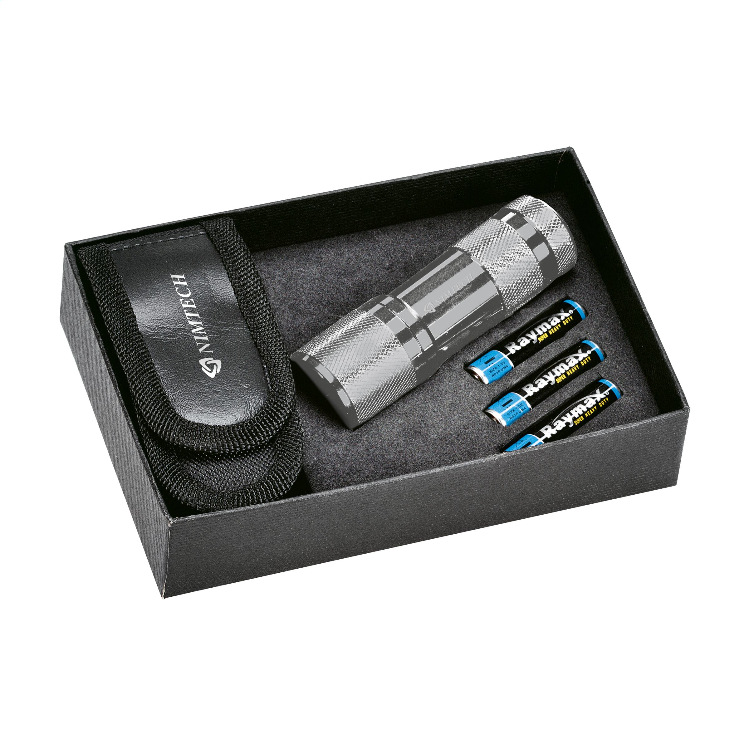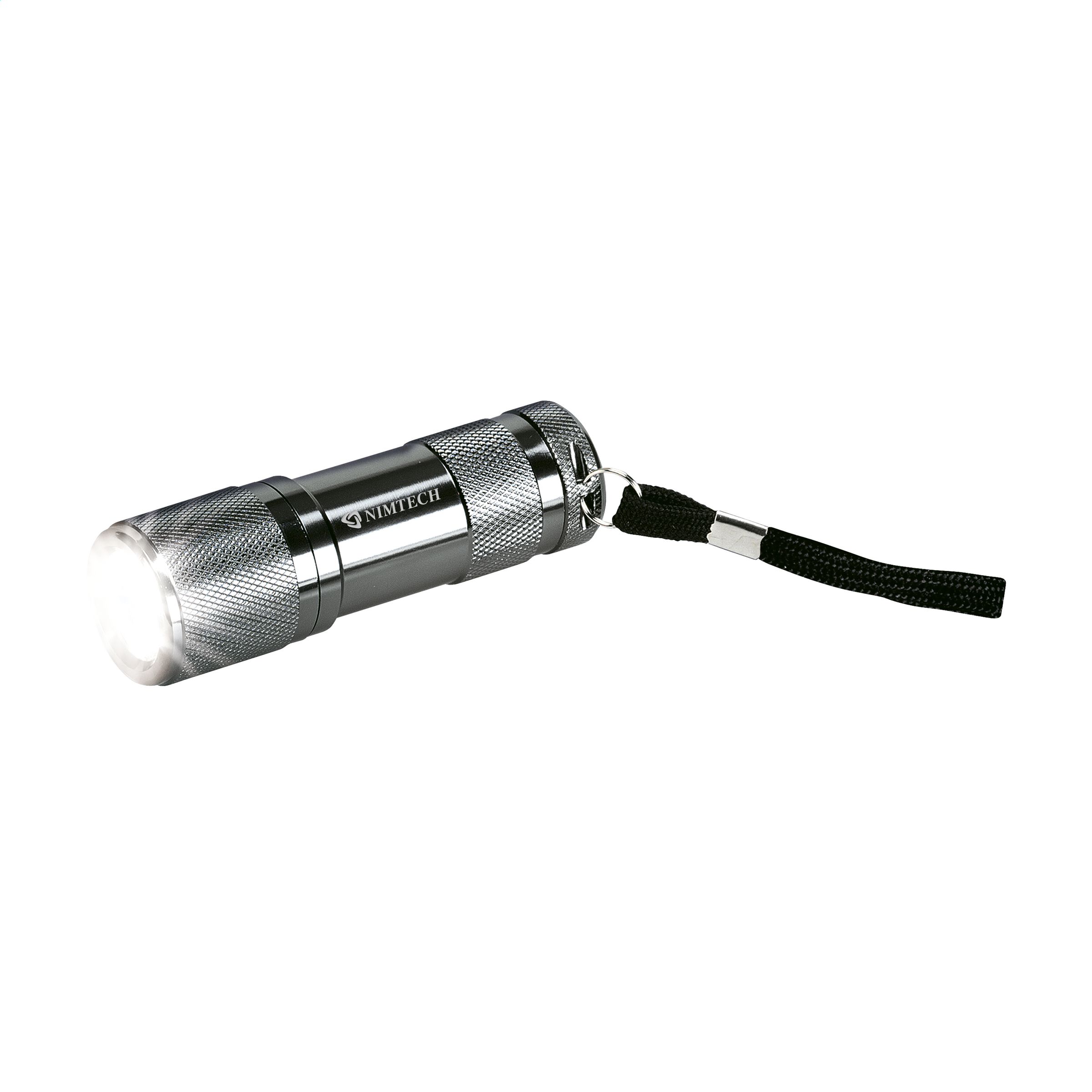 Aluminium pocket torch with a bright white beam from 9 LED lights. Meas. Ø 2 x 9.5 cm. Incl. batteries, detachable wrist strap and nylon case. Each piece in a box.