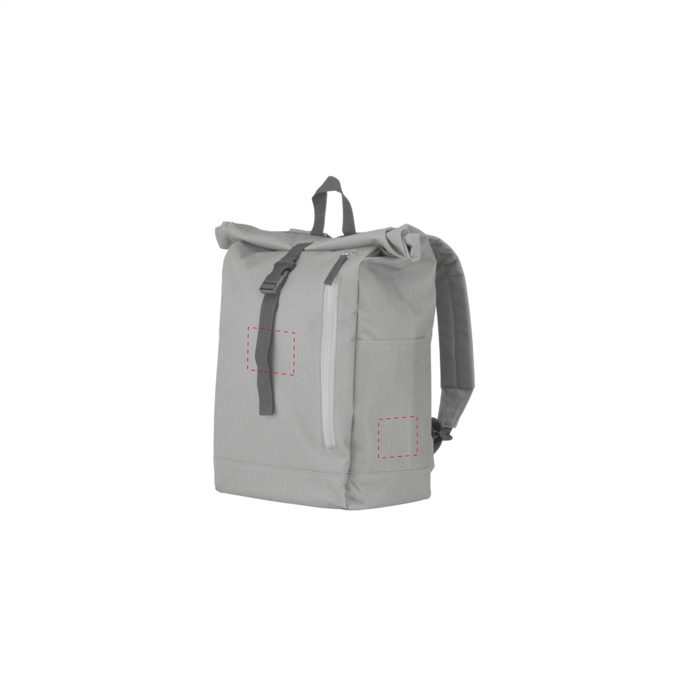 Tough, practical urban backpack made from strong 600D polyester with water-resistant PVC interior, partially nylon lined. The backpack has one large inner compartment, a pocket on both sides and a large zip pocket on the front. With foam back for increased comfort, padded, adjustable shoulder straps and hand loop. With rollable fastening and handy click system. The perfect bag for daily use. Capacity approx. 18 liters.