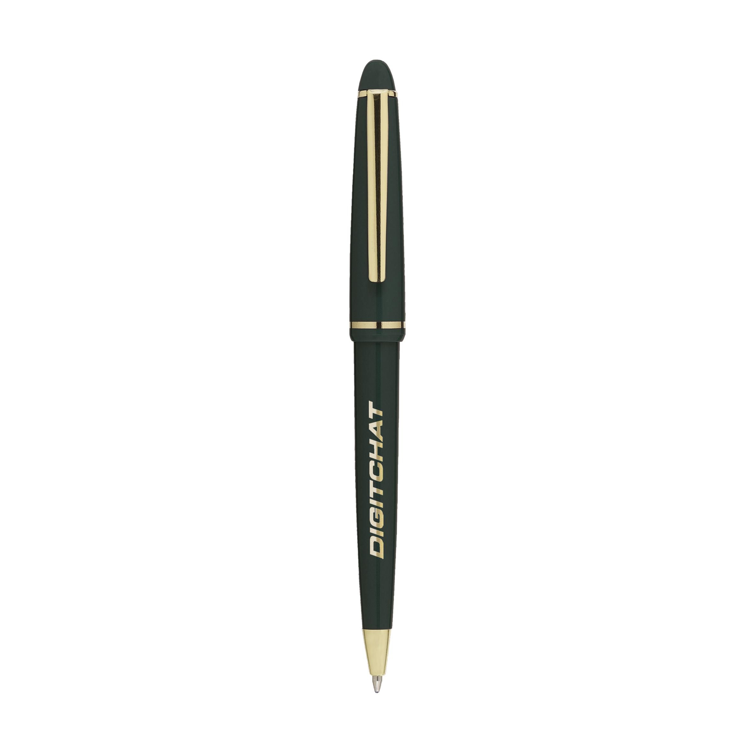 Blue ink ballpoint pen with polished barrel, gilded, ornate clip and point and twist-action tip.
