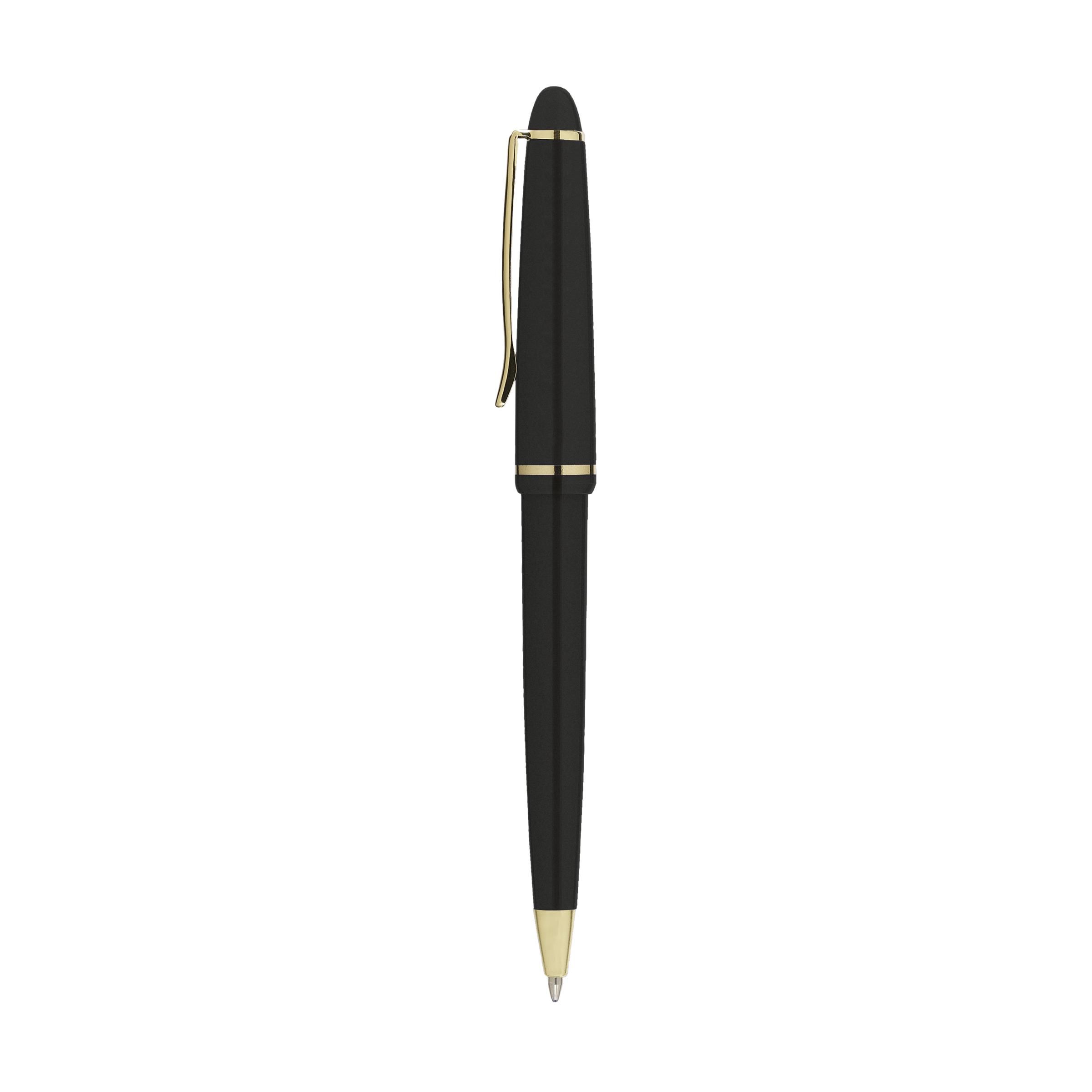 Blue ink ballpoint pen with polished barrel, gilded, ornate clip and point and twist-action tip.