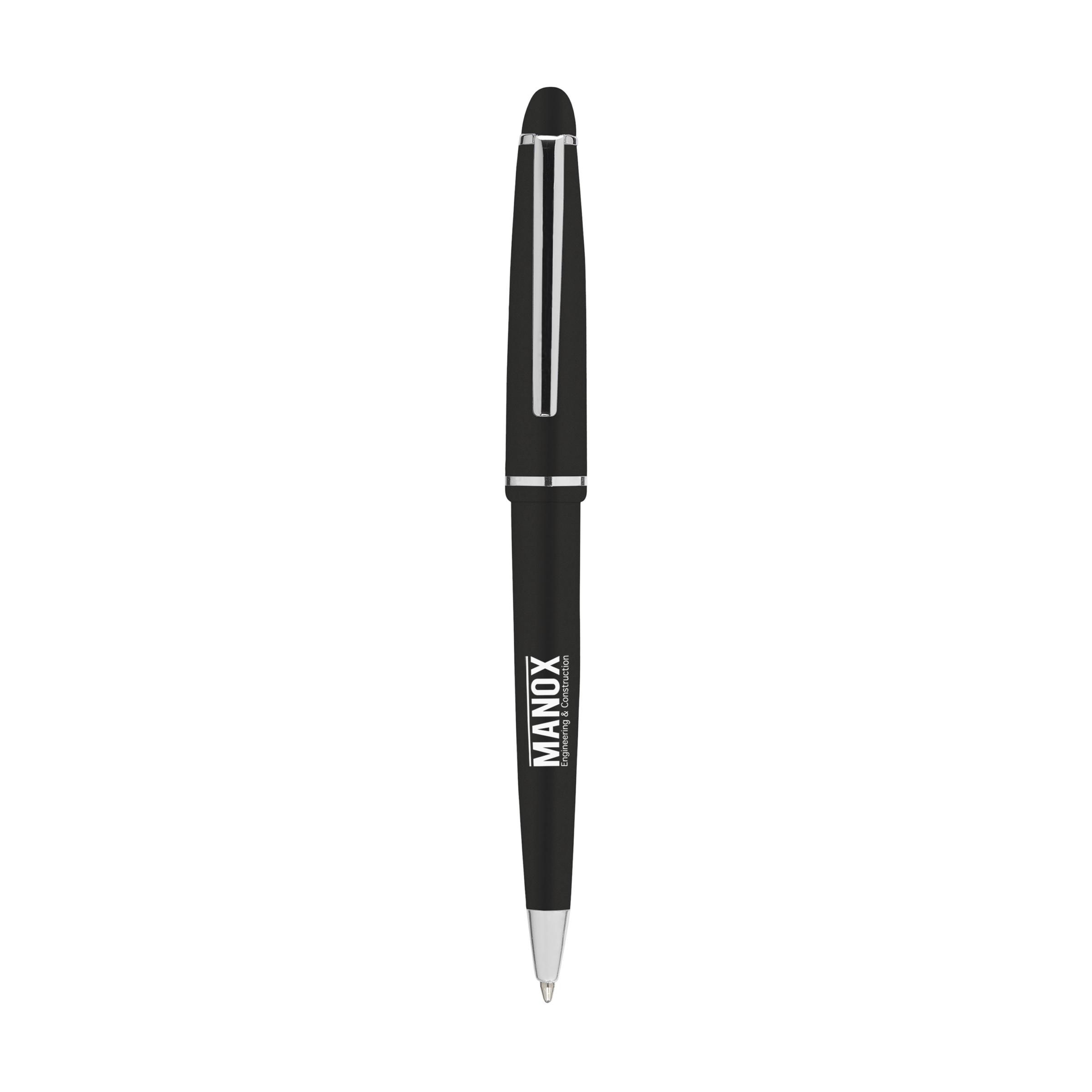 Blue ink ballpoint pen with polished barrel, ornate clip and point and twist-action tip.