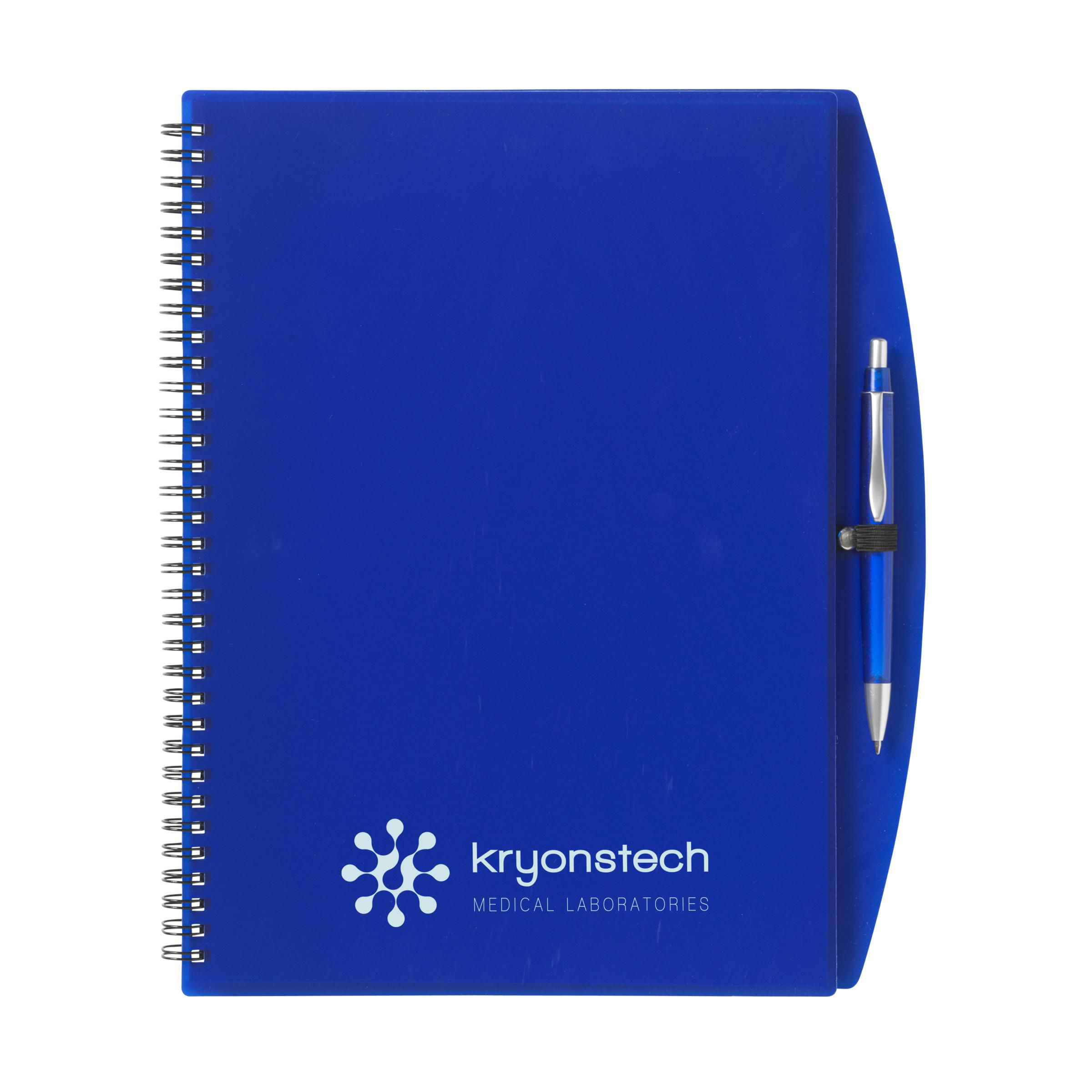 Notebook with approx. 70 sheets of ruled writing paper with transparent plastic cover and metal wire spiral-binding. Incl. blue ink ballpoint pen.