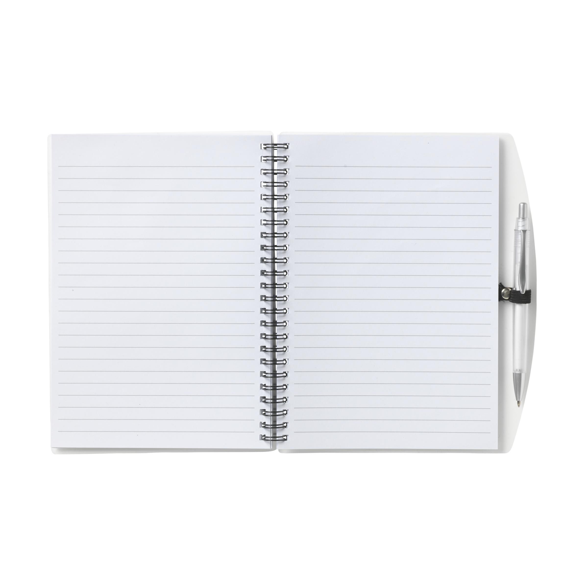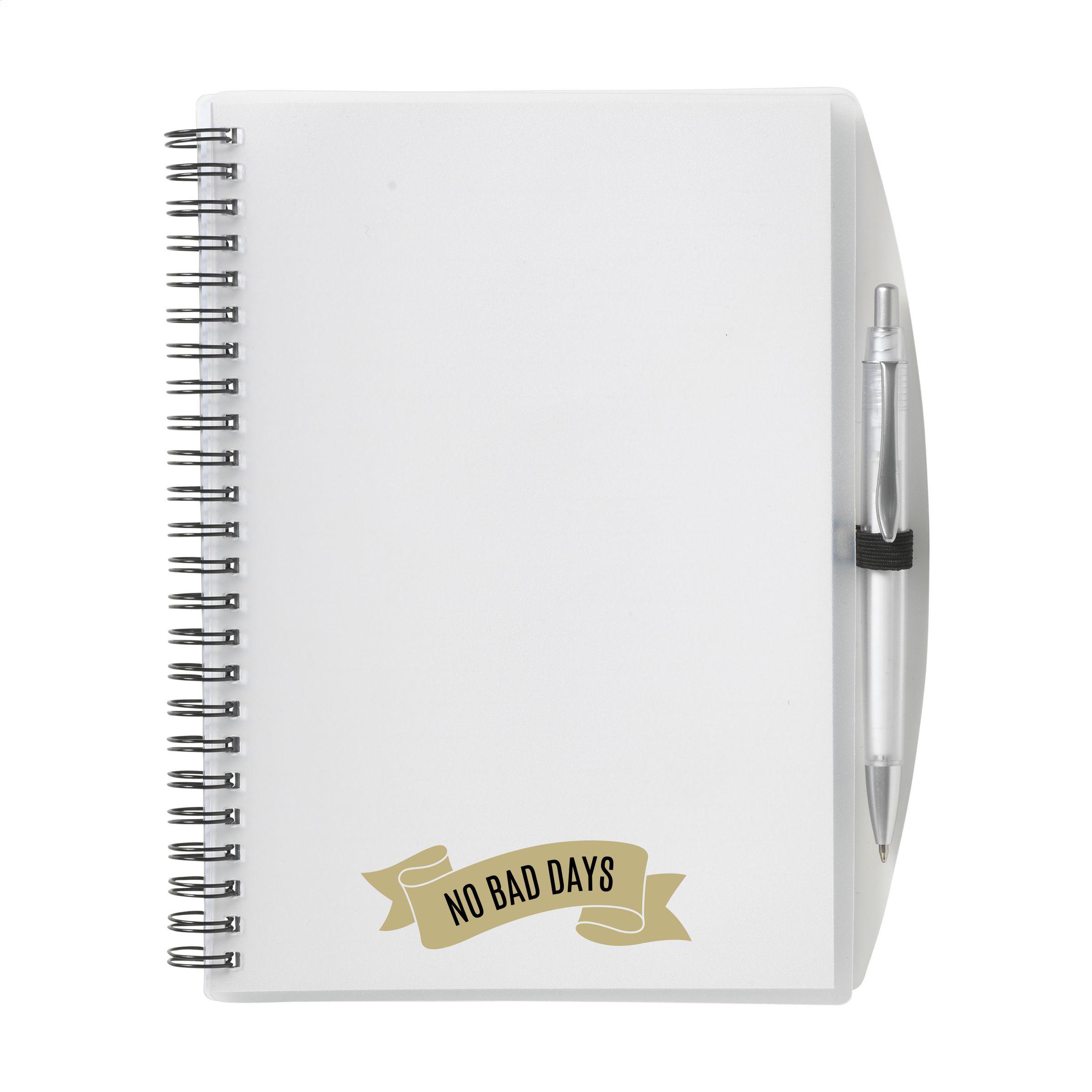 Notebook with approx. 70 sheets of ruled writing paper with transparent plastic cover and metal wire spiral-binding. Incl. blue ink ballpoint pen.