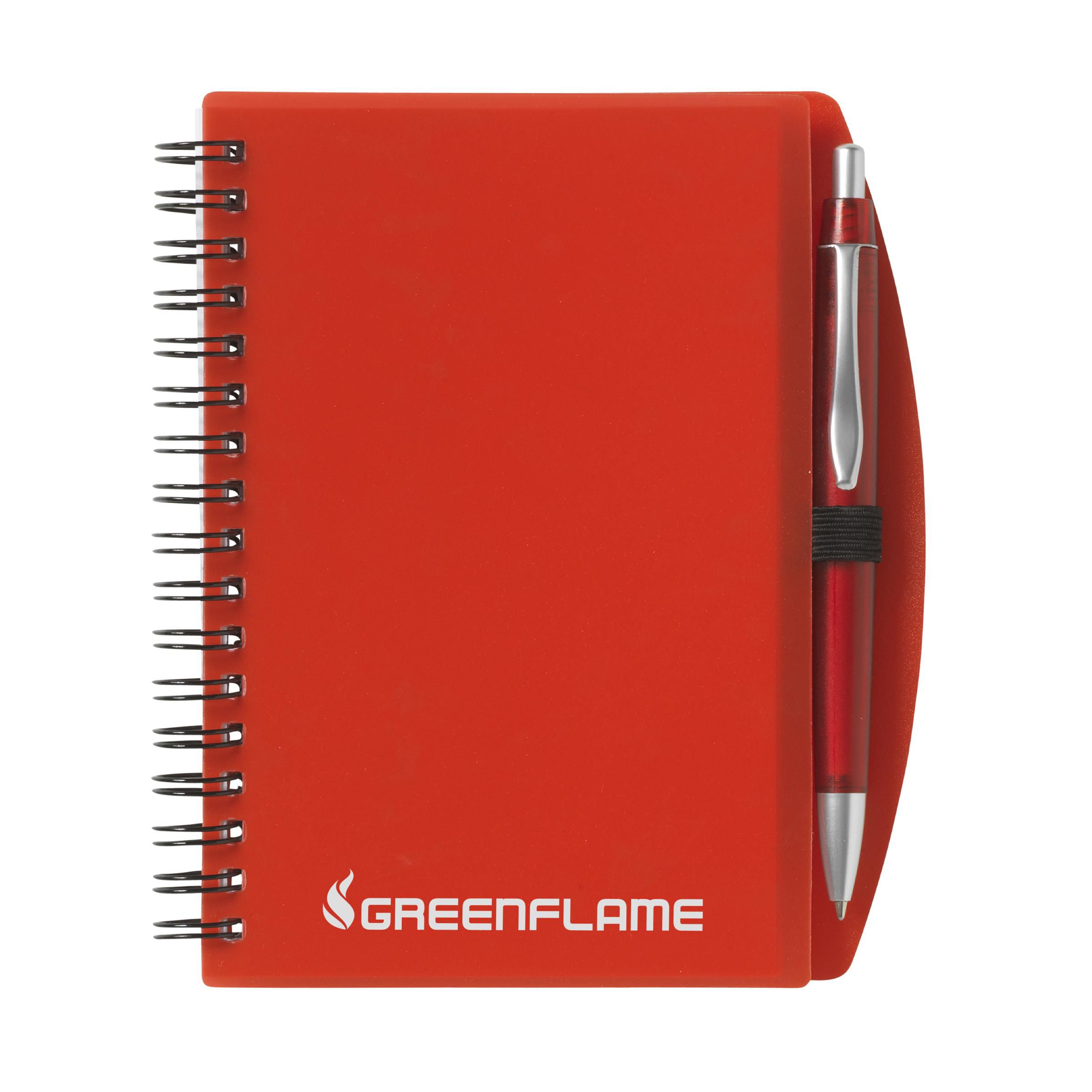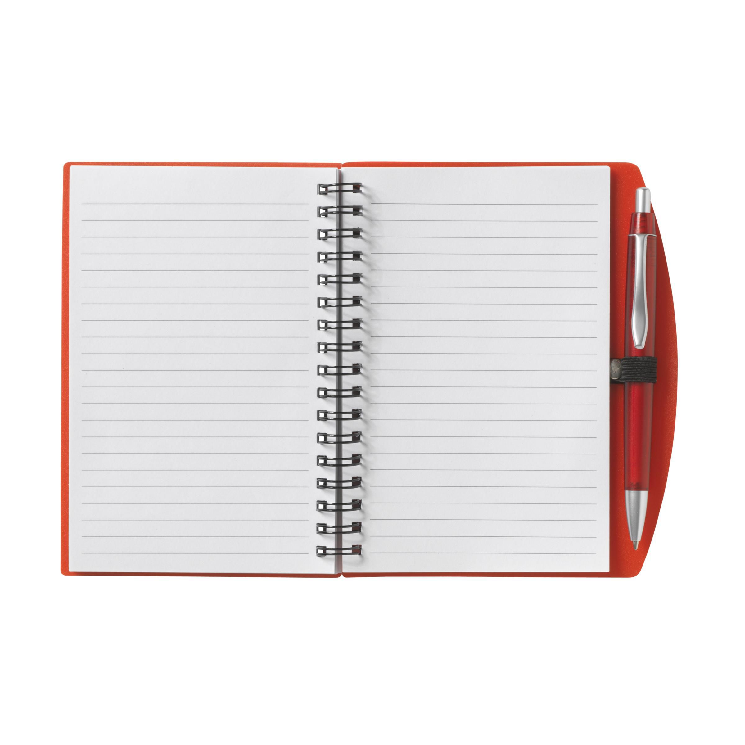 Notebook with approx. 70 sheets of ruled writing paper with transparent plastic cover and metal wire spiral-binding. Incl. blue ink ballpoint pen.