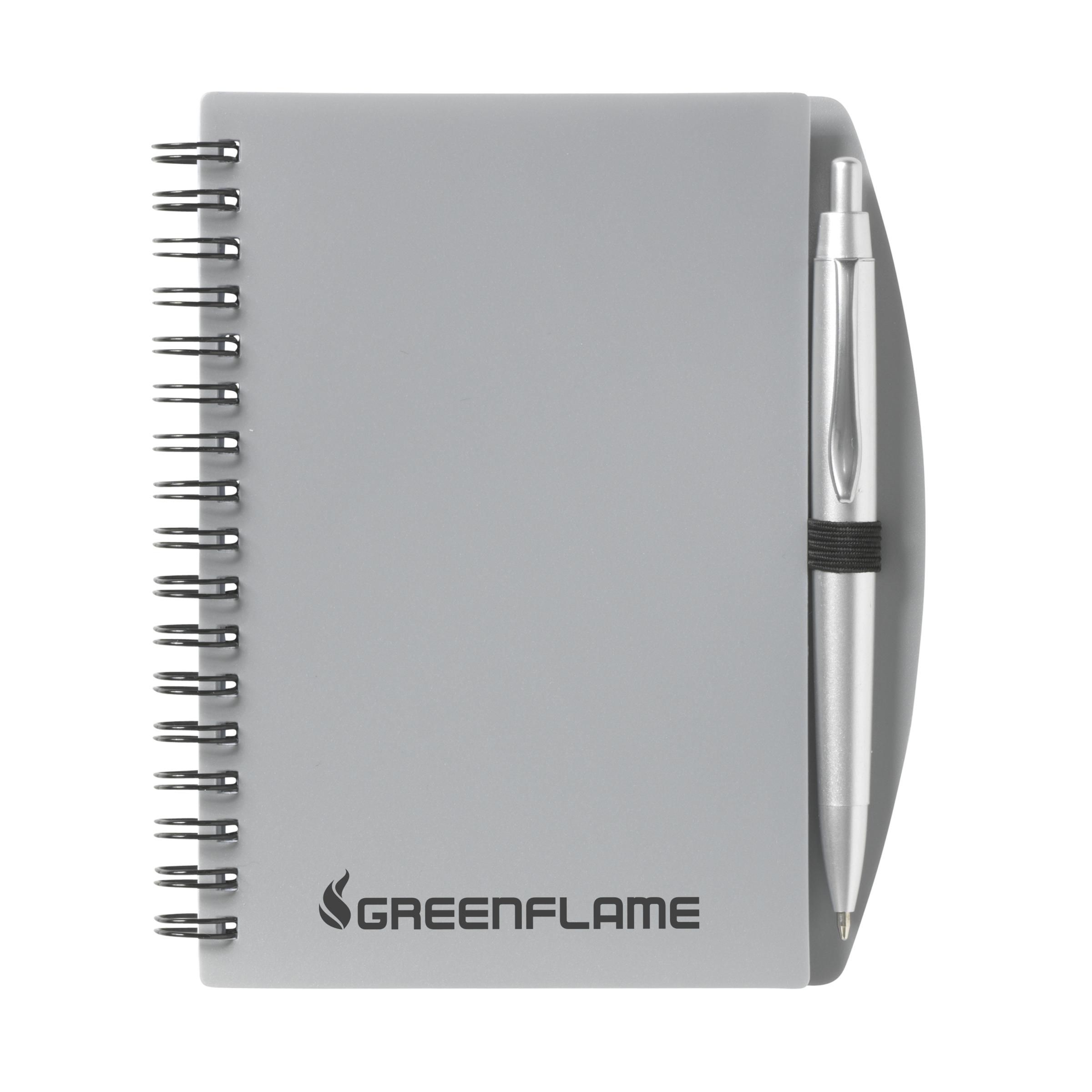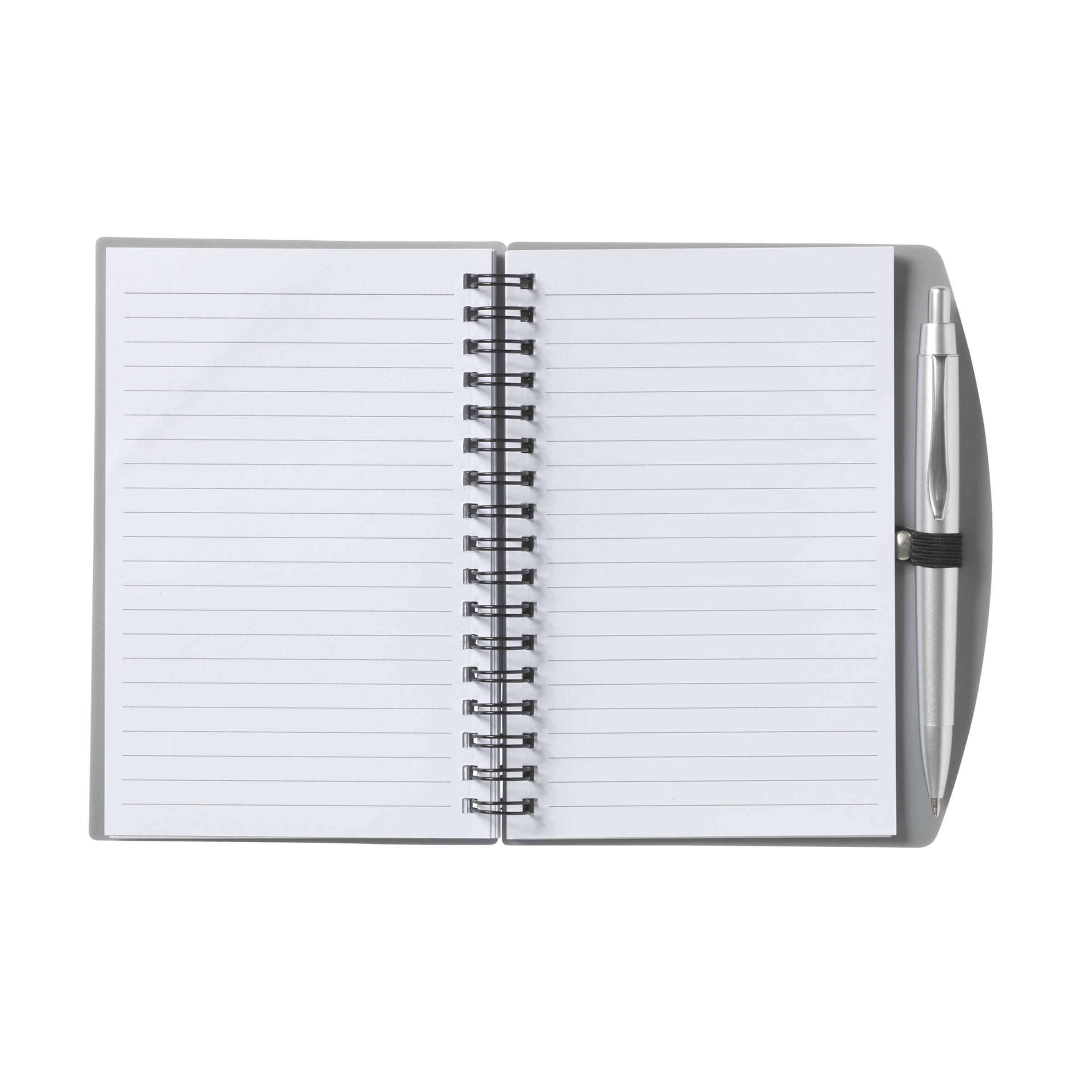 Notebook with approx. 70 sheets of ruled writing paper with transparent plastic cover and metal wire spiral-binding. Incl. blue ink ballpoint pen.