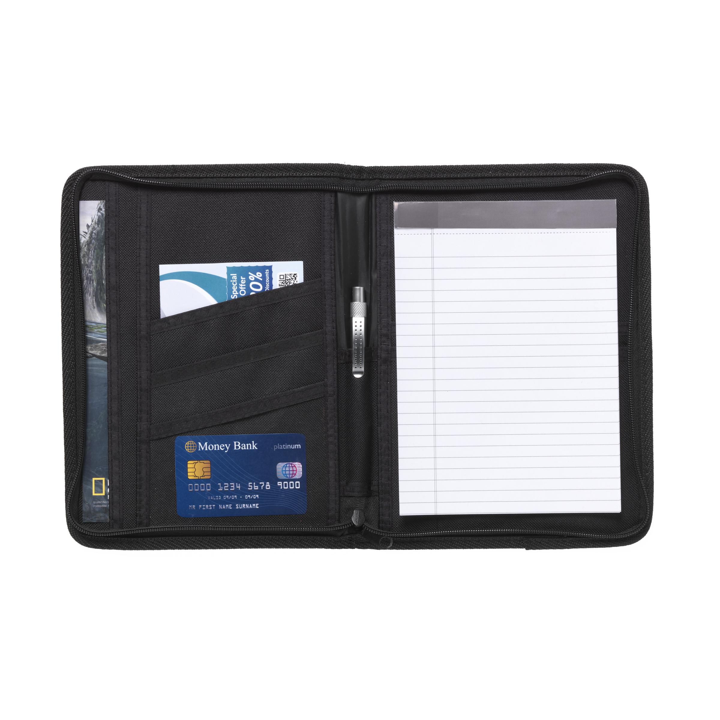Conference/document folder made of 600D polyester/imitation leather in A5 format. With pockets and zip closure. Incl. writing pad and ballpoint pen.