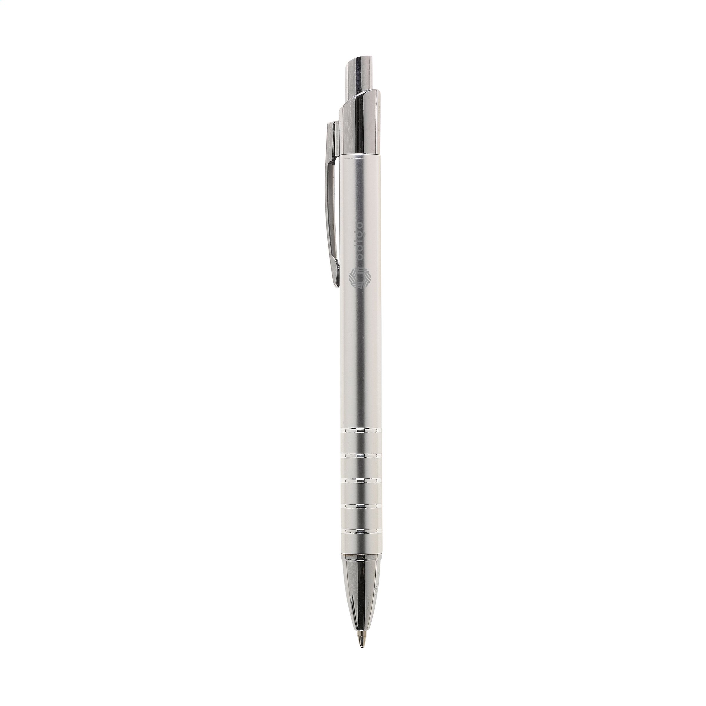 Blue ink, aluminium ballpoint pen in metallic look, with metal clip and trims.
