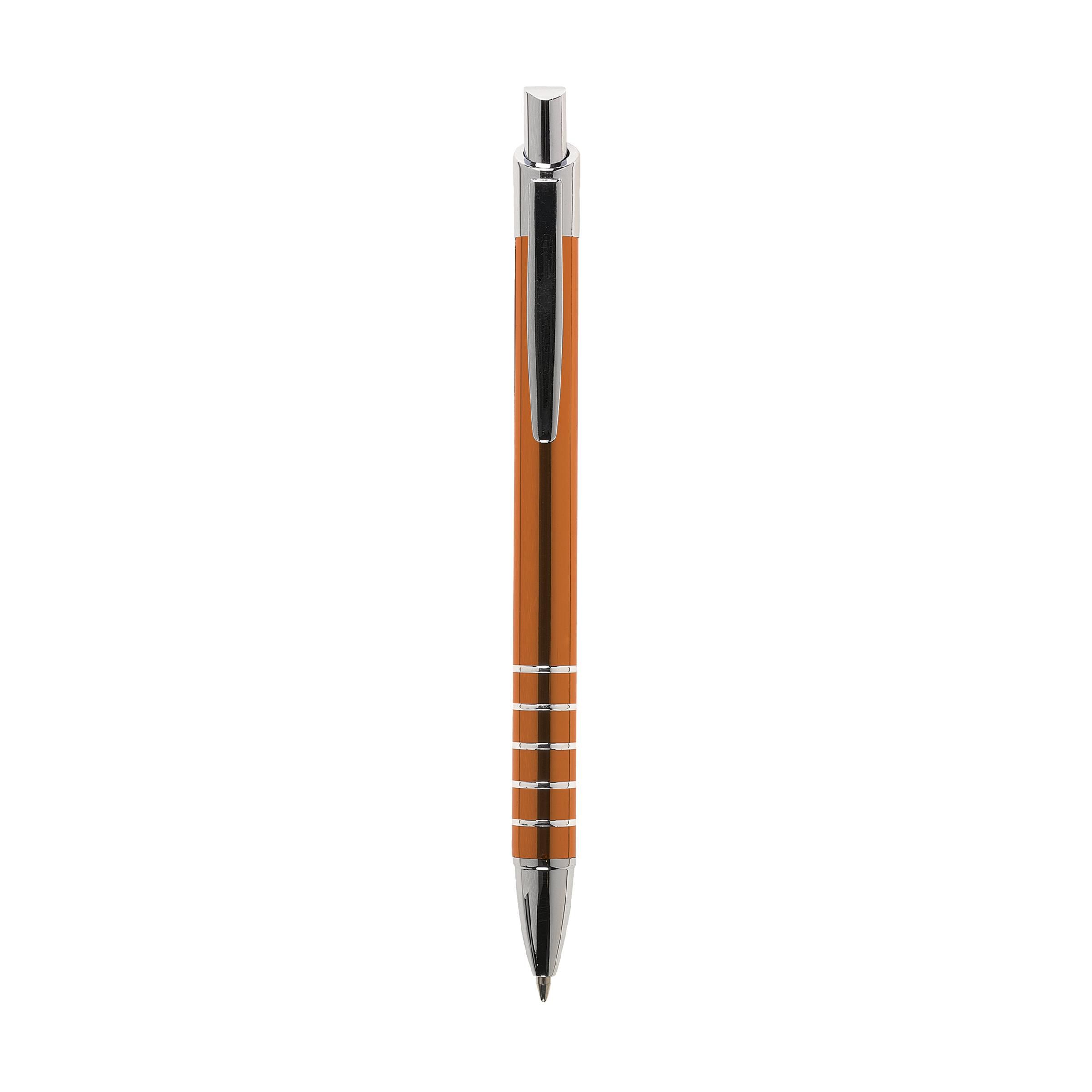 Blue ink, aluminium ballpoint pen in metallic look, with metal clip and trims.