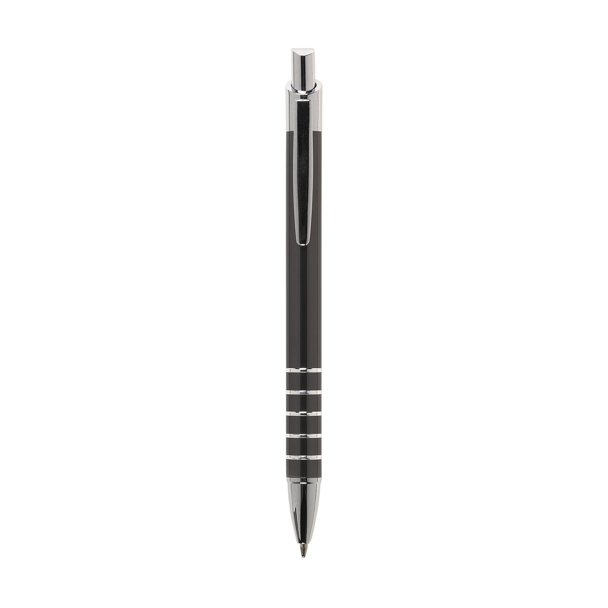 Blue ink, aluminium ballpoint pen in metallic look, with metal clip and trims.