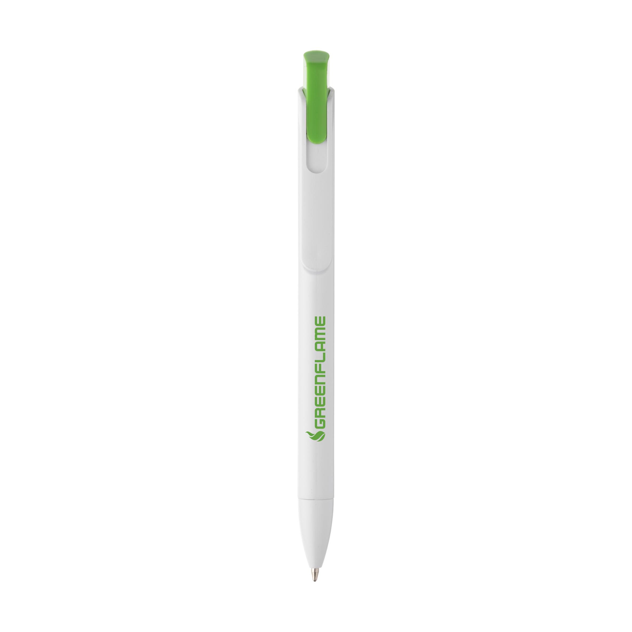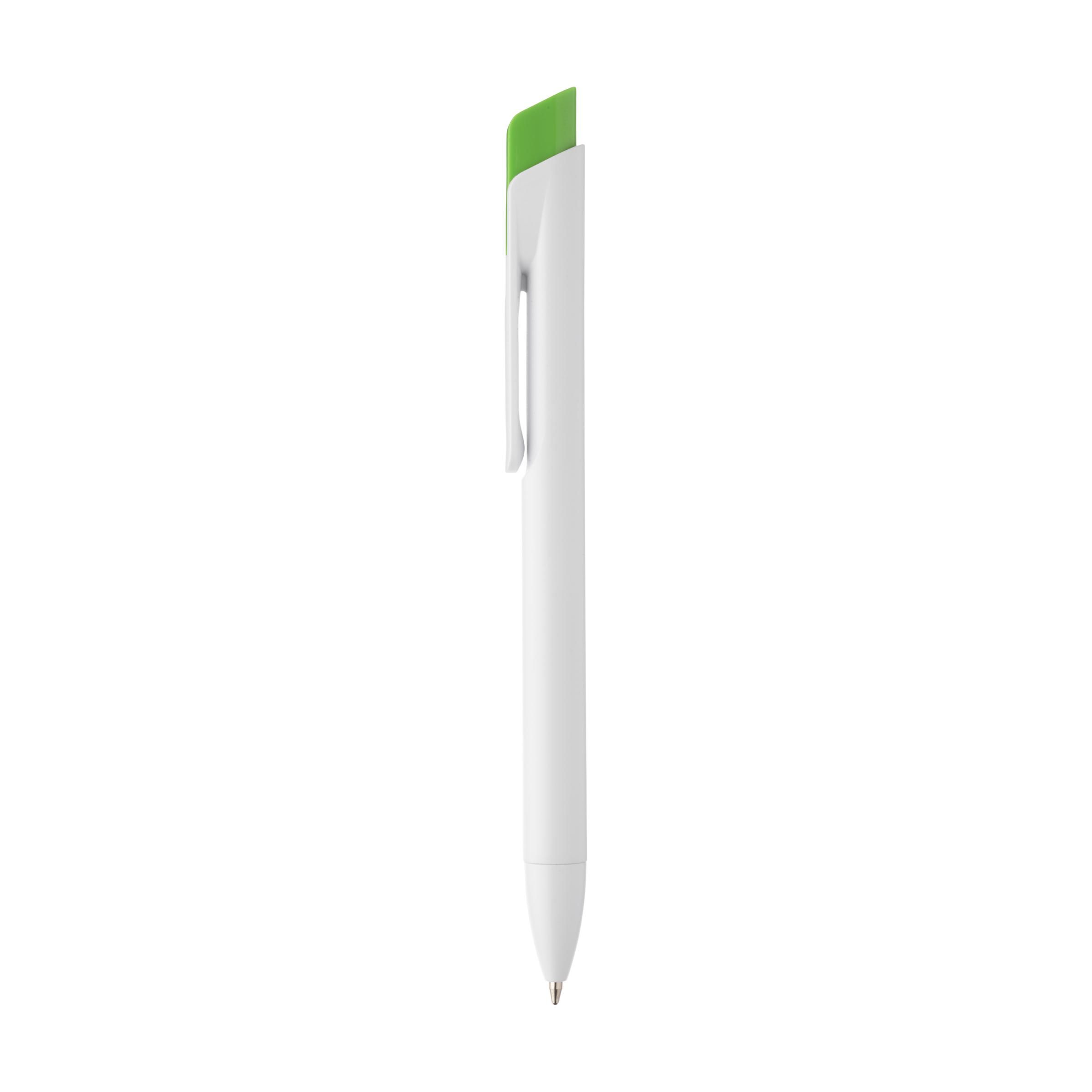Blue ink ballpoint pen with matte finish. With clip and push button that fit perfectly together.