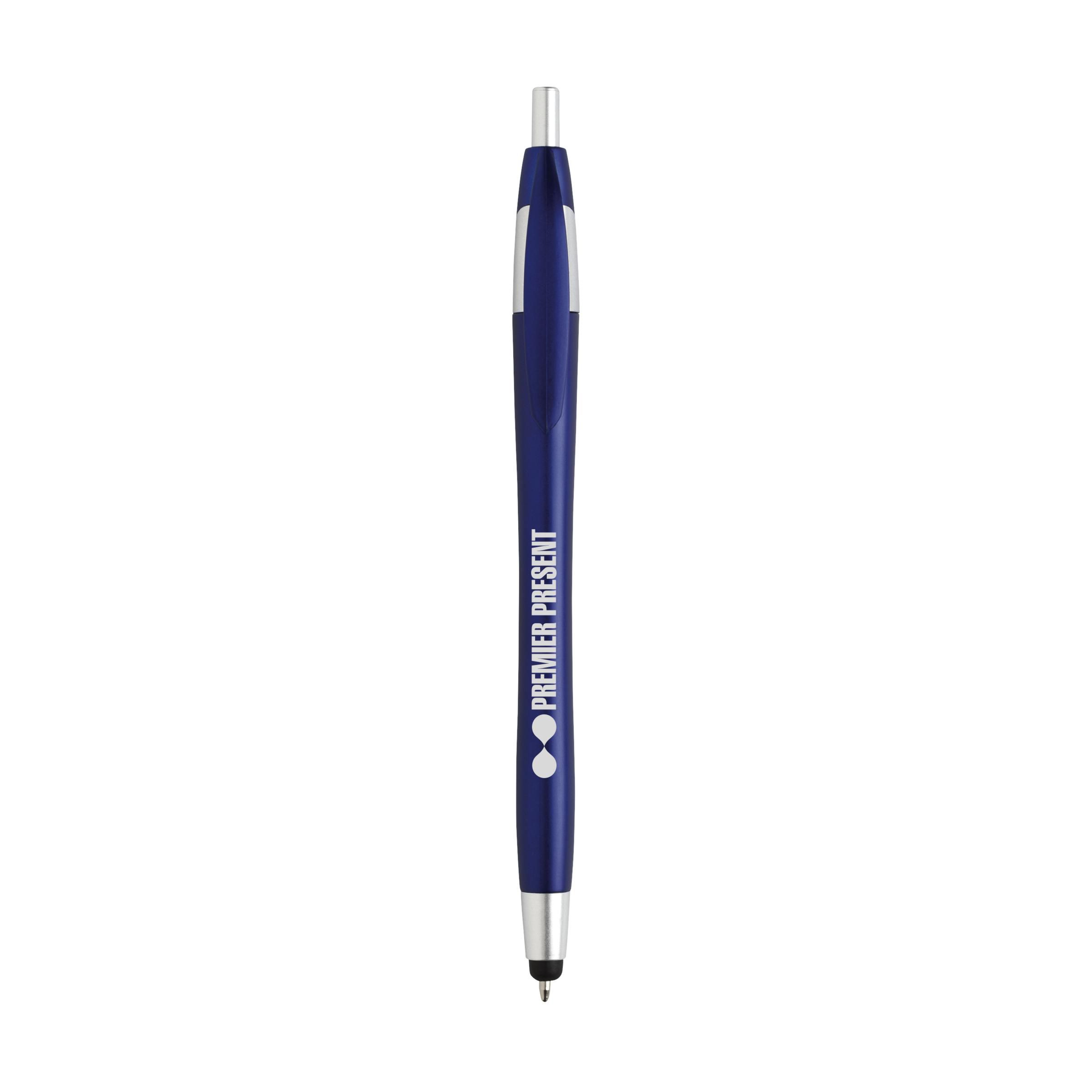 Blue ink, lightweight, metallic look ballpoint pen with rubber top/pointer to operate touch screens (eg iPhone / iPad), push button and streamlined holder.