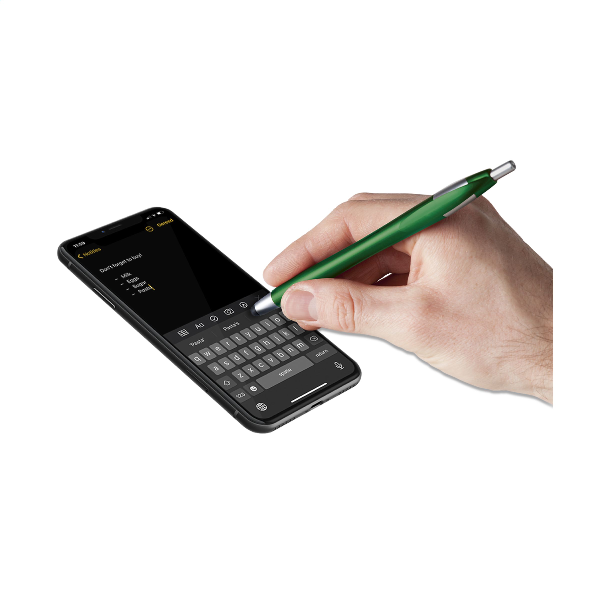 Blue ink, lightweight, metallic look ballpoint pen with rubber top/pointer to operate touch screens (eg iPhone / iPad), push button and streamlined holder.