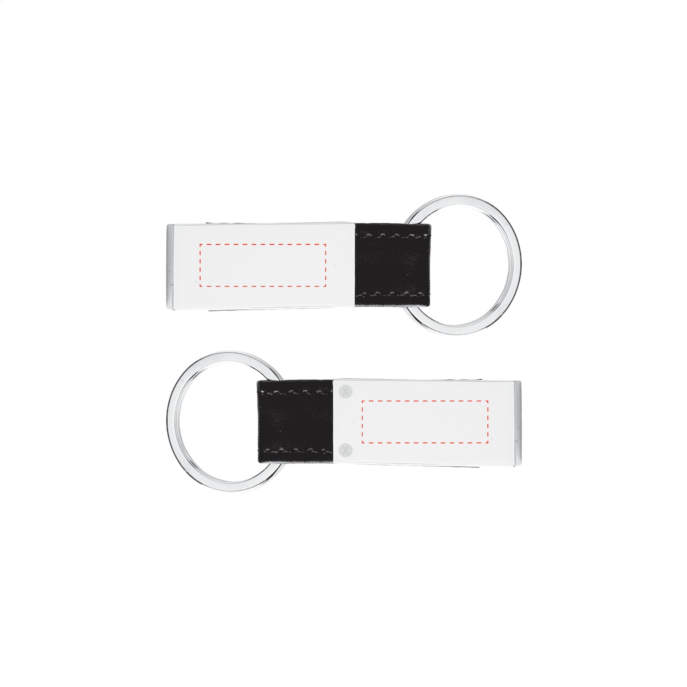 Metal keychain combined with black PU leather look material. On sturdy keyring. Each piece in a box.