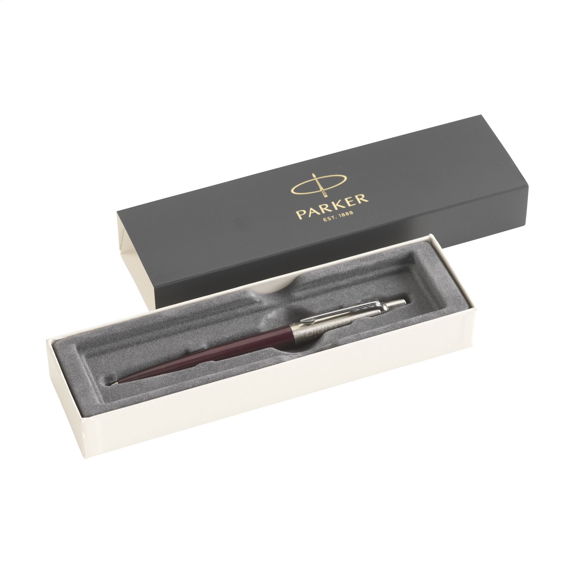 Blue ink Parker ballpoint pen with matte stainless steel barrel. With high gloss push button, clip and rotating point. 2 year warranty. In a Parker case.