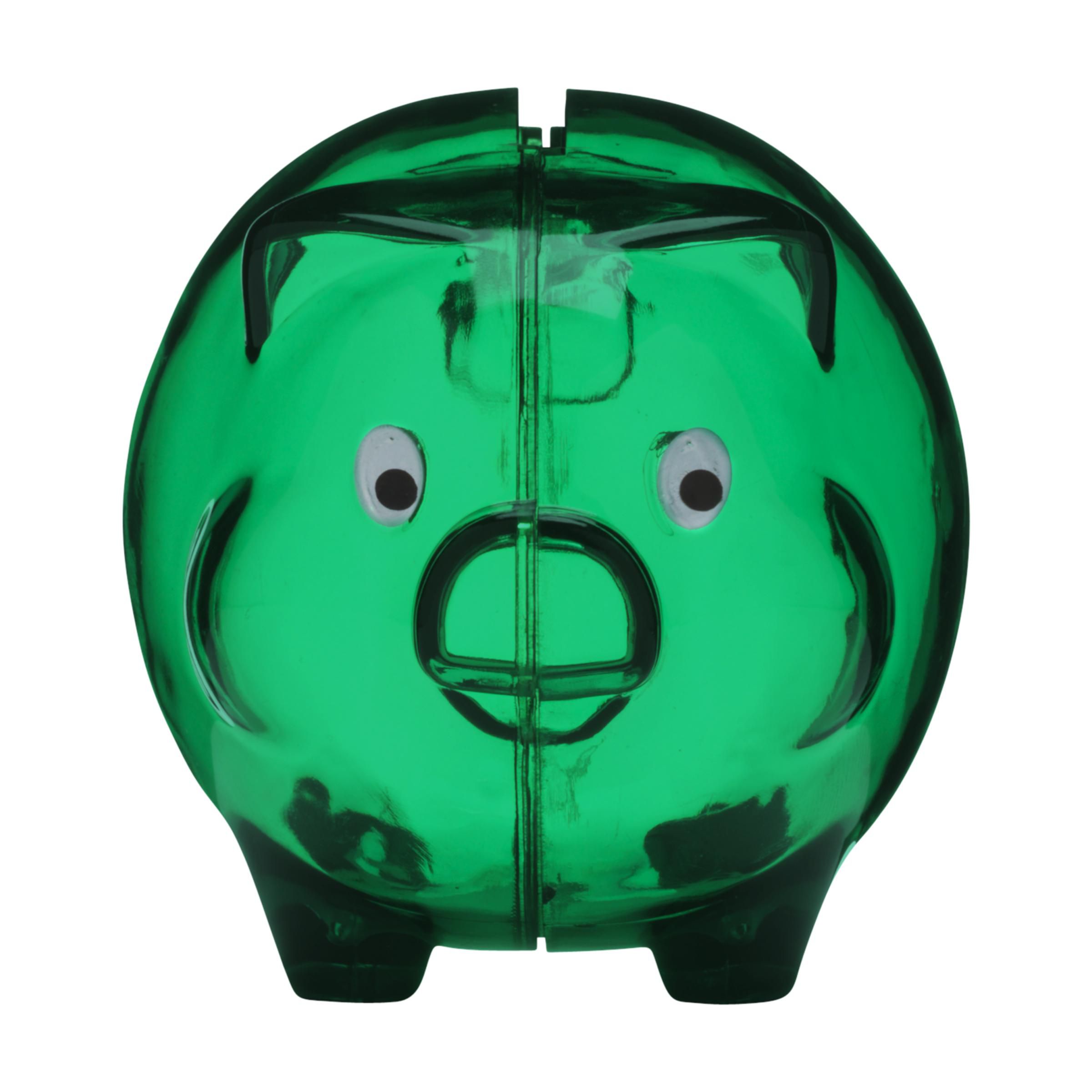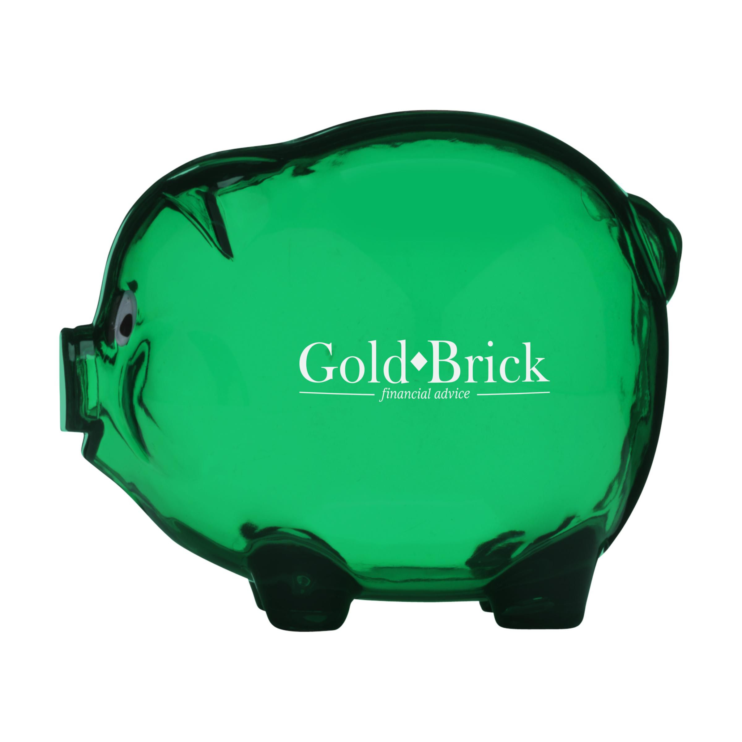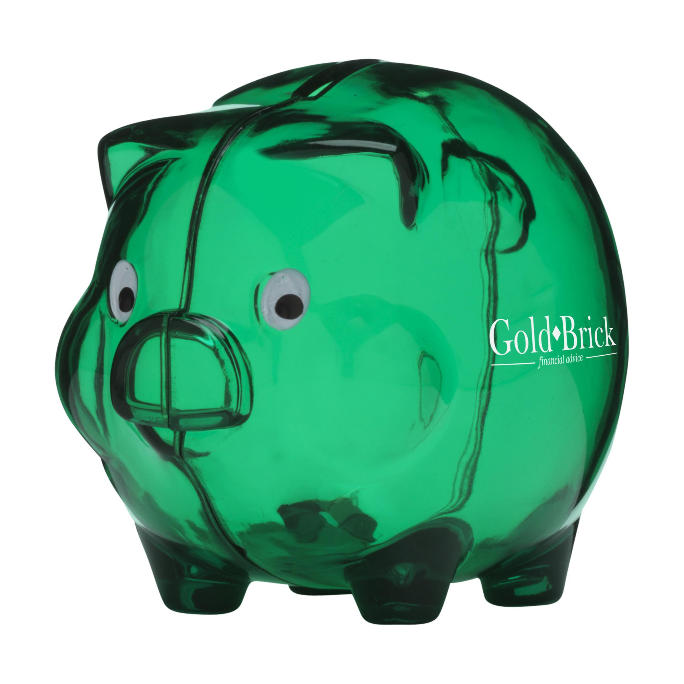 Colourful translucent piggy bank. No lockable opening. Each piece in a box.