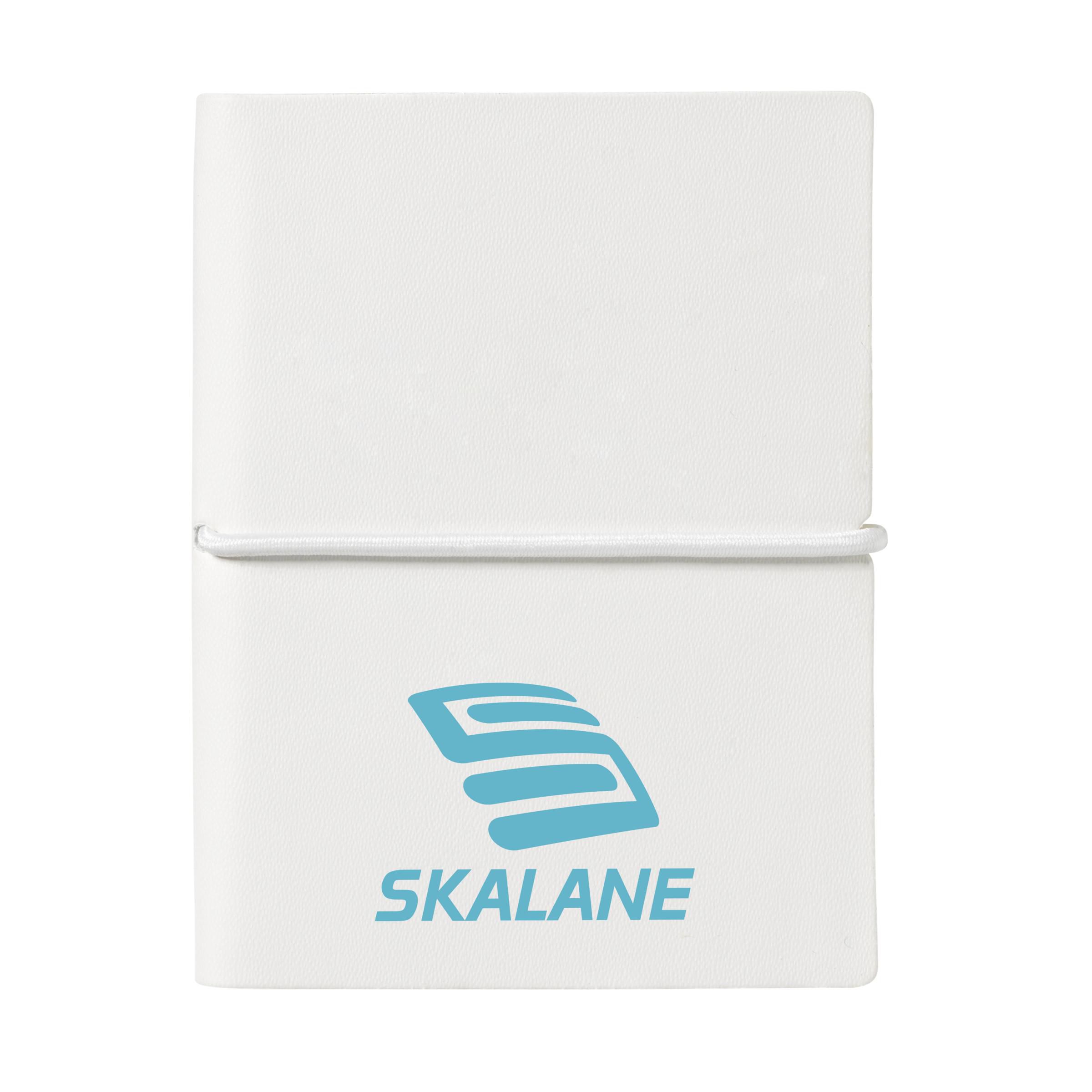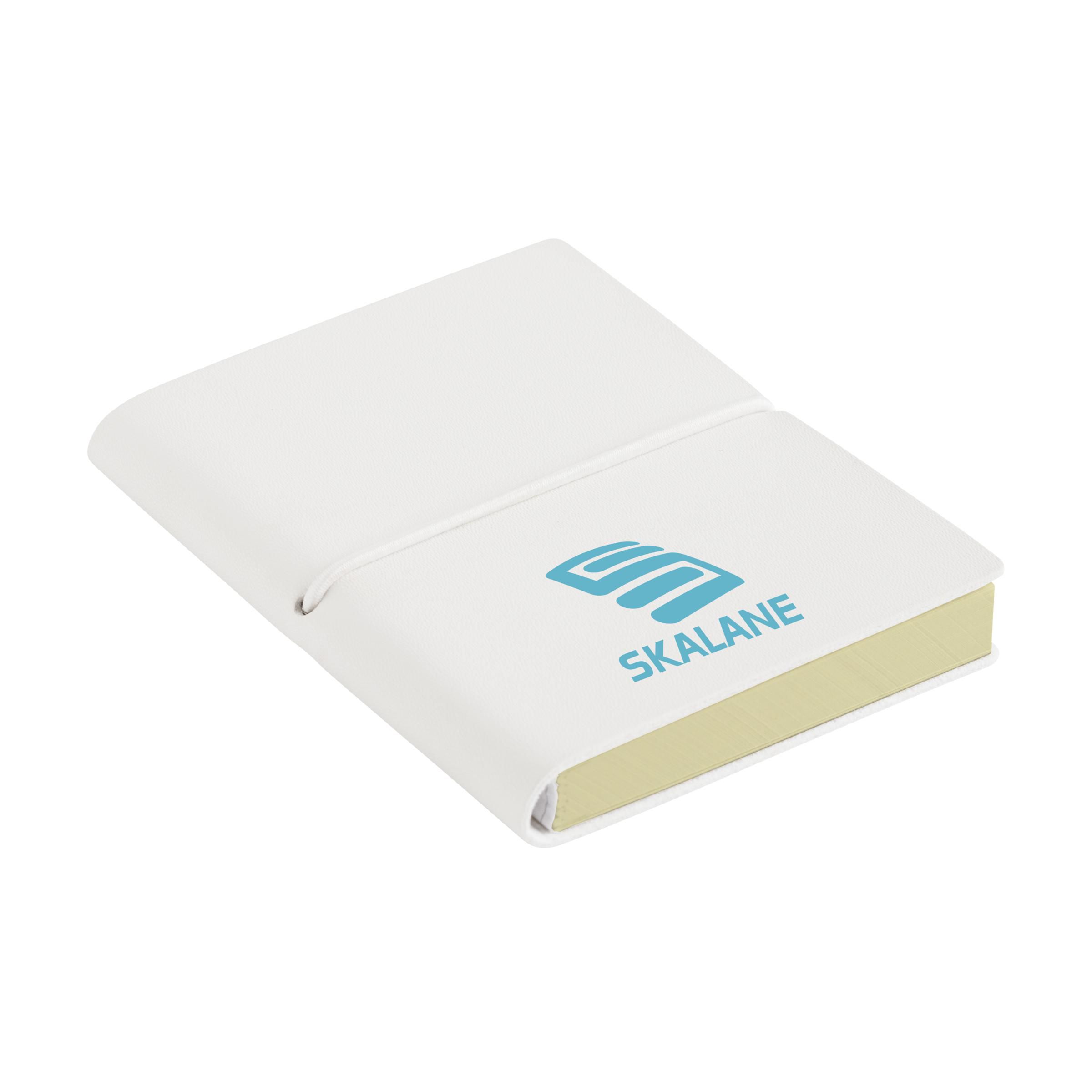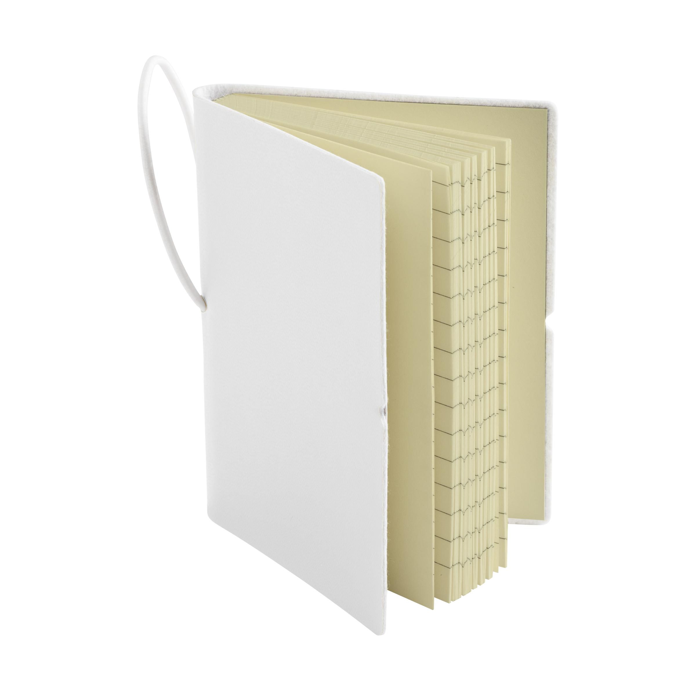 Compact notebook in A7 format. 96 sheets of lined, cream coloured paper, a hard cover and an elastic fastener.
