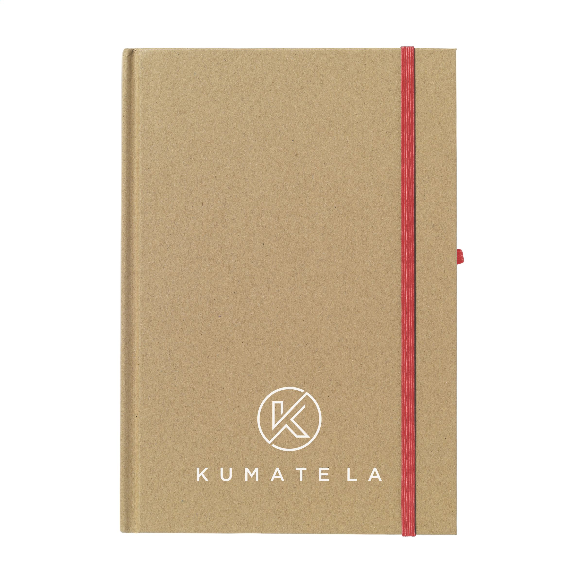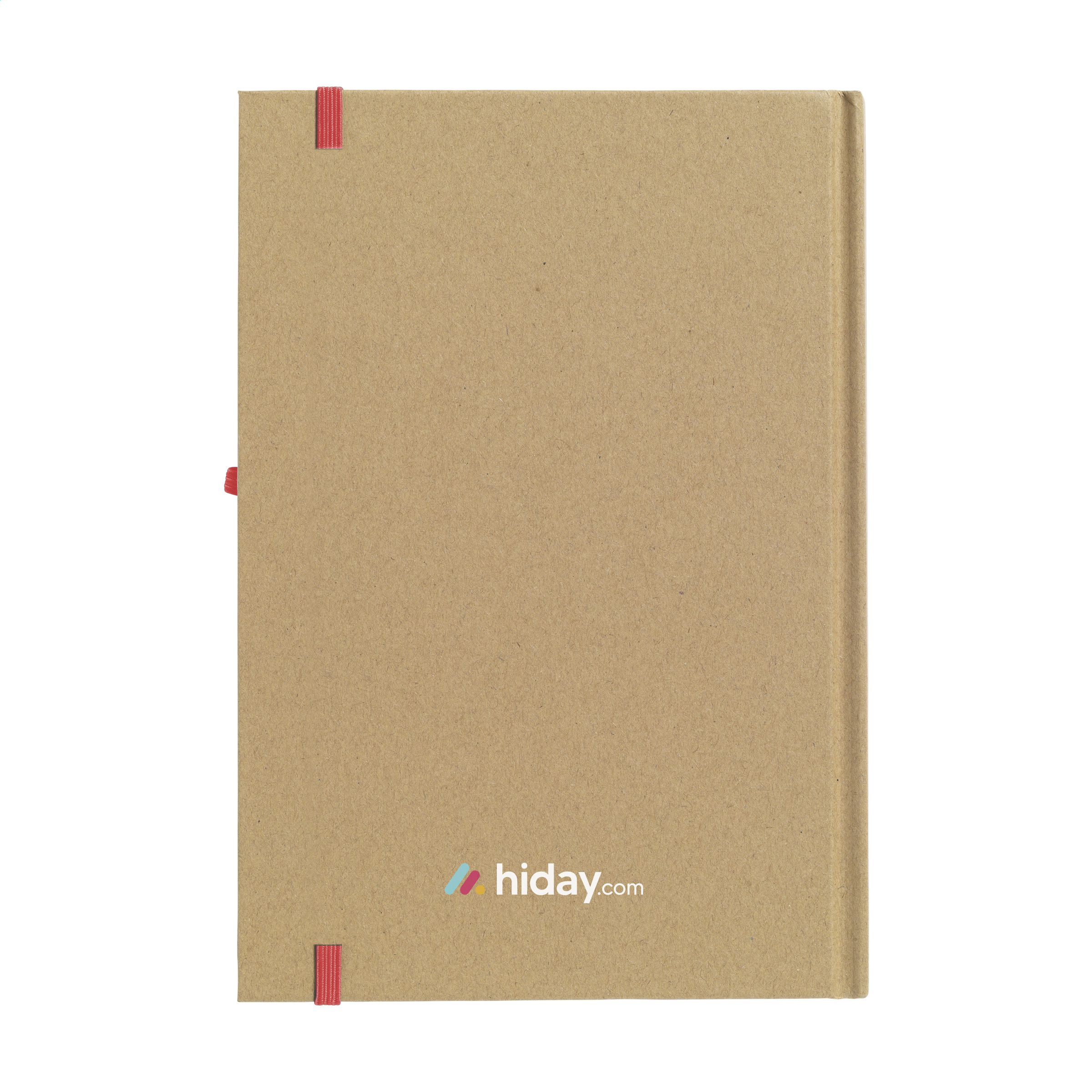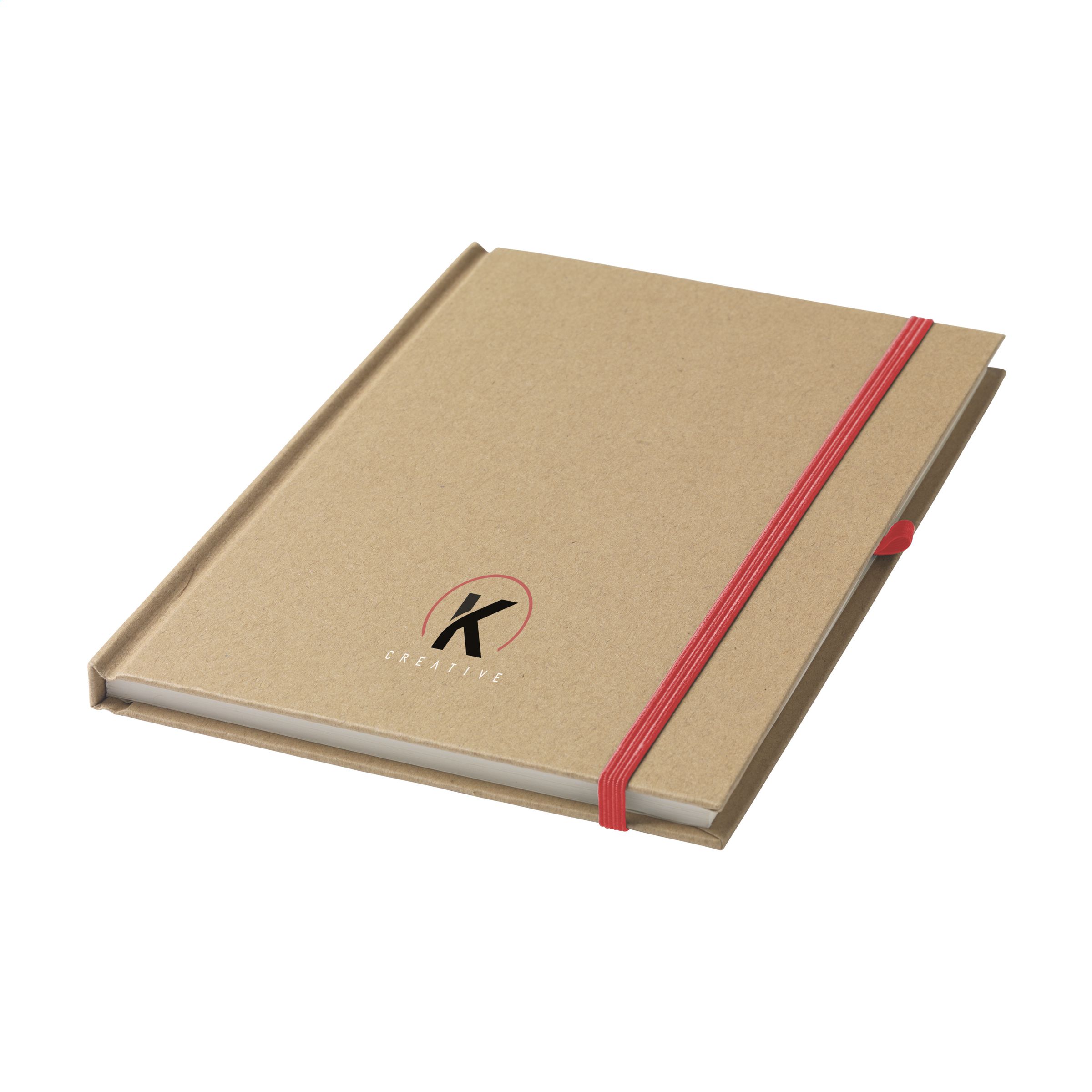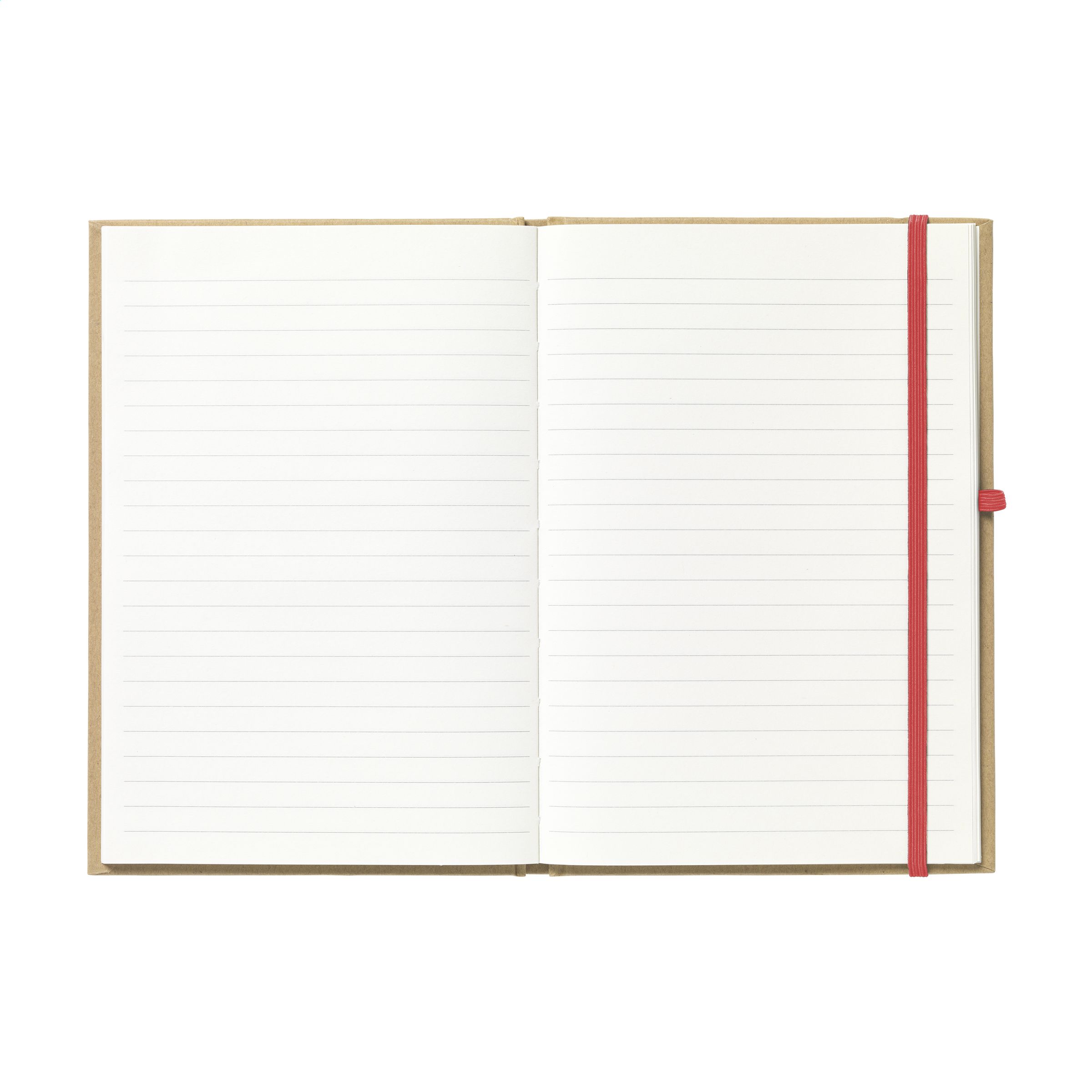 Environmentally friendly, A5 size notebook made of recycled material. With approx. 80 sheets of cream-coloured, lined paper, handy pen loop and elastic closure.
