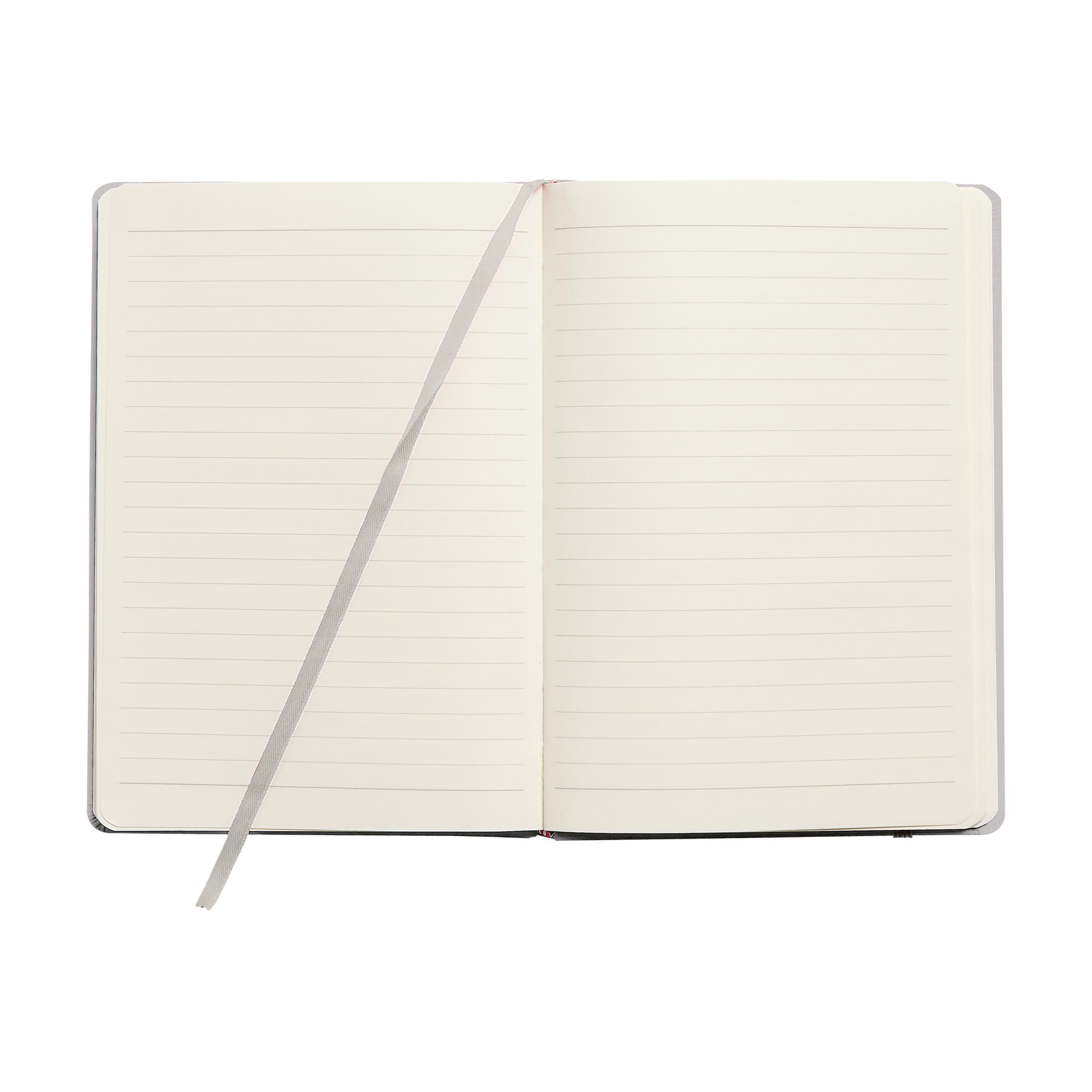 Notebook in A4 format with 96 pages of cream coloured, lined paper, hard cover, elastic fastener and silk ribbon.