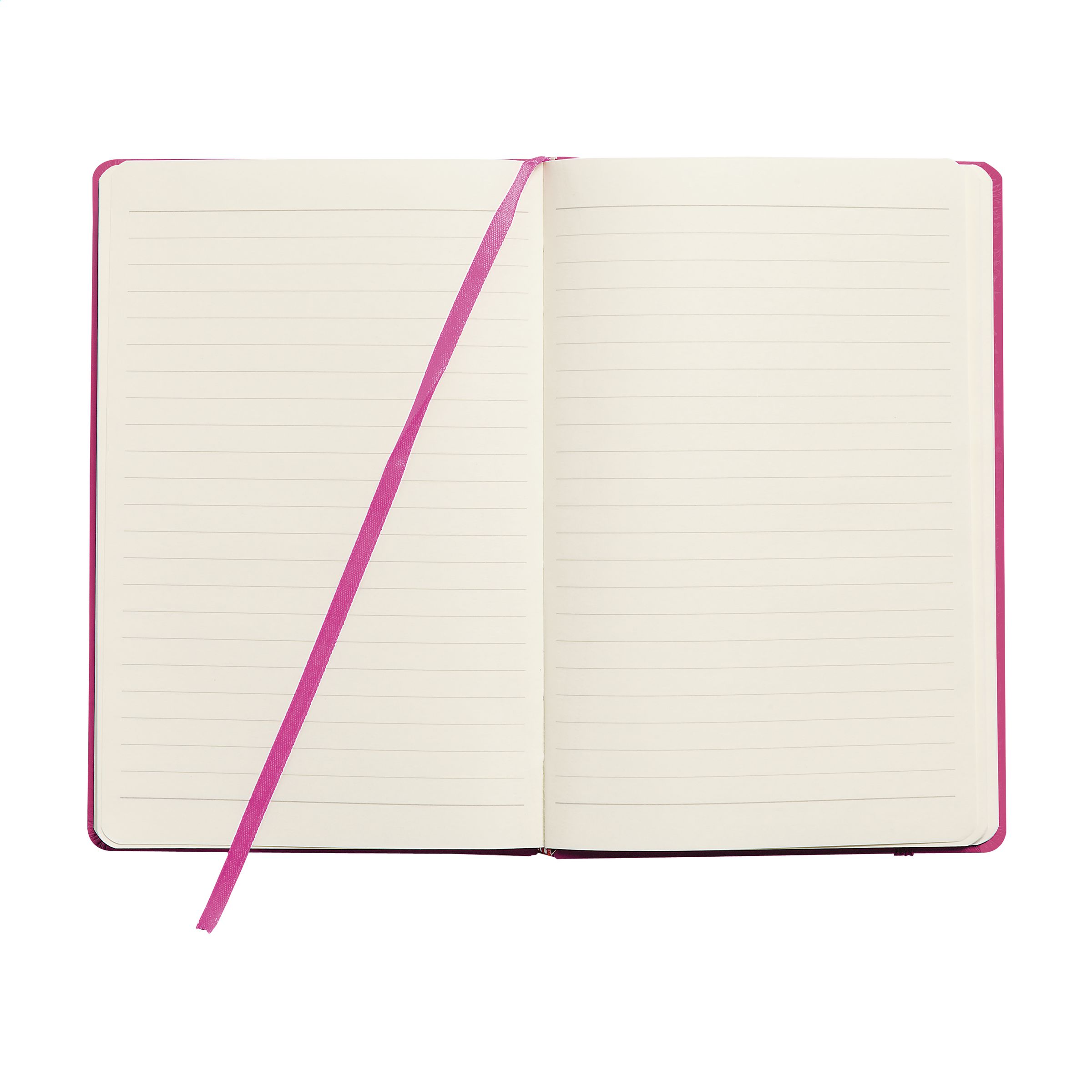 Notebook in A5 format with 96 pages cream coloured, lined paper (80 g/m²). With a perfect binding, hard cover, pocket, elastic fastener and silk ribbon.