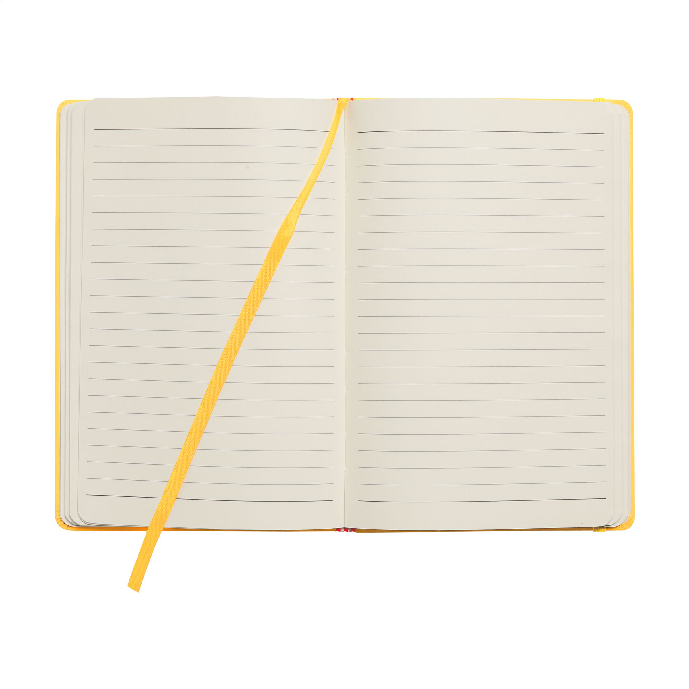 Notebook in A5 format with 96 pages cream coloured, lined paper (80 g/m²). With a perfect binding, hard cover, pocket, elastic fastener and silk ribbon.