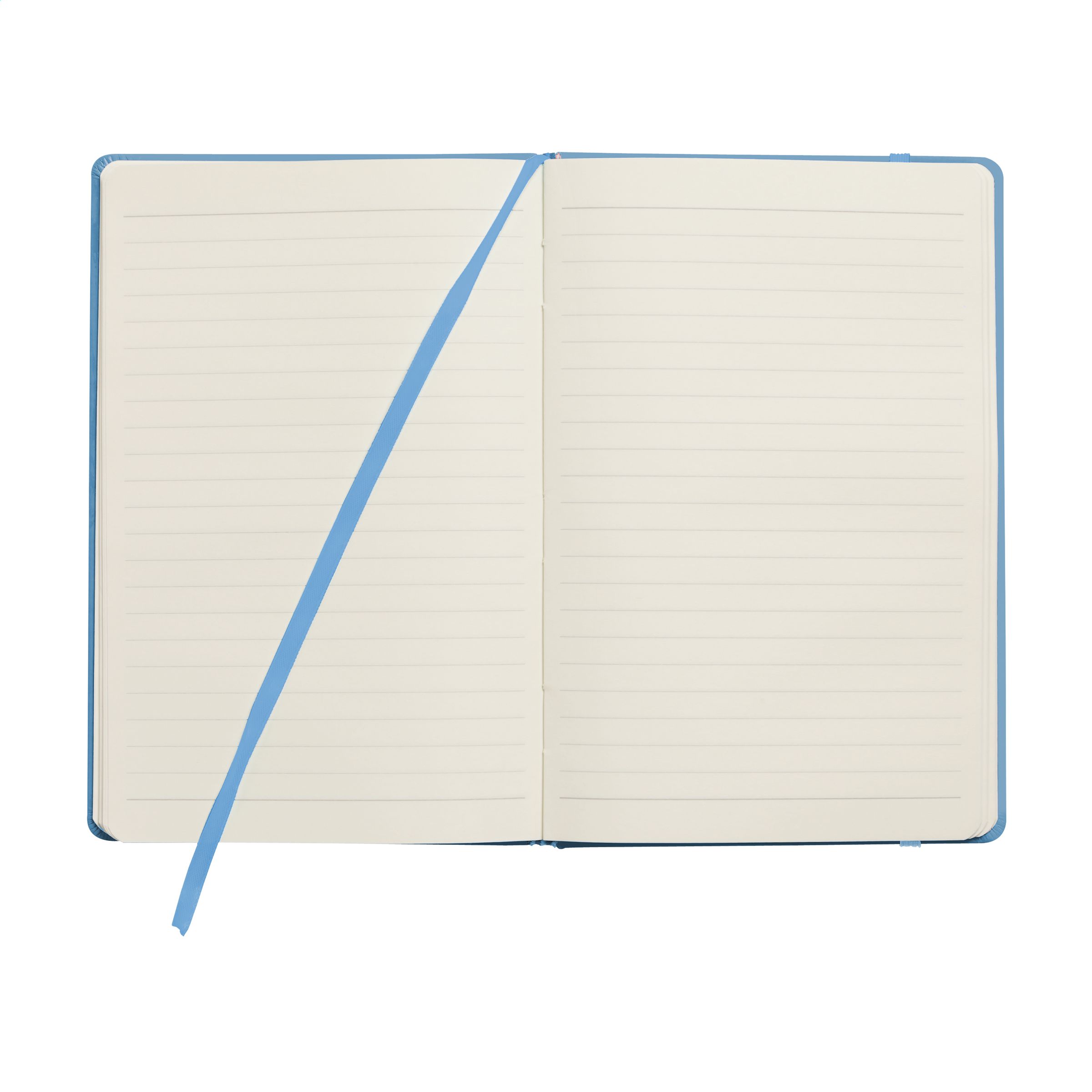 Notebook in A5 format with 96 pages cream coloured, lined paper (80 g/m²). With a perfect binding, hard cover, pocket, elastic fastener and silk ribbon.