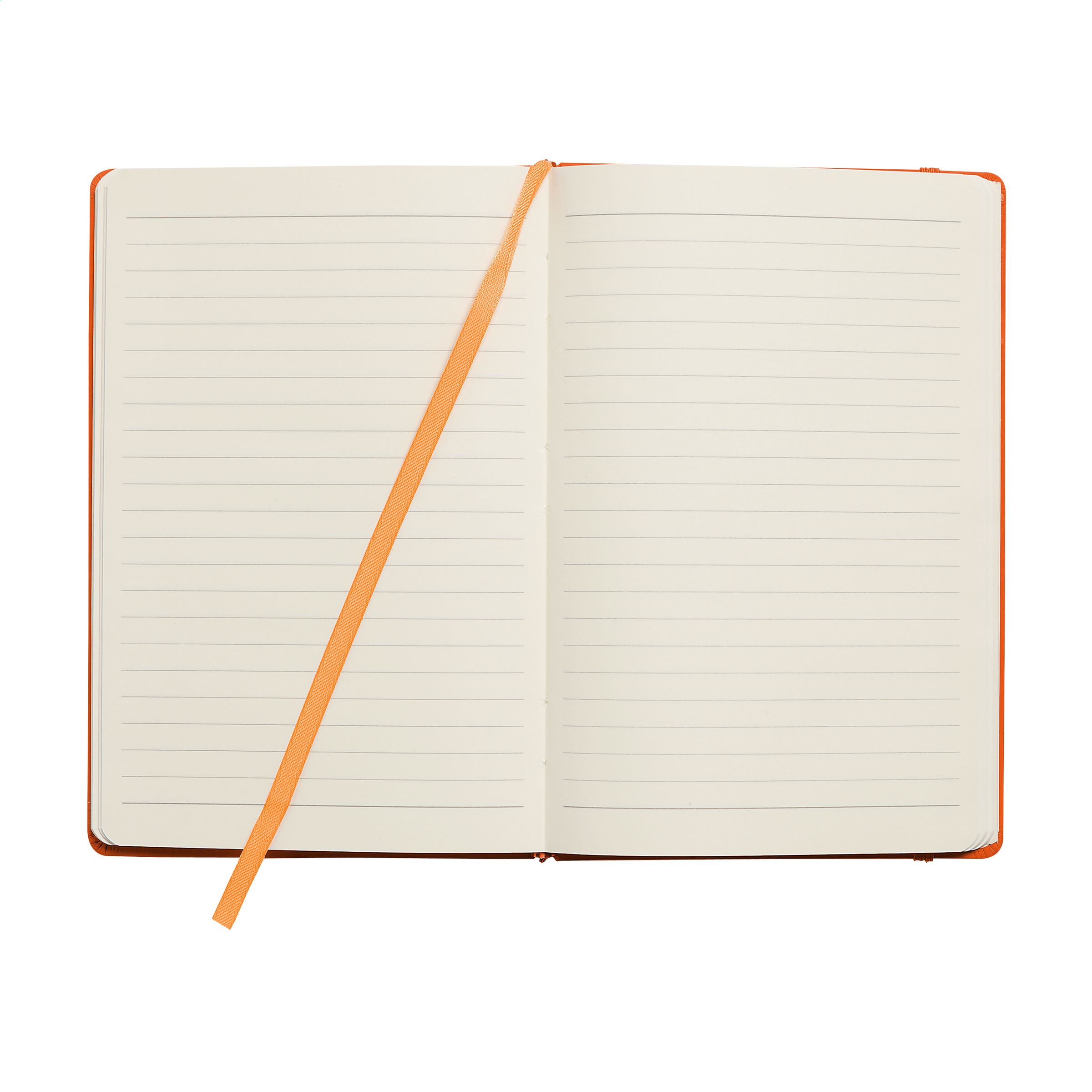Notebook in A5 format with 96 pages cream coloured, lined paper (80 g/m²). With a perfect binding, hard cover, pocket, elastic fastener and silk ribbon.