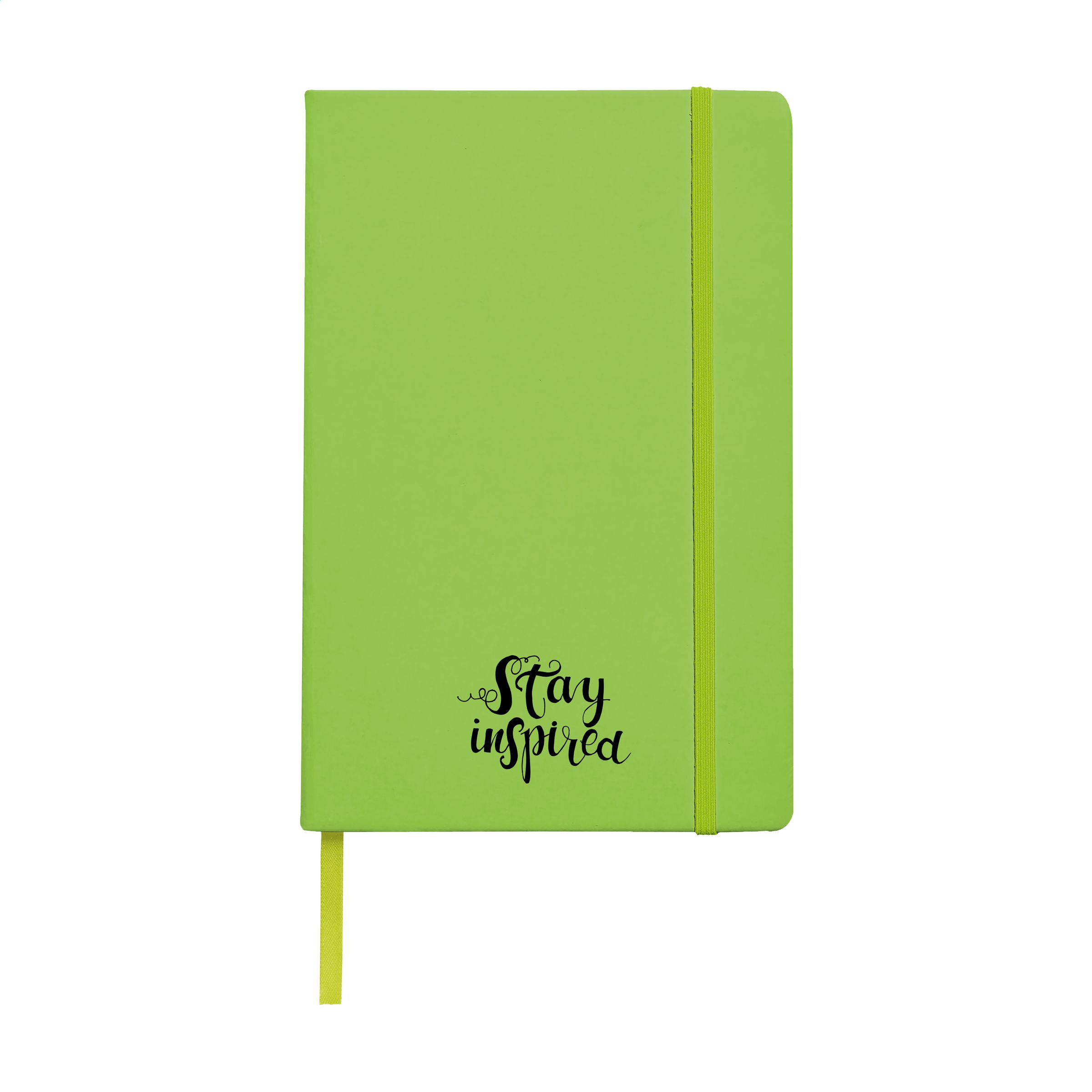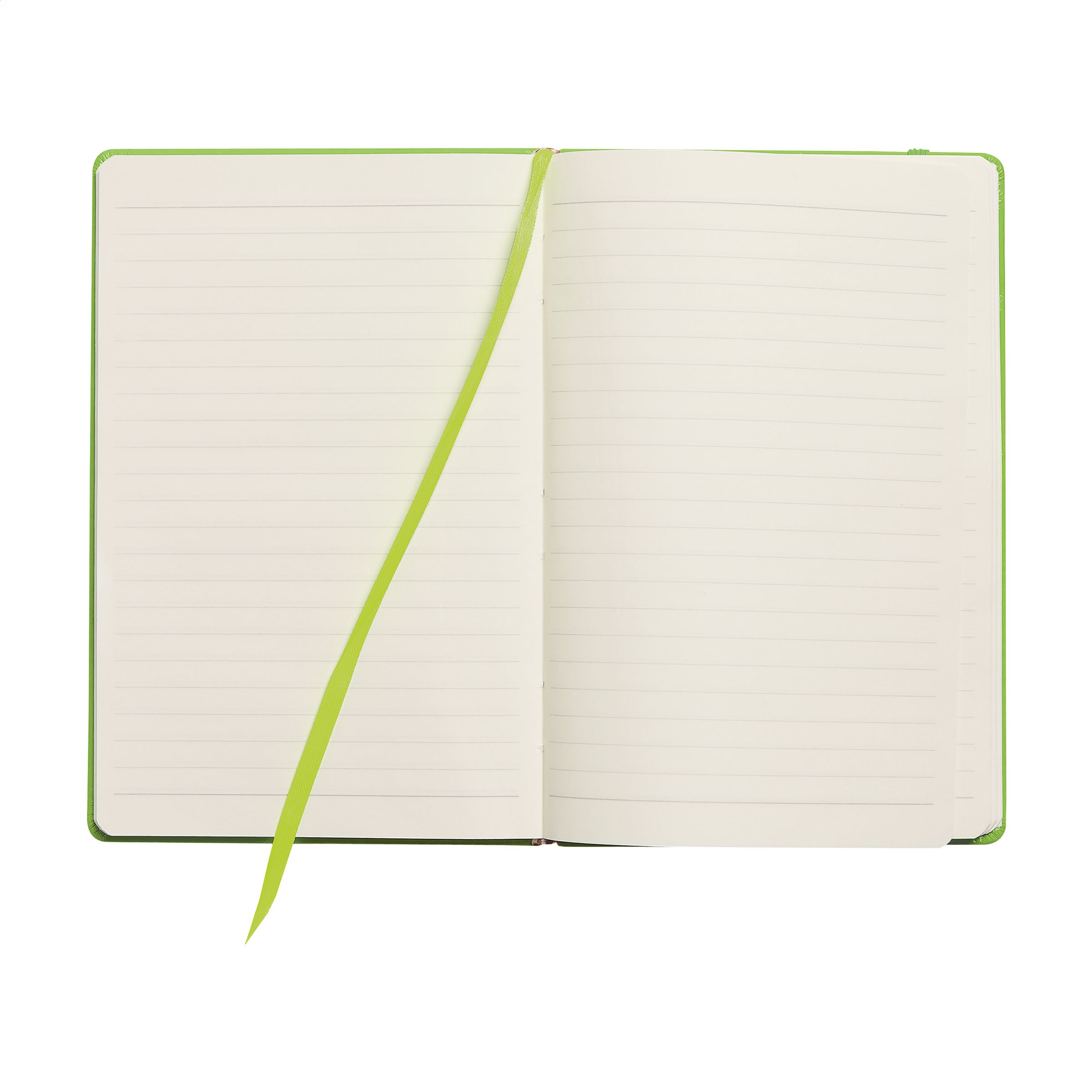 Notebook in A5 format with 96 pages cream coloured, lined paper (80 g/m²). With a perfect binding, hard cover, pocket, elastic fastener and silk ribbon.