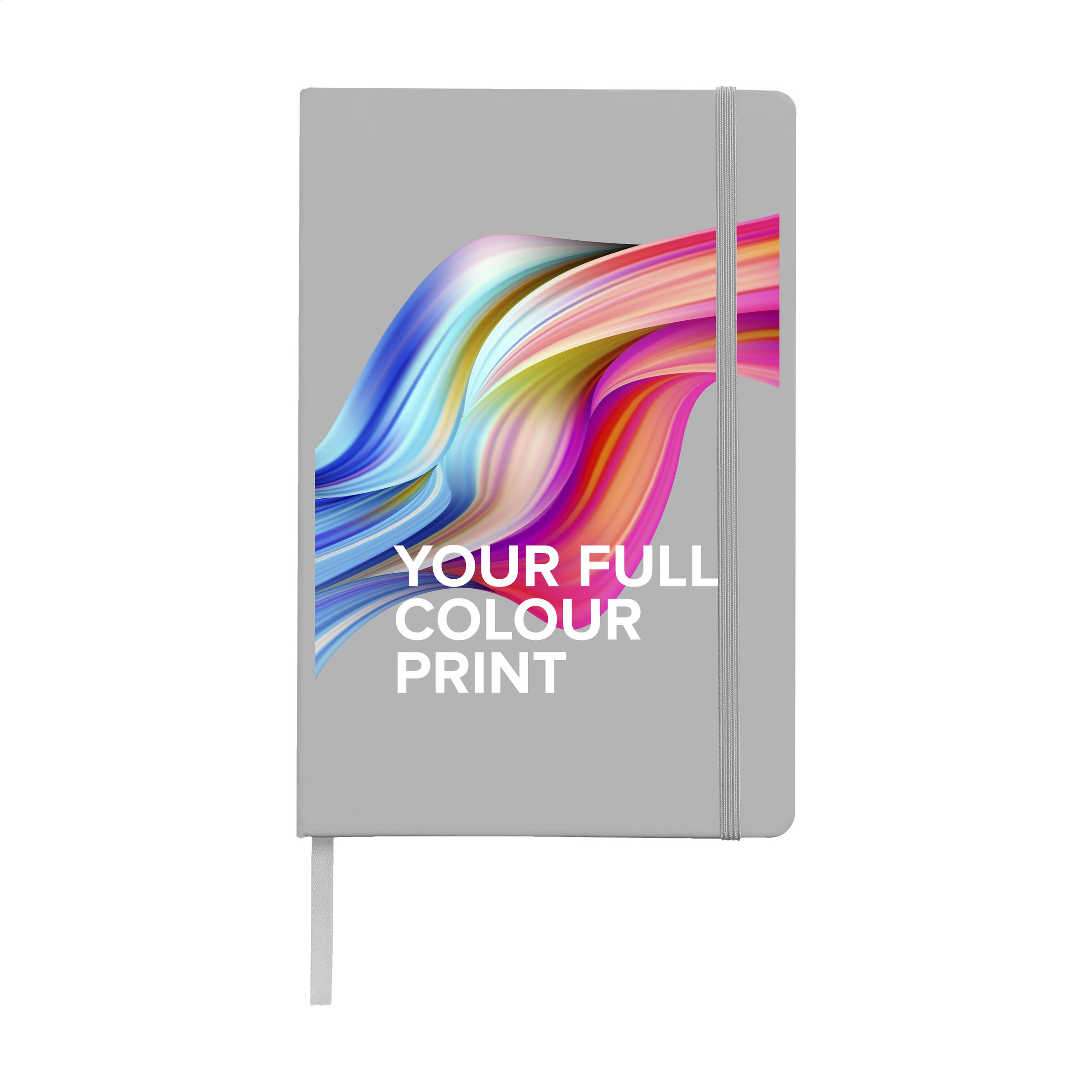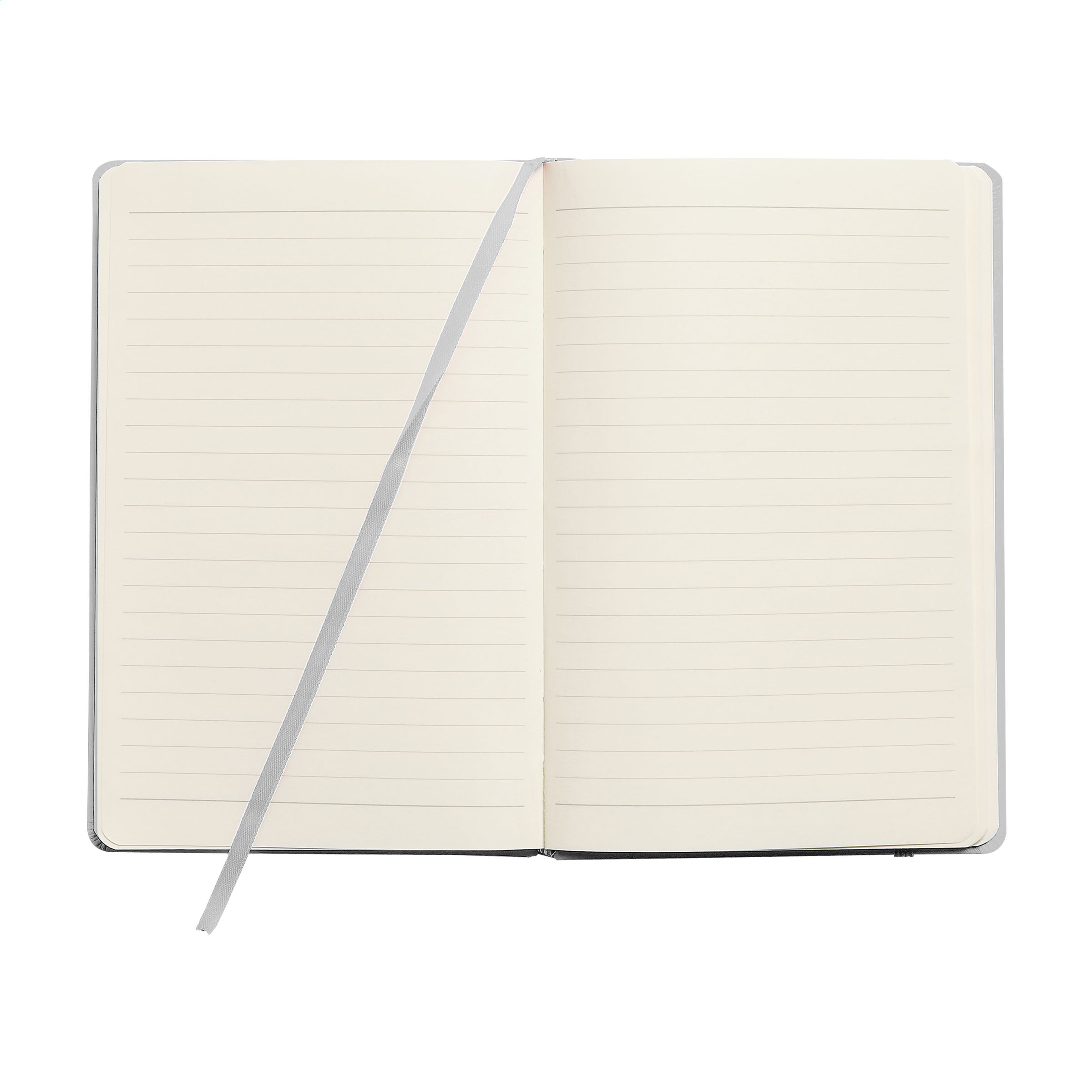 Notebook in A5 format with 96 pages cream coloured, lined paper (80 g/m²). With a perfect binding, hard cover, pocket, elastic fastener and silk ribbon.