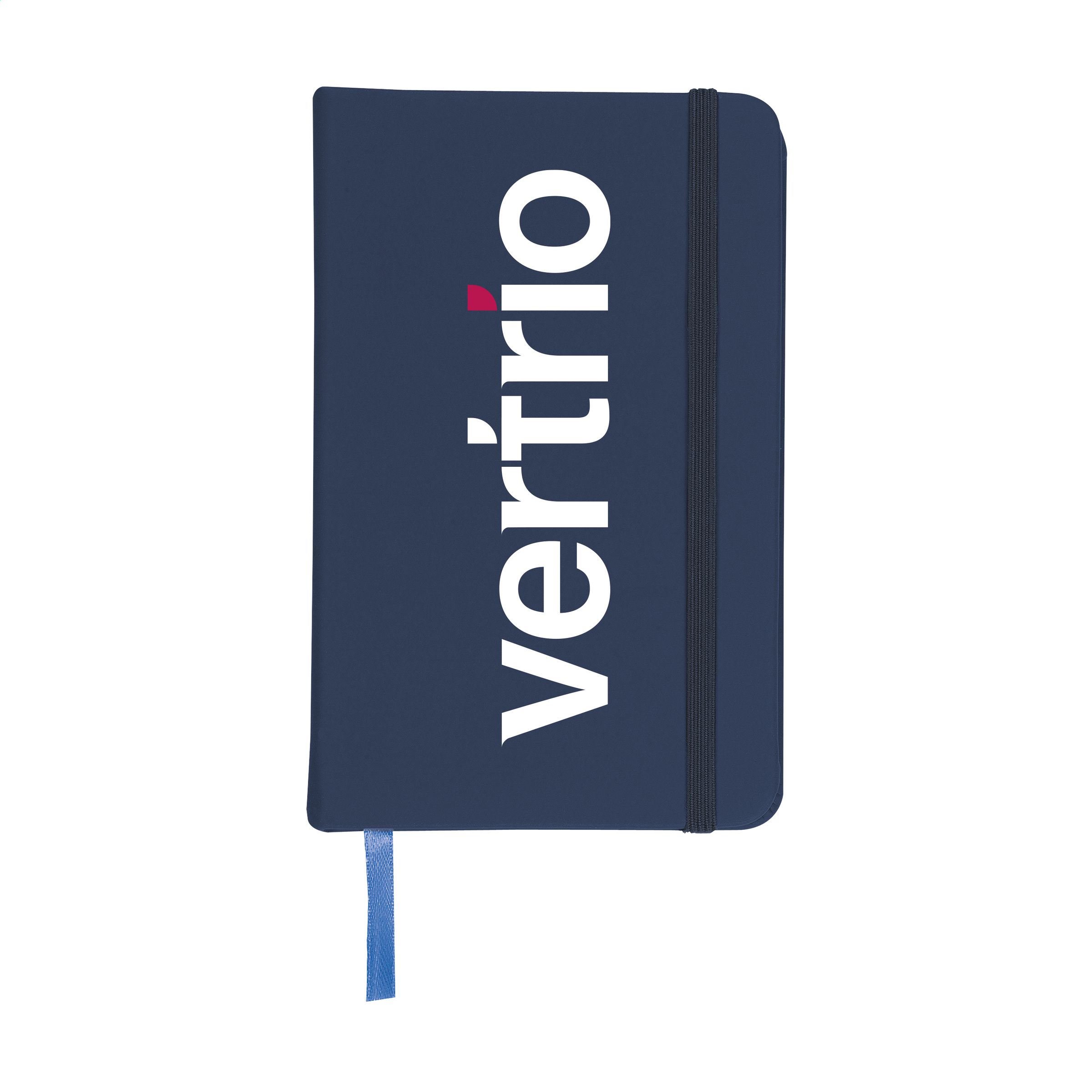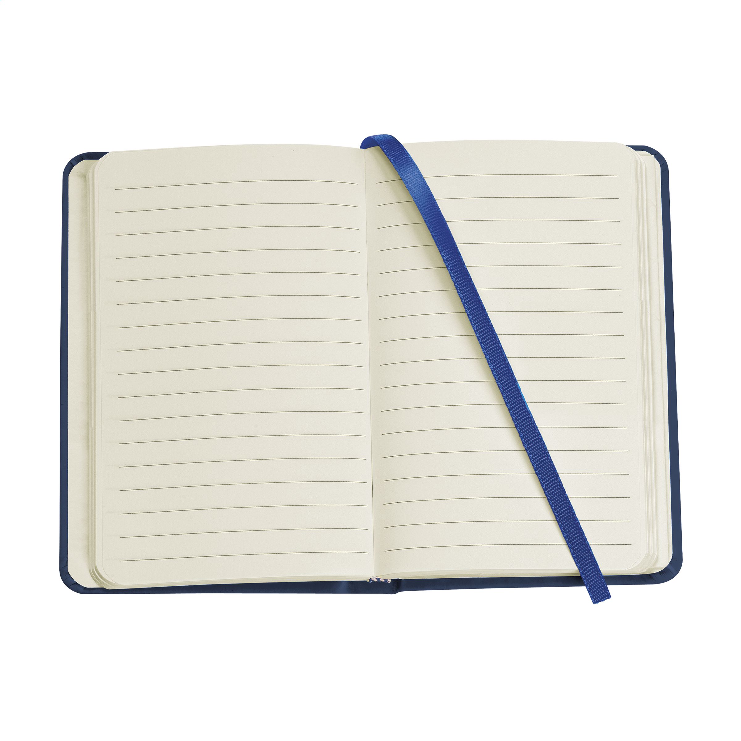 Compact notebook in A6 format with 96 pages of cream coloured, lined paper (80 g/m²). With a perfect binding, hard cover, pocket, elastic fastener and silk ribbon.
