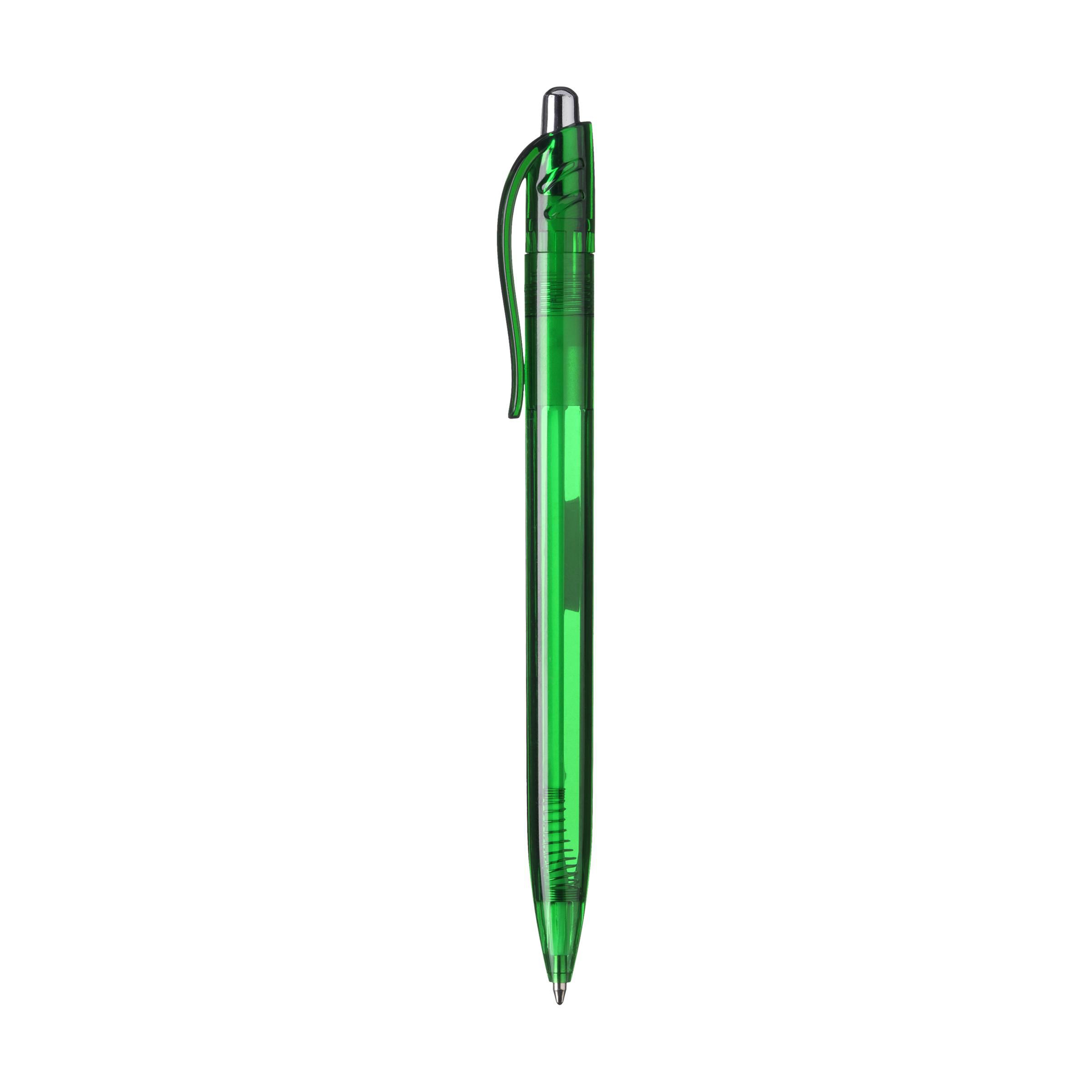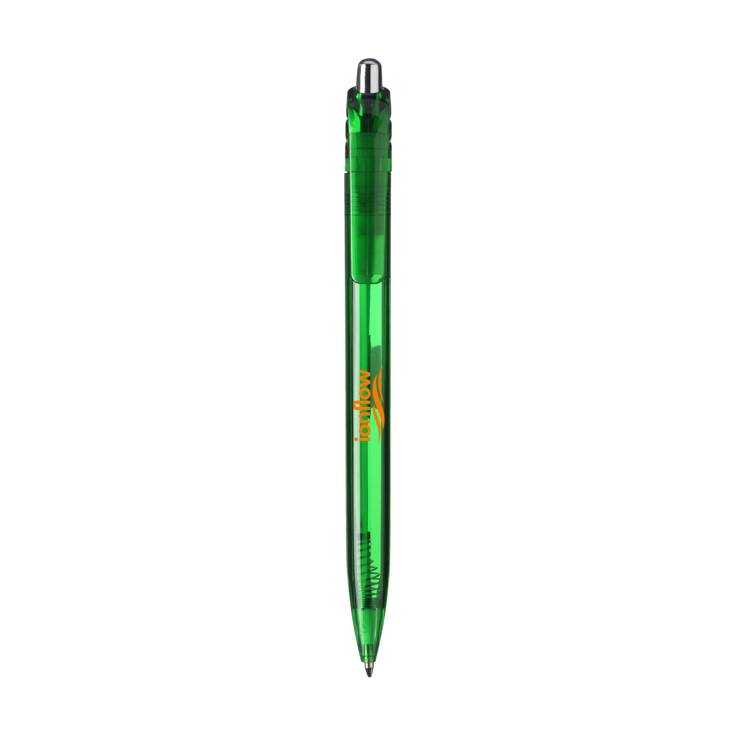 Blue ink, transparent coloured ballpoint pen with a stylish curved clip and silver coloured push button