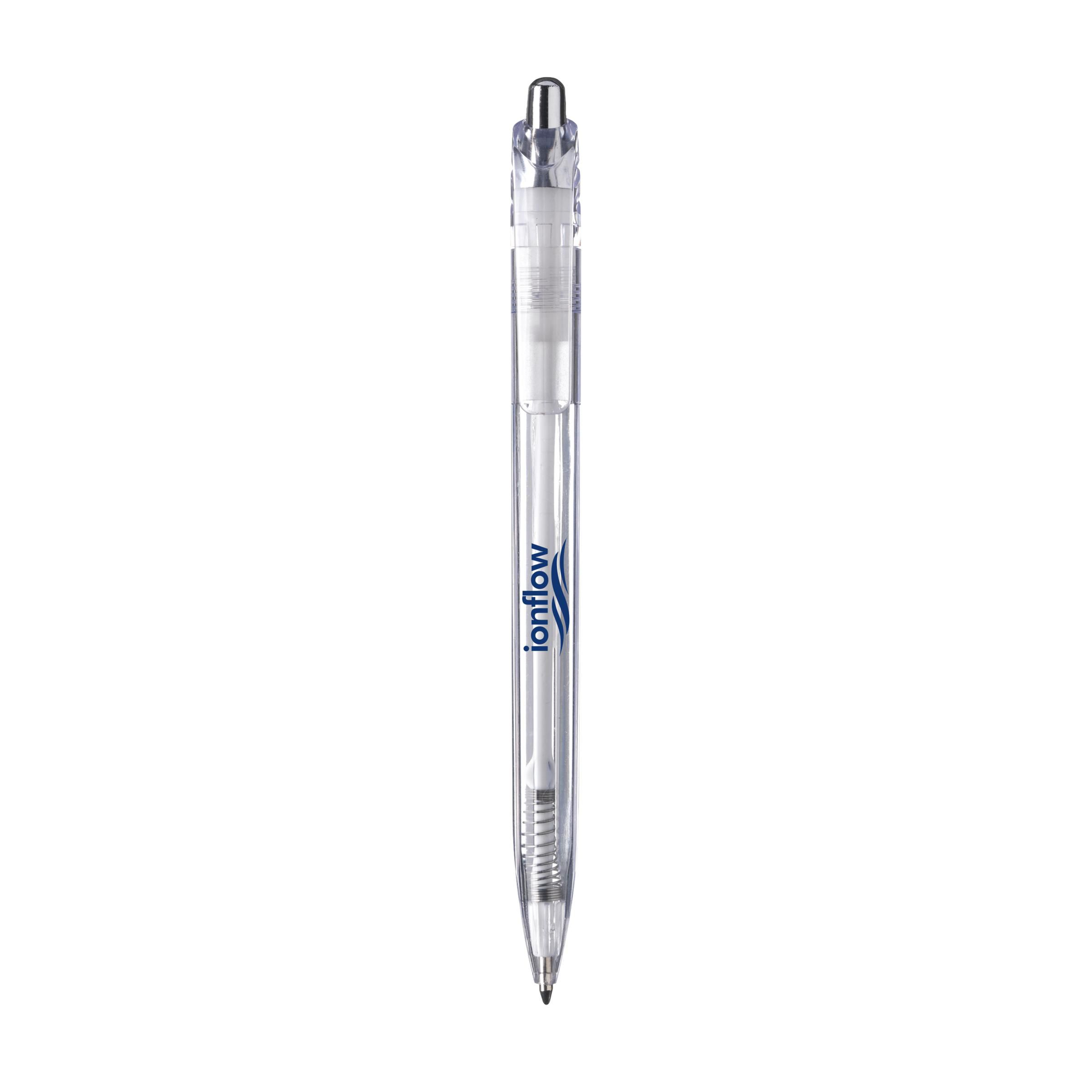 Blue ink, transparent coloured ballpoint pen with a stylish curved clip and silver coloured push button